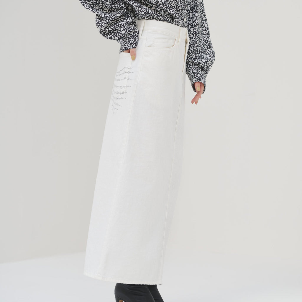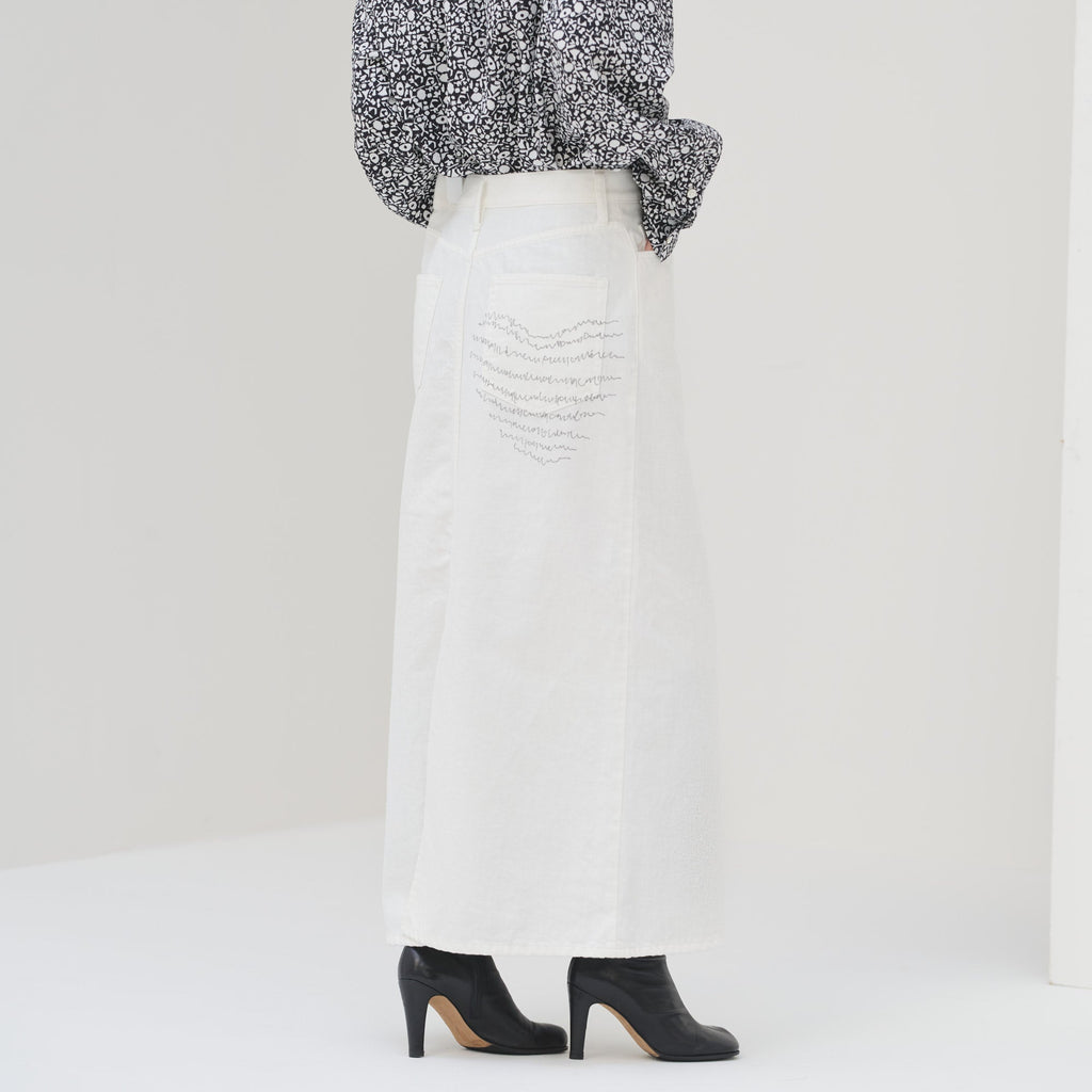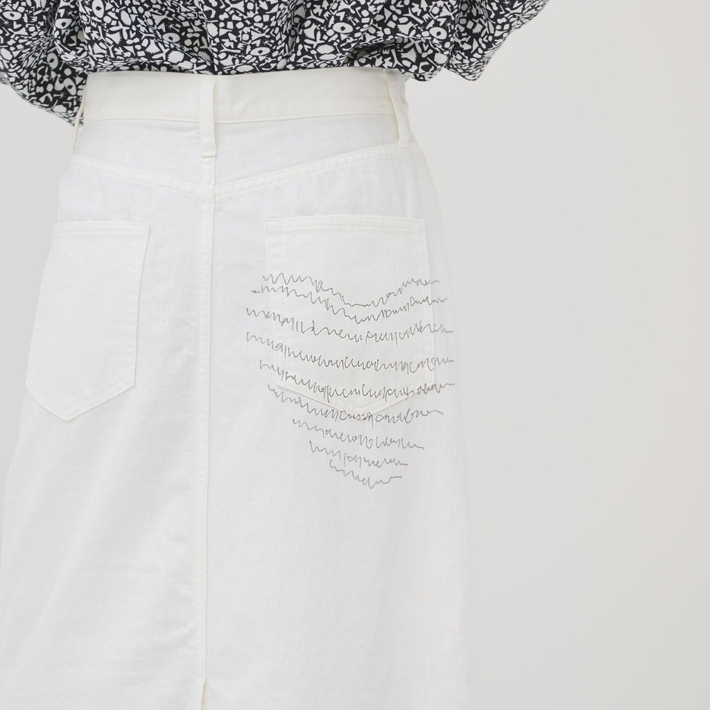 さりげなく異彩をまとう人気のデニムがスカートに。ヒップポケットにプリントしたmarinaの文字アートが不思議な魅力を放つ、はじめてアートをまとう方にもおすすめのスカートです。裾に向けてやや広がるナローシルエットですっきりと着こなせます。