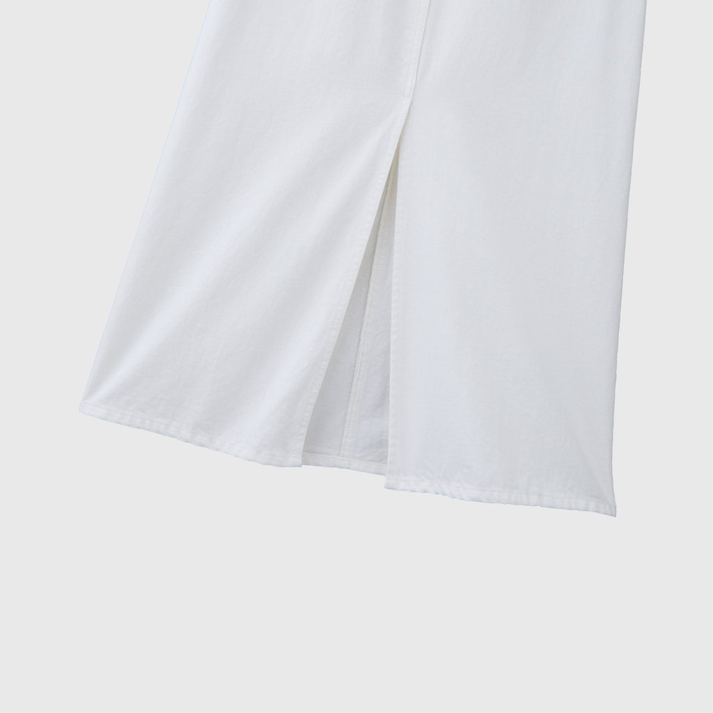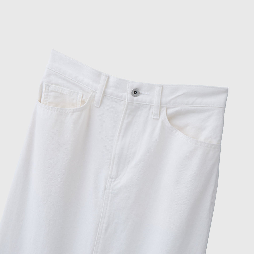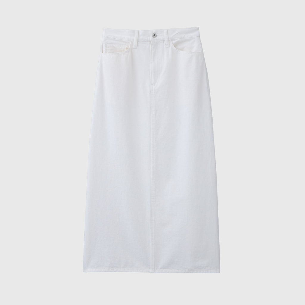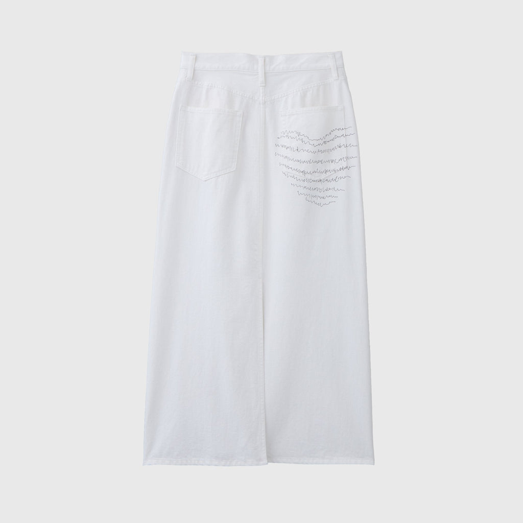 さりげなく異彩をまとう人気のデニムがスカートに。ヒップポケットにプリントしたmarinaの文字アートが不思議な魅力を放つ、はじめてアートをまとう方にもおすすめのスカートです。裾に向けてやや広がるナローシルエットですっきりと着こなせます。