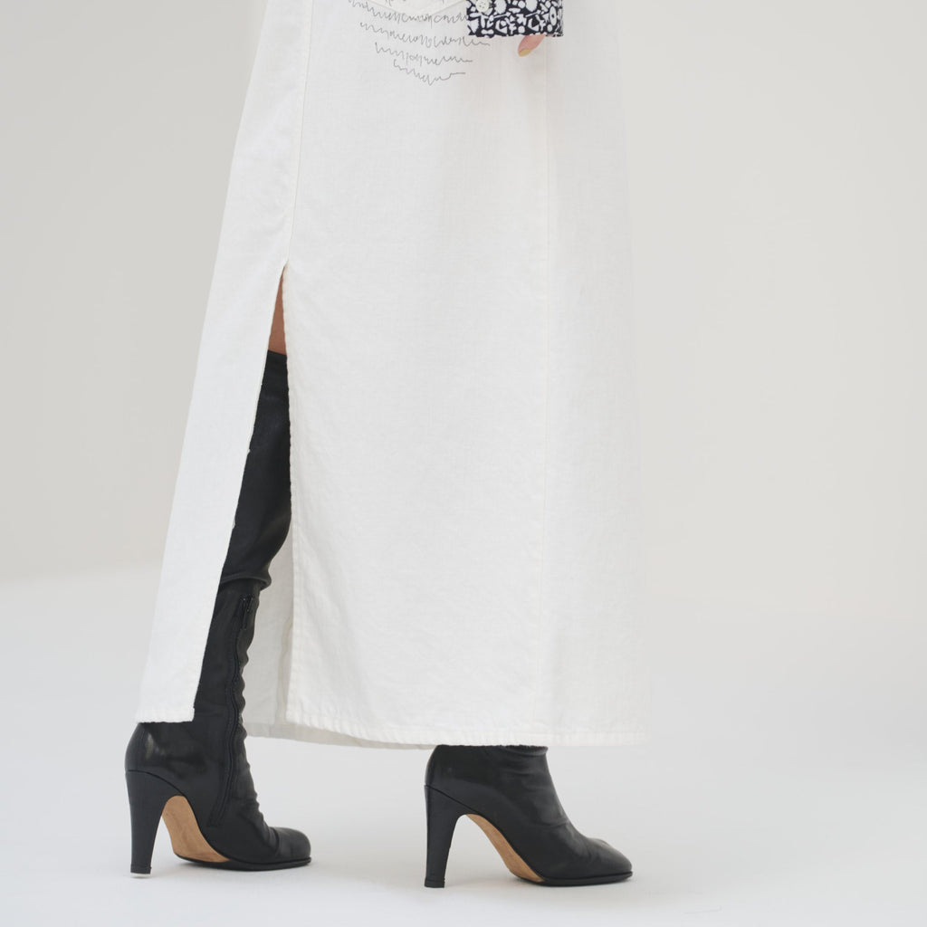 アートがワンポイントで入ったデザインなので、さり気なく異彩をまとうことができるデニムパンツ。モノトーンを基調としたアートで、合わせるトップスを選びません。履き心地のよい柔らかなデニム生地を使用し、バックスリットを深めにいれることで足さばきも良いスカートに仕上げました。