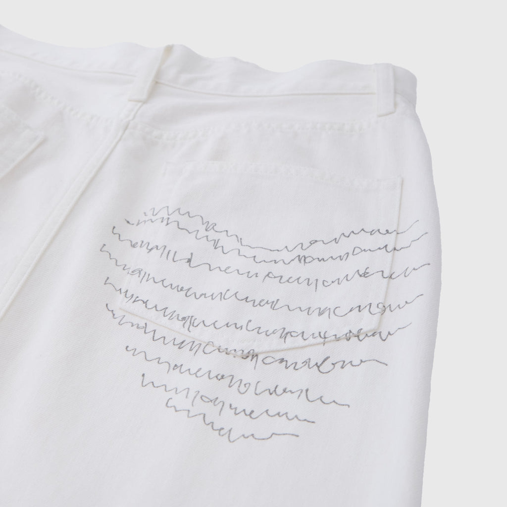 ヒップポケットには、ハートの形に描かれた繊細な文字が愛らしいmarinaの「heart-mm2024」をプリント。トップスを選ばないさりげなさと、アートが放つ存在感が共存する絶妙なサイズ感にこだわりました。