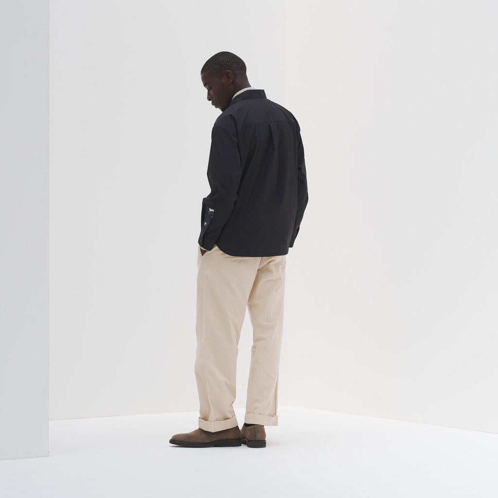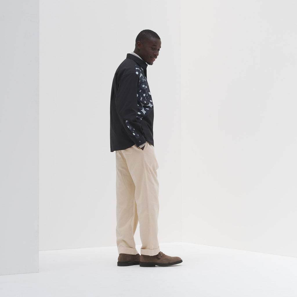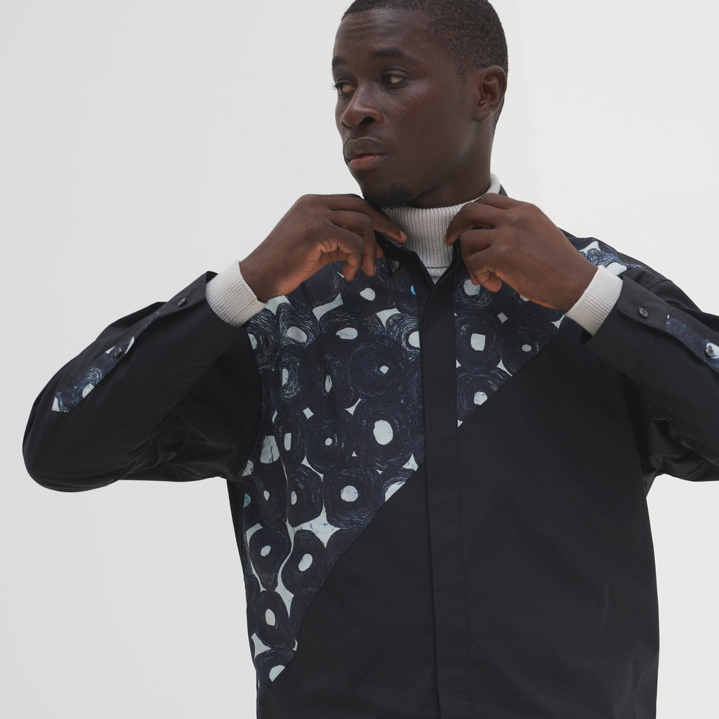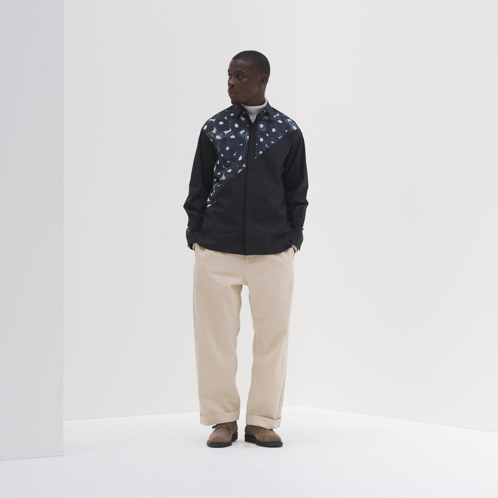 あえて斜めに切り替えを入れることで、スタイリッシュにアートの存在感を引き出しました。デイリーシーンでもほどよくアートが主張する、遊び心あふれるスタイリングが楽しめます。一枚ではもちろん、Tシャツをインナーに羽織りとしてもご使用いただけます。