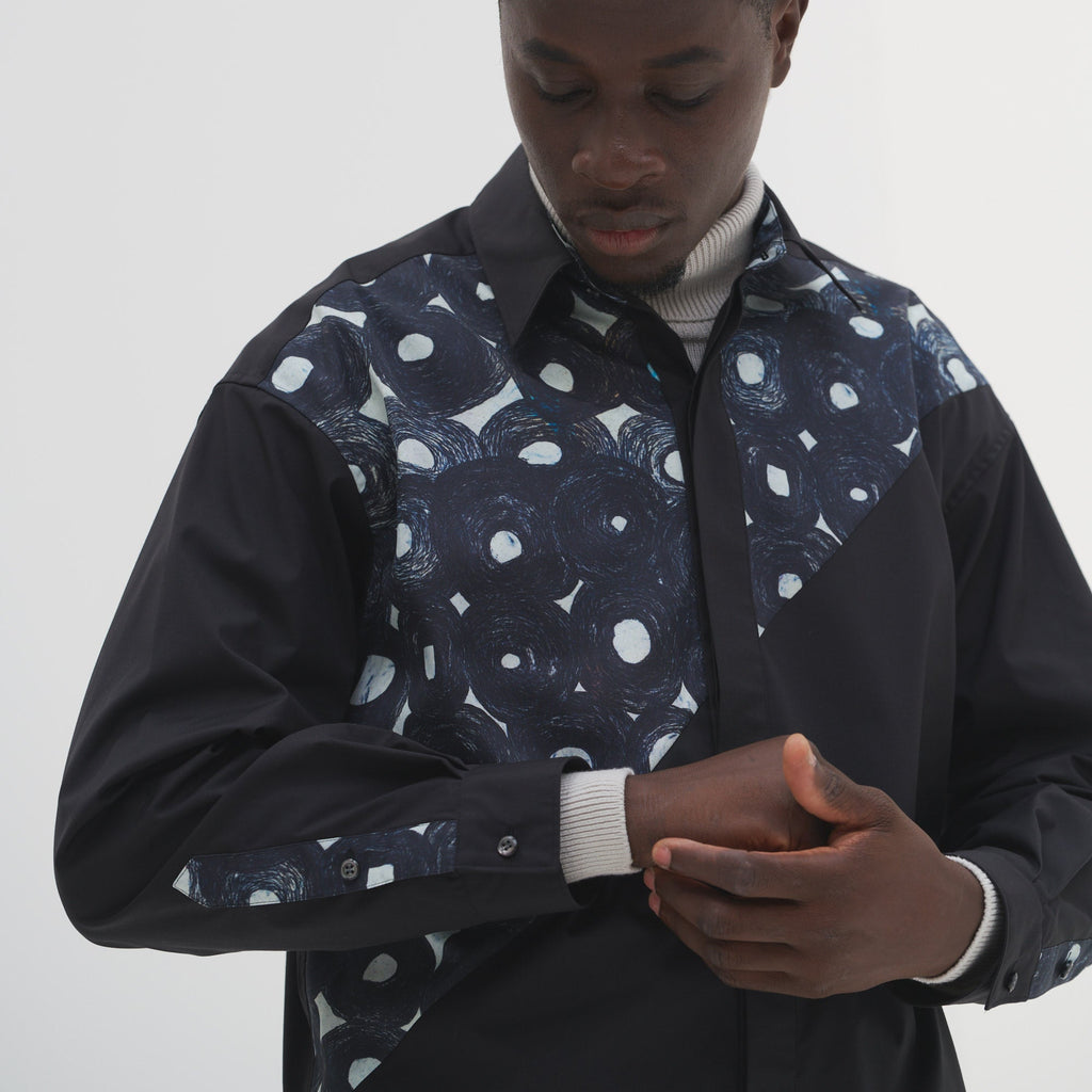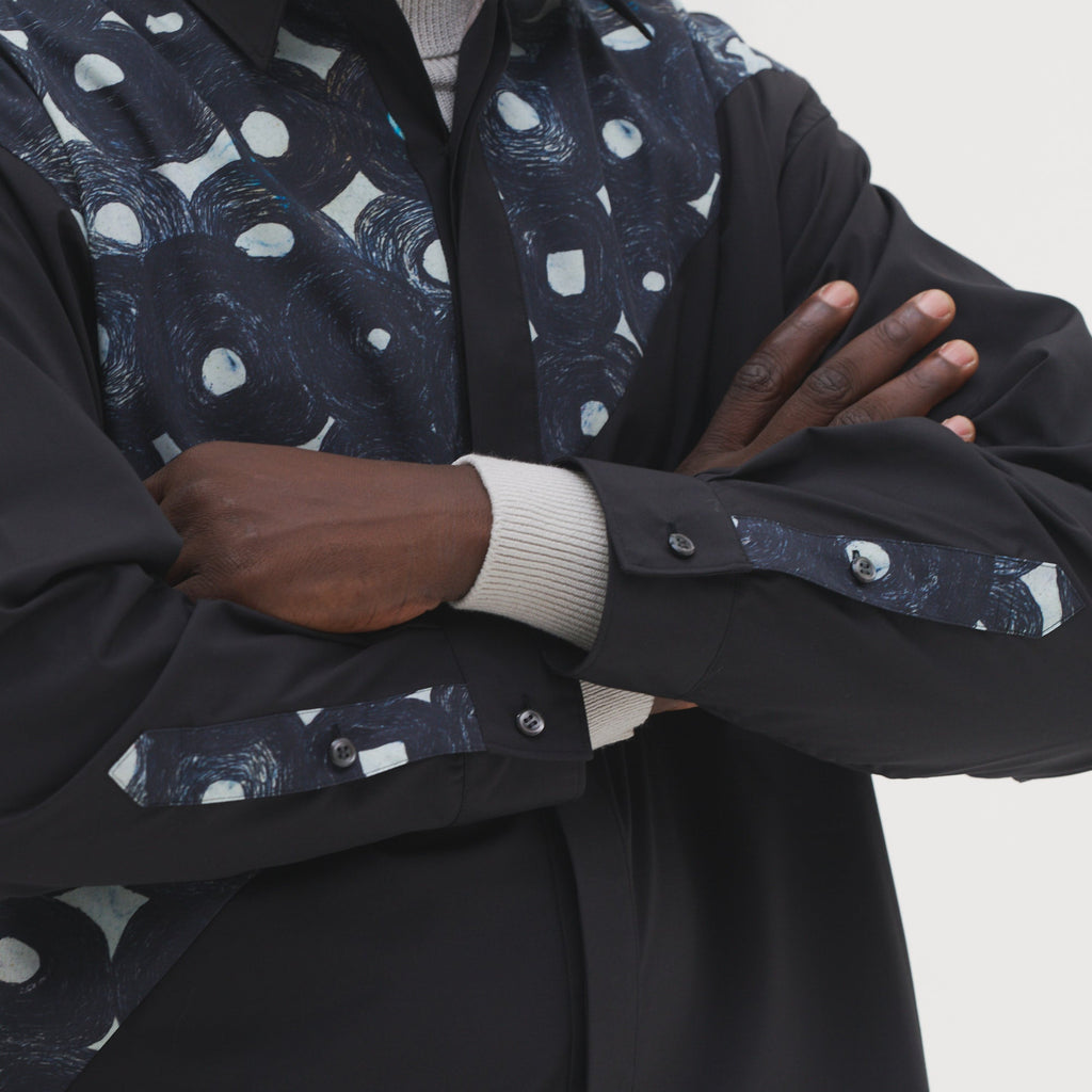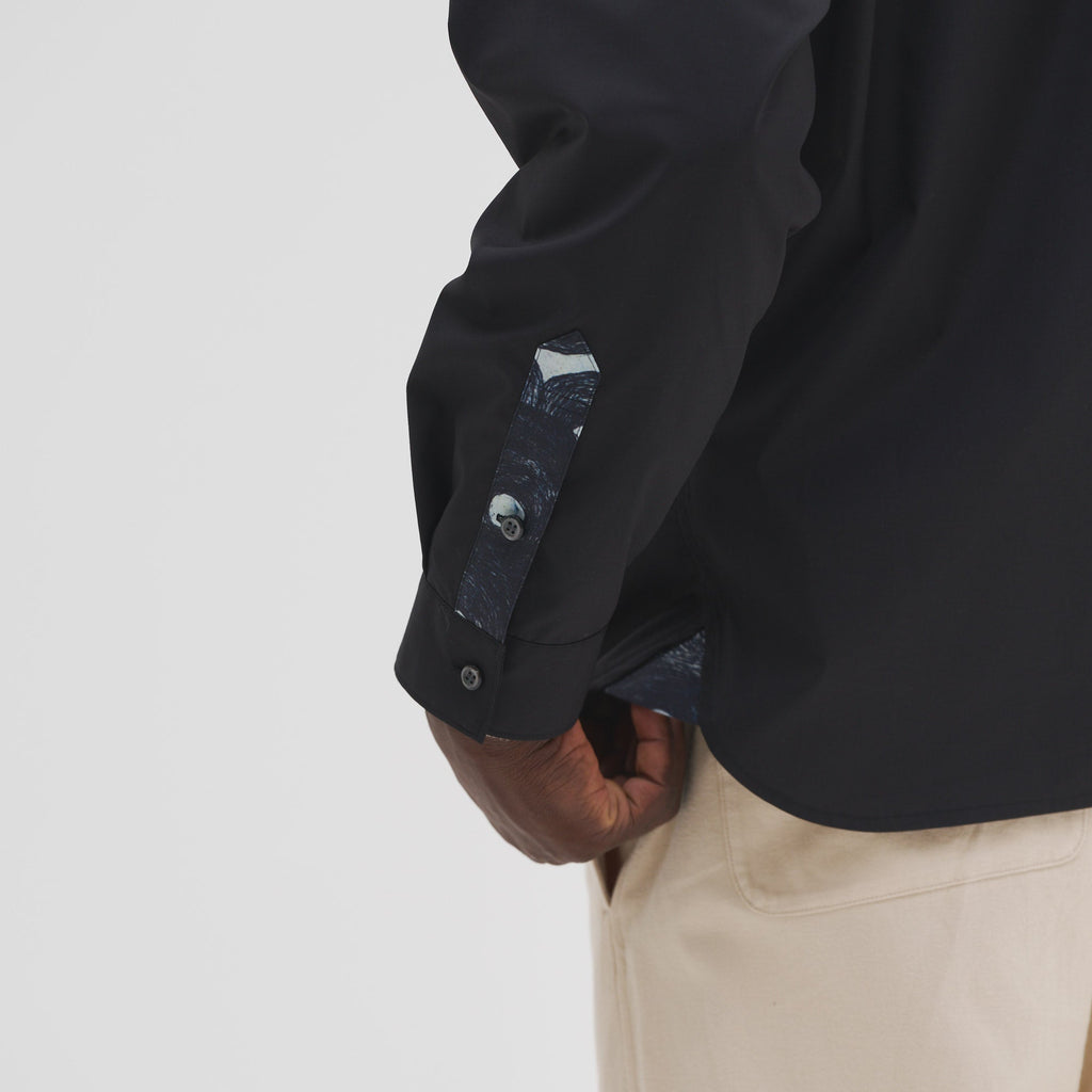 ベーシックなシルエットのシャツを、躍動感あふれるアートで特別な一着に。ホワイトとブラックの無地の生地と、異彩のアートのコントラストが、印象的なスタイリングを叶えます。シワになりづらいイージーケア素材を使用し、UVカット・接触冷感機能付きでロングシーズン着られる一着です。