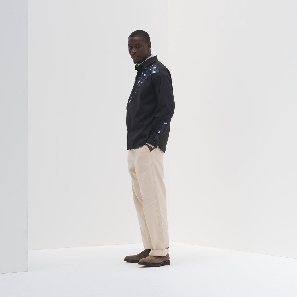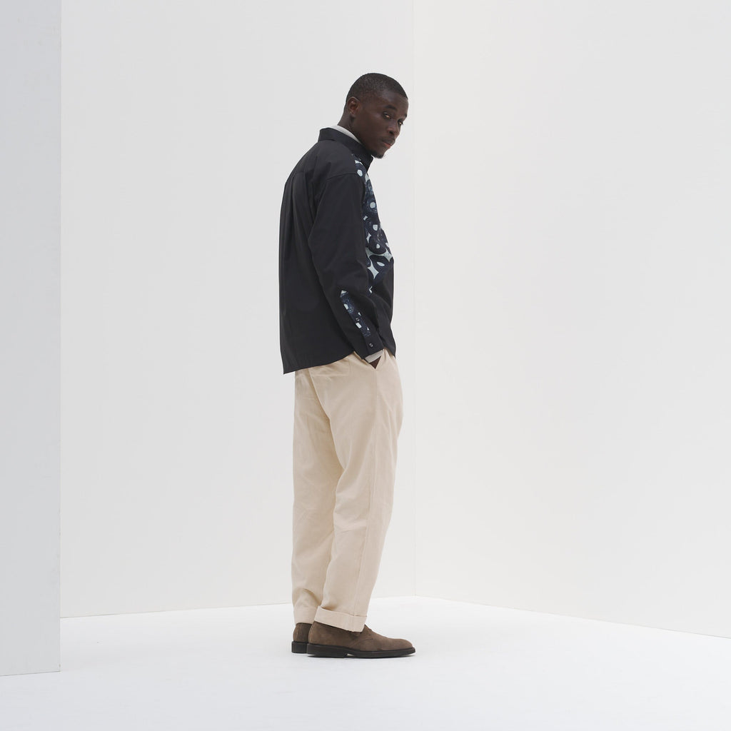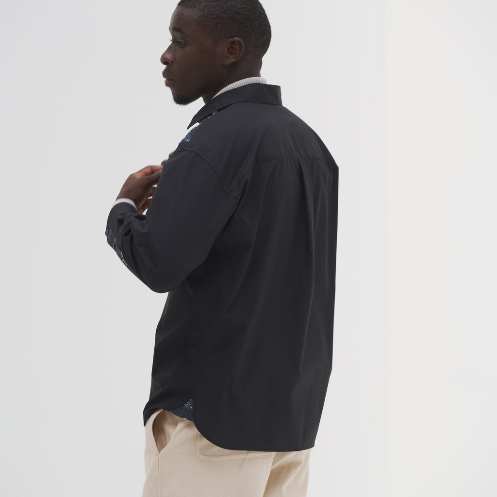ベーシックなシルエットのシャツを、躍動感あふれるアートで特別な一着に。ホワイトとブラックの無地の生地と、異彩のアートのコントラストが、印象的なスタイリングを叶えます。シワになりづらいイージーケア素材を使用し、UVカット・接触冷感機能付きでロングシーズン着られる一着です。