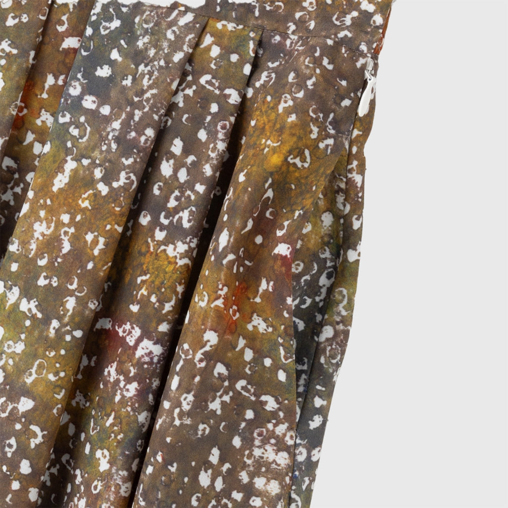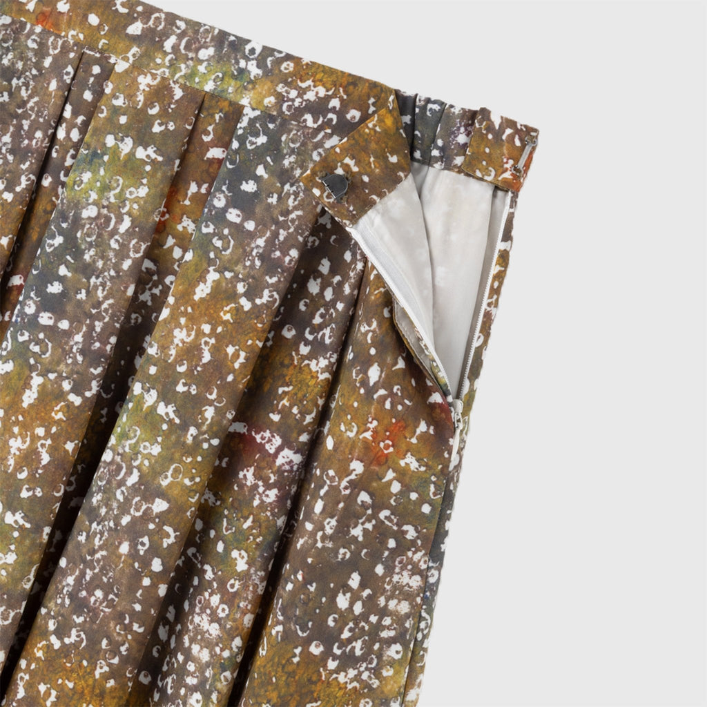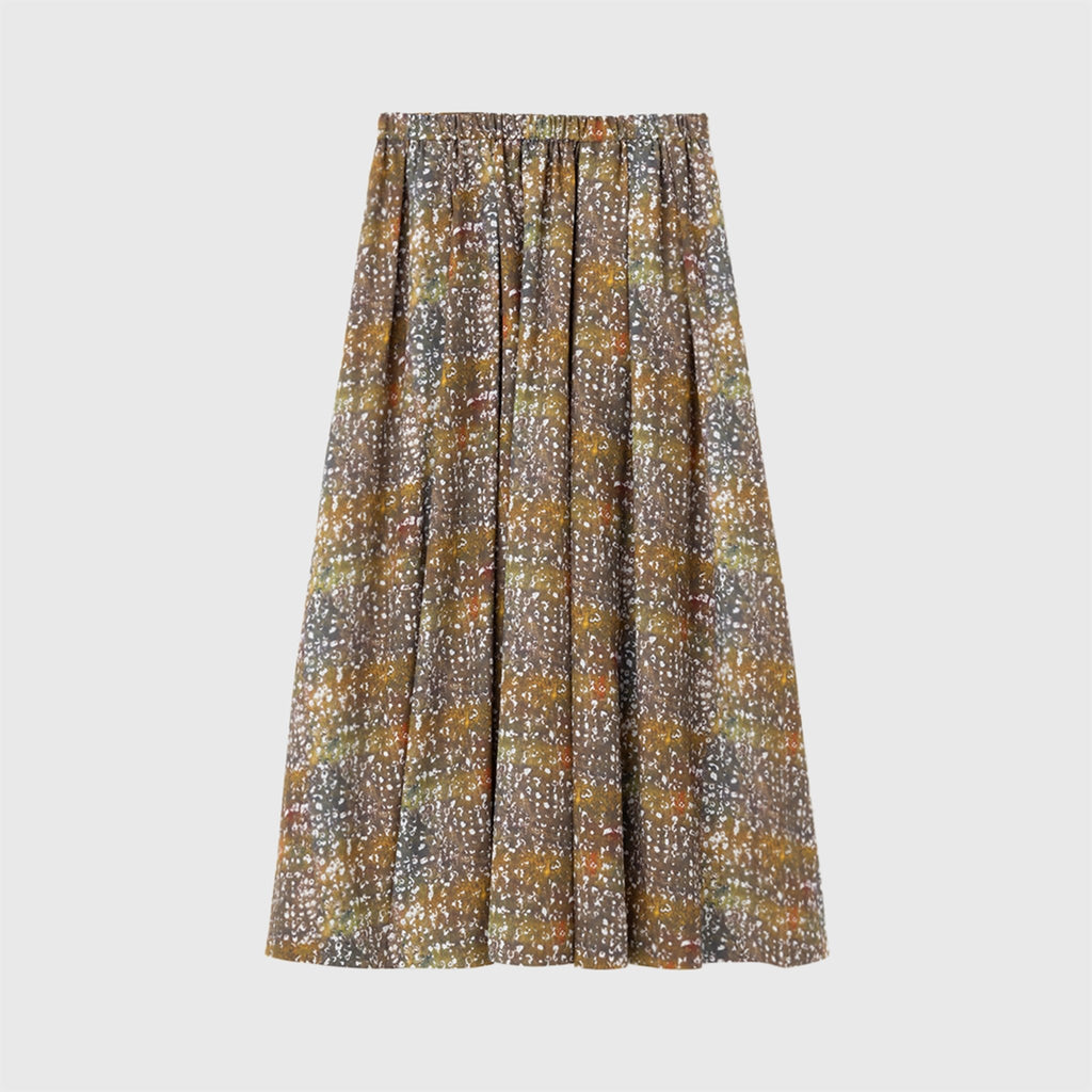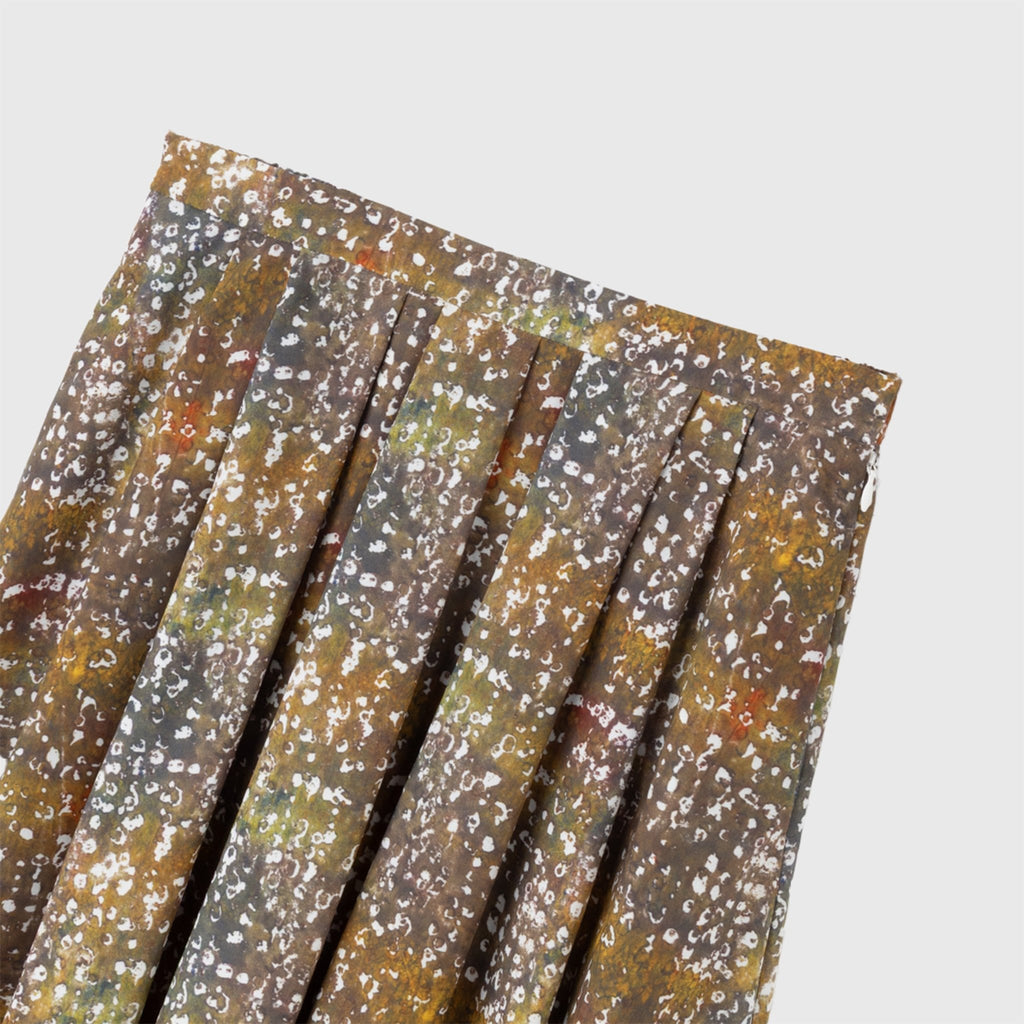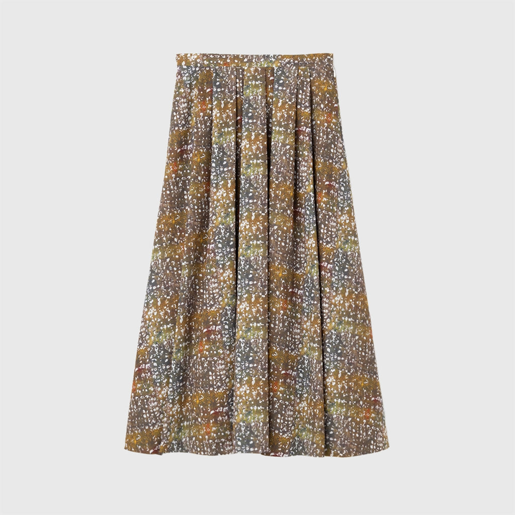 ご好評いただいたフレアスカートが、ハリ感のある生地にアップデートして登場。ランダムタックで軽やかに広がるアートのようなシルエットはそのままに、ウエストゴムで履き心地の良さにもこだわりました。