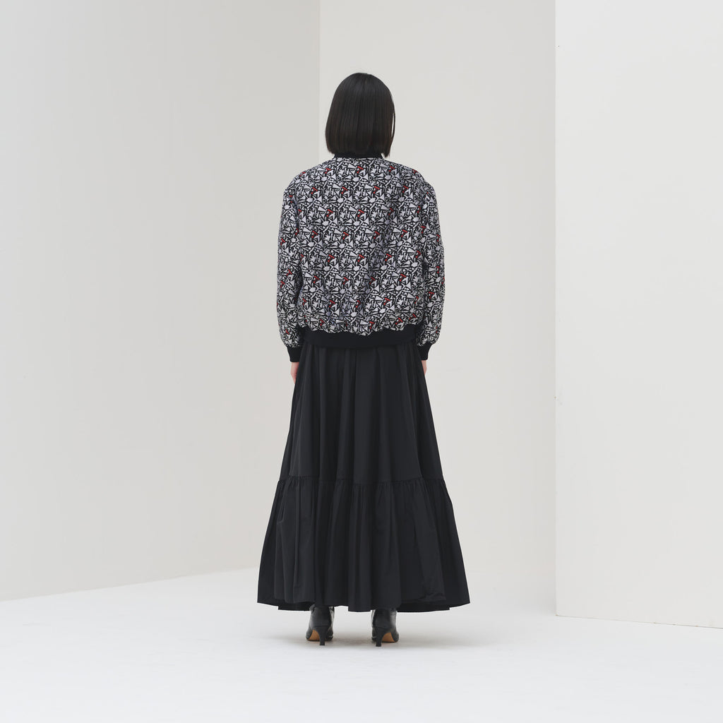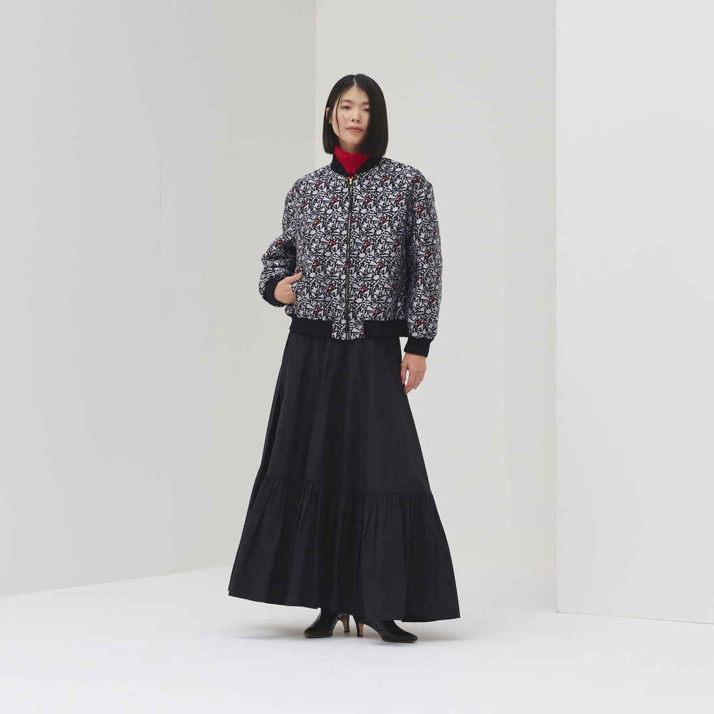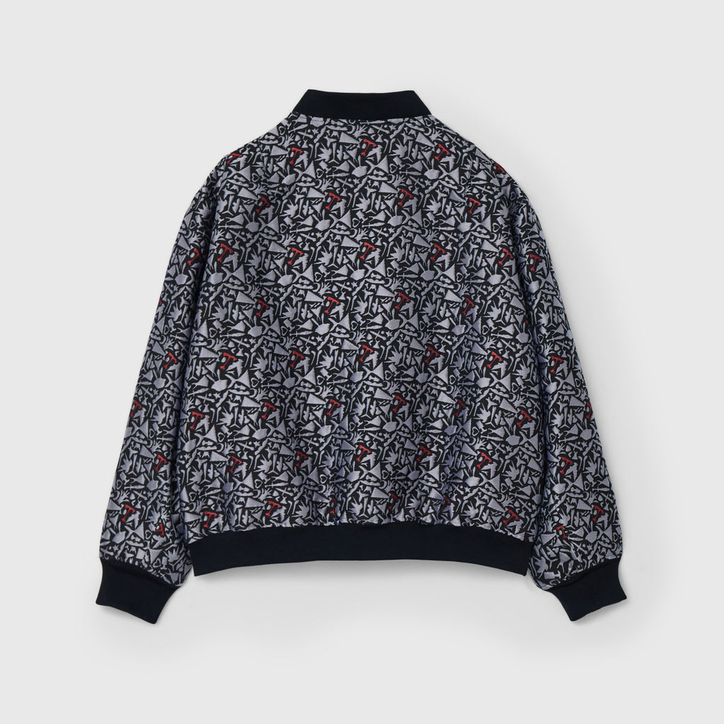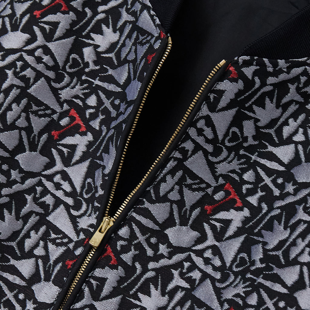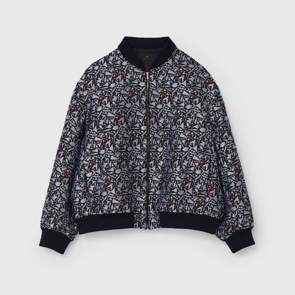 立体的なジャカード織りが特徴的なスタンドカラーブルゾン。輪島 楓(Kaede Wajima)の切り絵作品を、織りで表現することで新たな魅力を引き出しました。同じアートを起用したジャカード素材のパンツ・スカートとのセットアップも可能です。性別問わず着られるユニセックスタイプ。