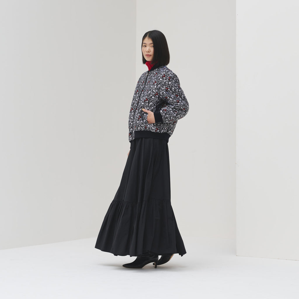 同じアートを起用した同素材のジャカードパンツ、ジャカードスカート、付け襟とのセットアップスタイルもおすすめです