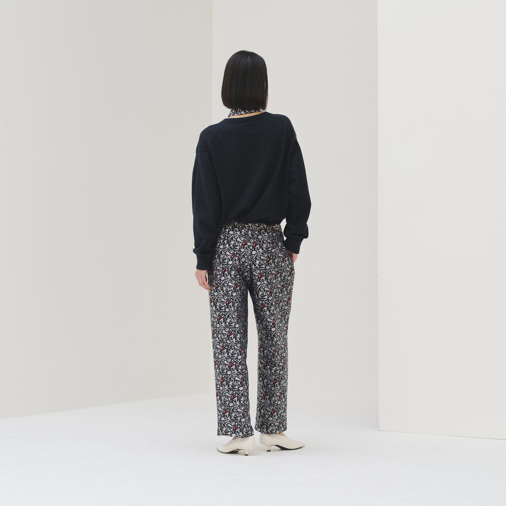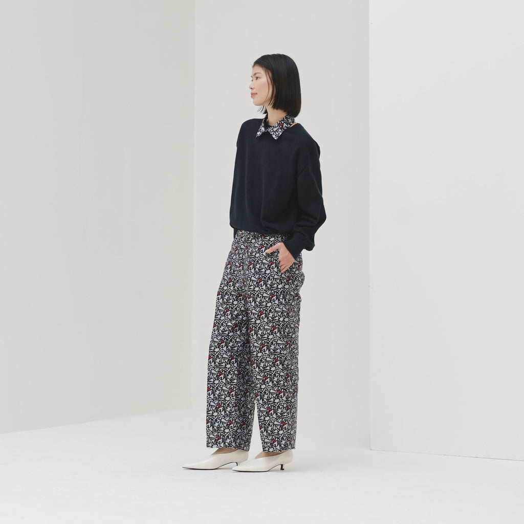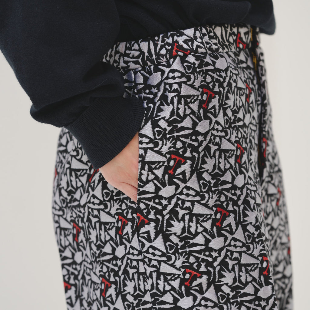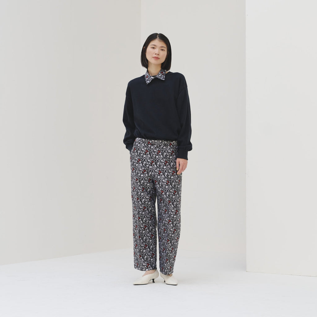 上品な立体感がスタイリングの主役になる、ジャカード織りのパンツ。輪島 楓(Kaede Wajima)の切り絵作品を緻密な織りで表現することで、新たな魅力を引き出しました。ウエストはゴム入りで、着心地と美しい立ち姿を兼ね備えています。同じアートを起用したジャカード素材のブルゾンとのセットアップも可能です。