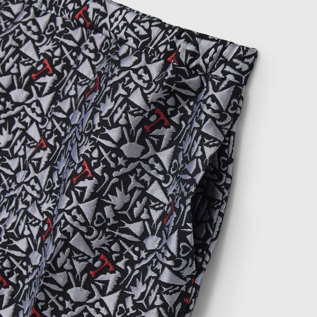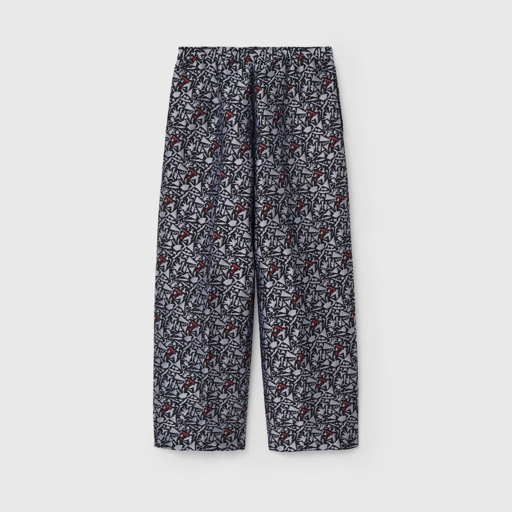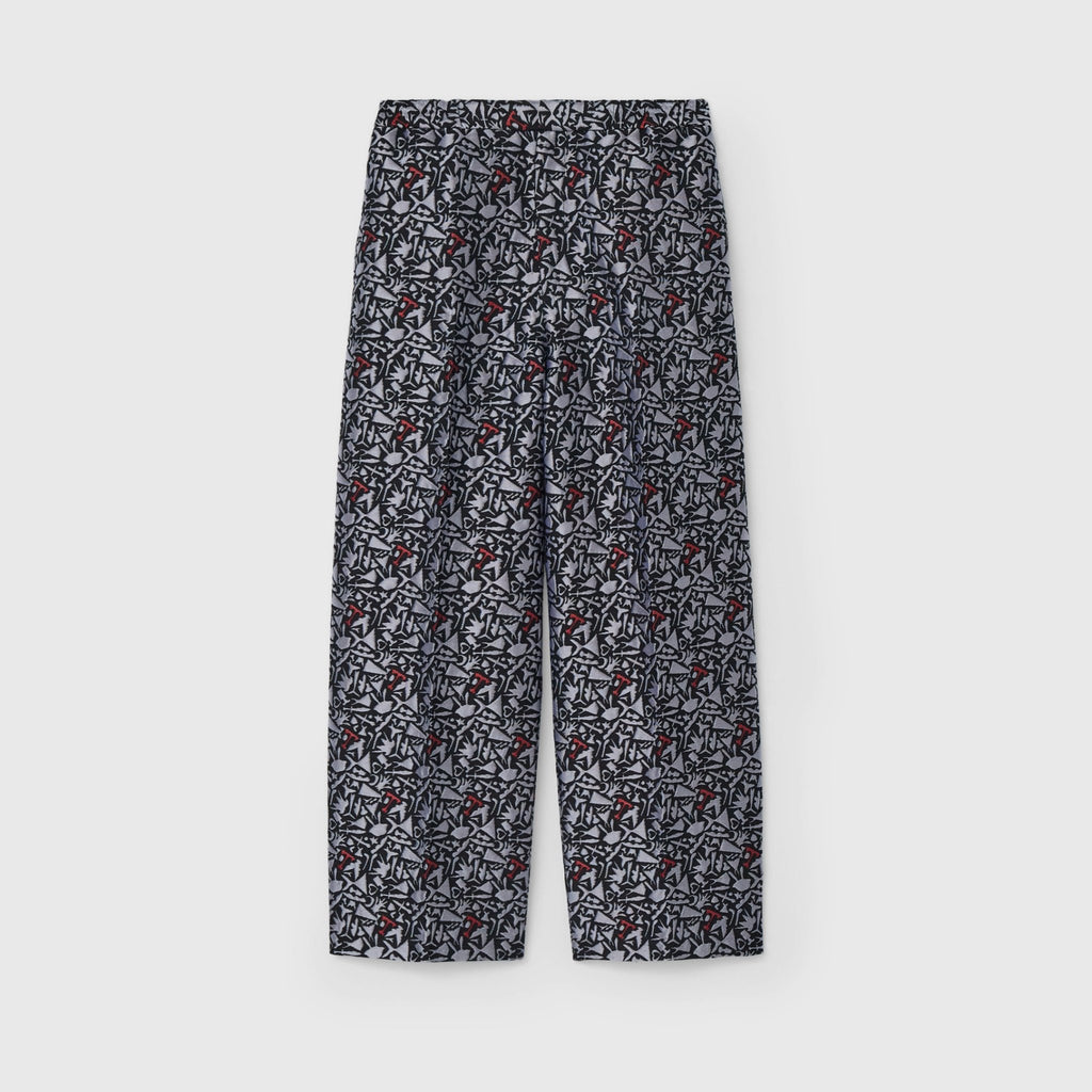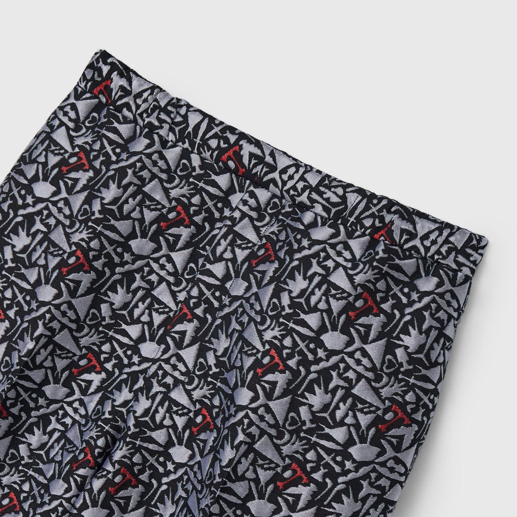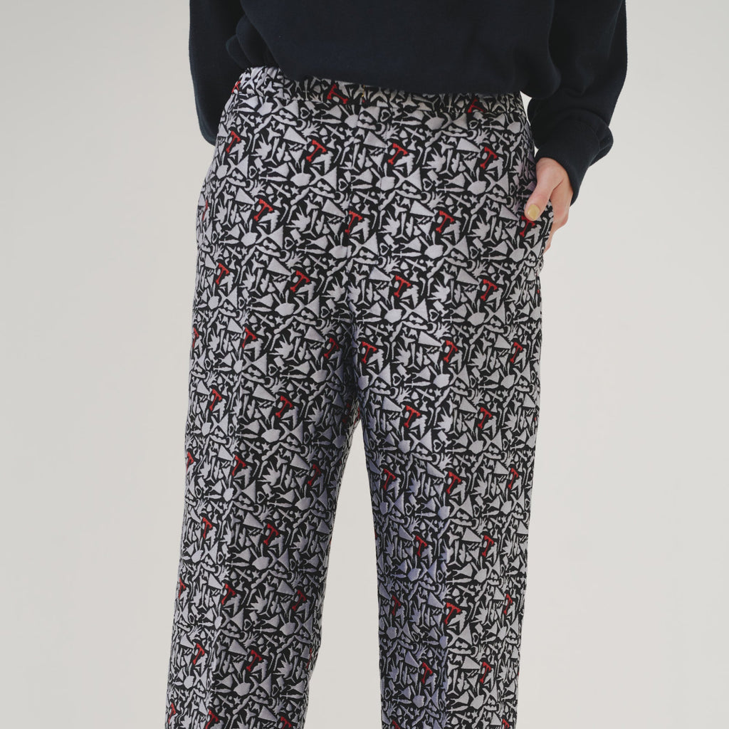 上品な立体感がスタイリングの主役になる、ジャカード織りのパンツ。輪島 楓(Kaede Wajima)の切り絵作品を緻密な織りで表現することで、新たな魅力を引き出しました。ウエストはゴム入りで、着心地と美しい立ち姿を兼ね備えています。同じアートを起用したジャカード素材のブルゾンとのセットアップも可能です。