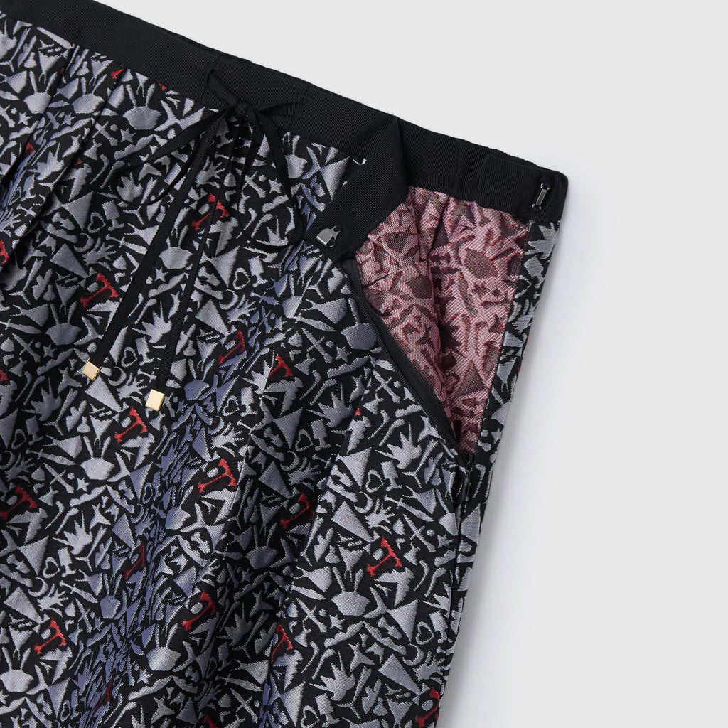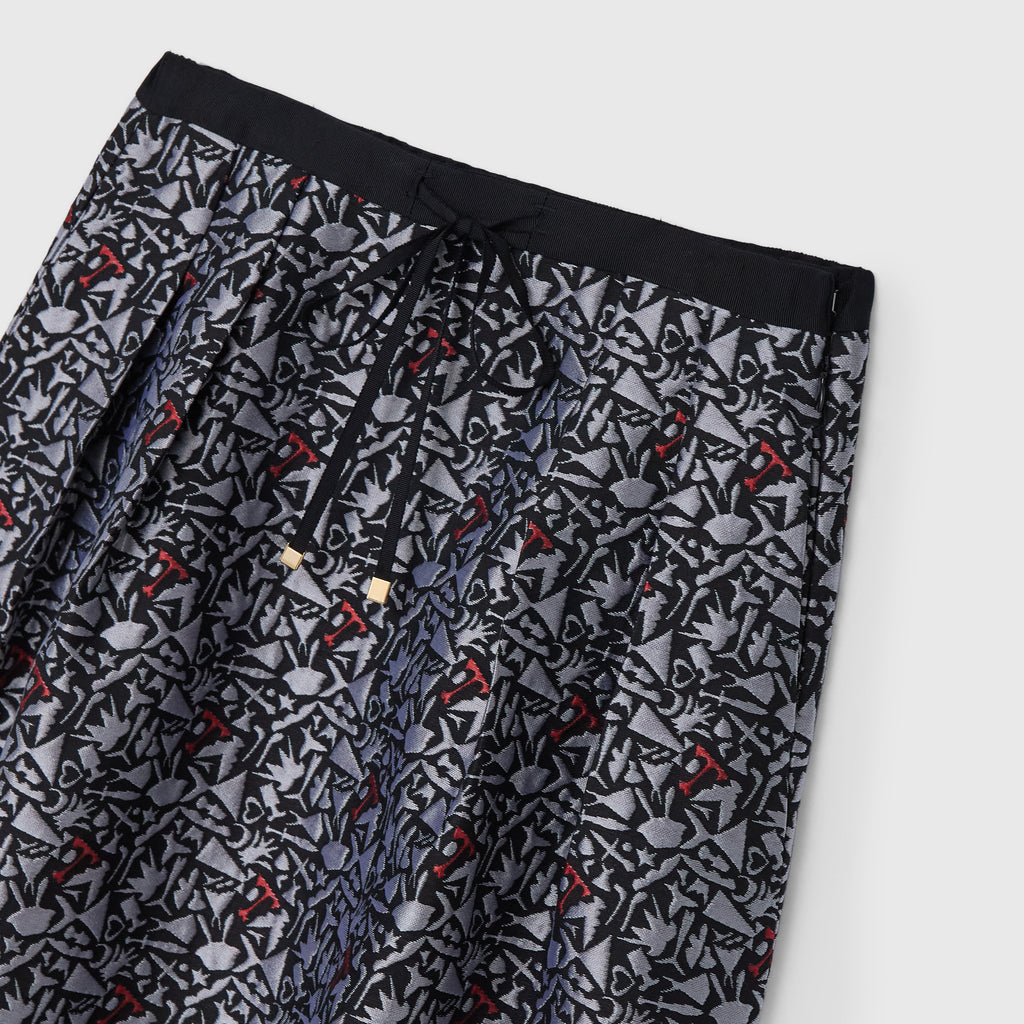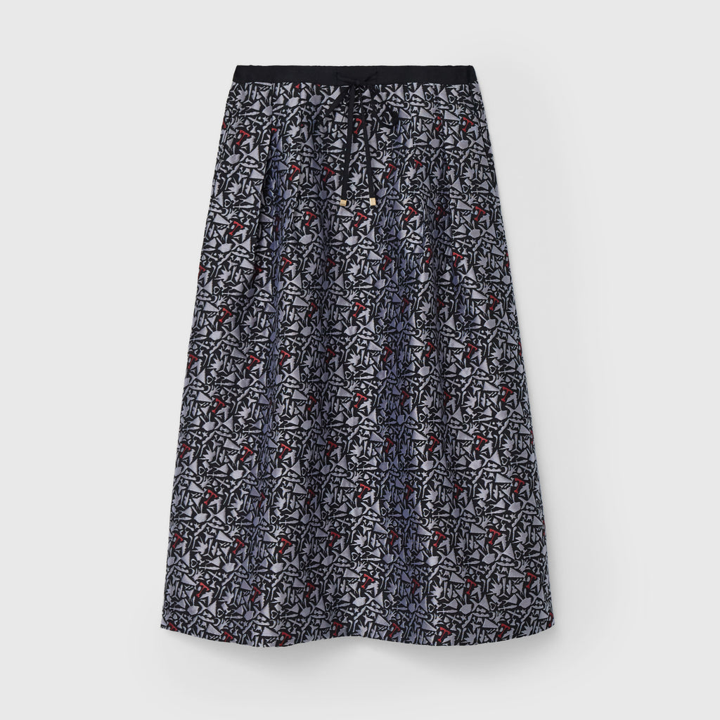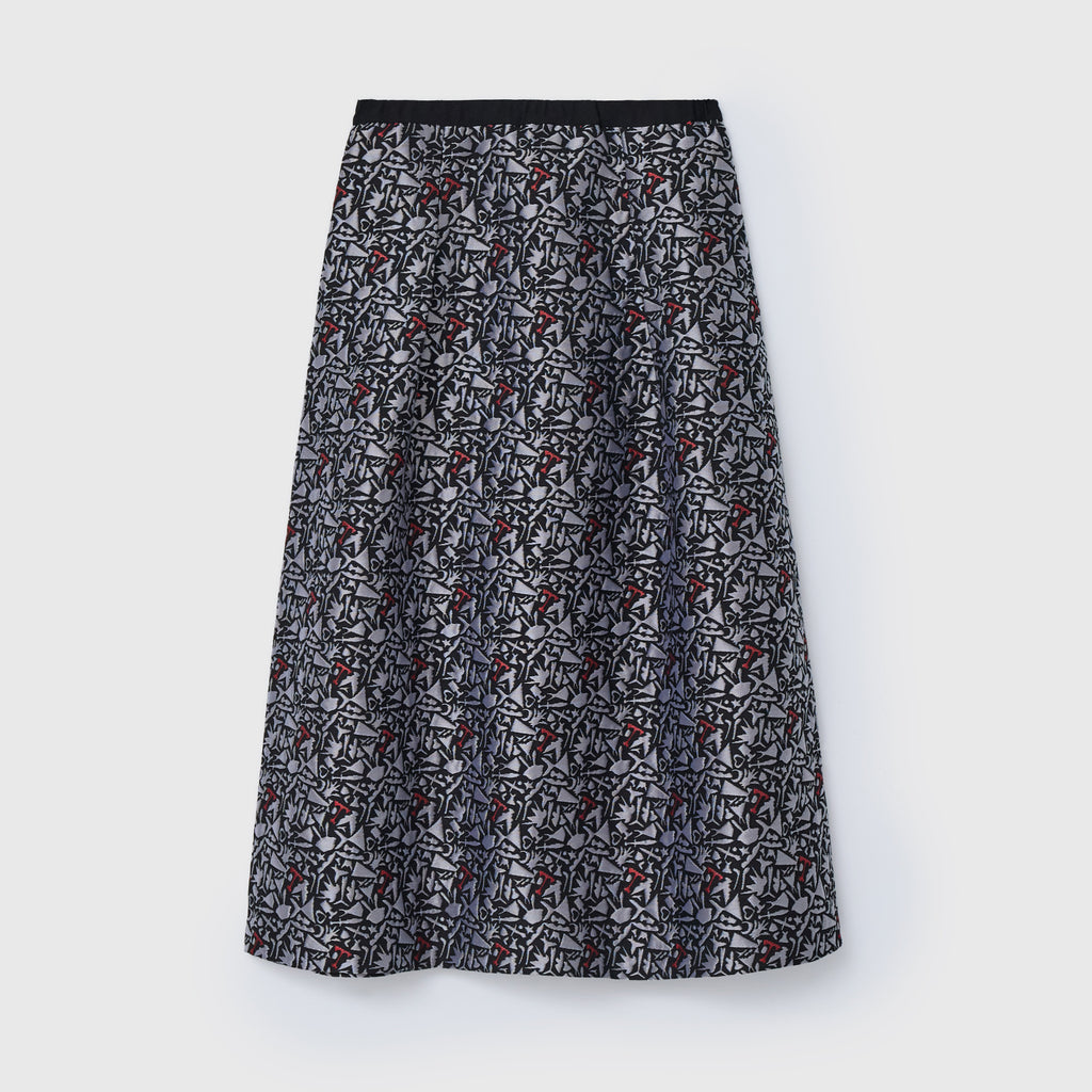 レッドの差し色が印象的な、ジャカード織りのスカート。緻密な織りで表現した輪島 楓(Kaede Wajima)の切り絵作品が、原画作品とはまた違った異彩を放ちます。同じアートを起用したジャカード素材のブルゾンとのセットアップも可能です。