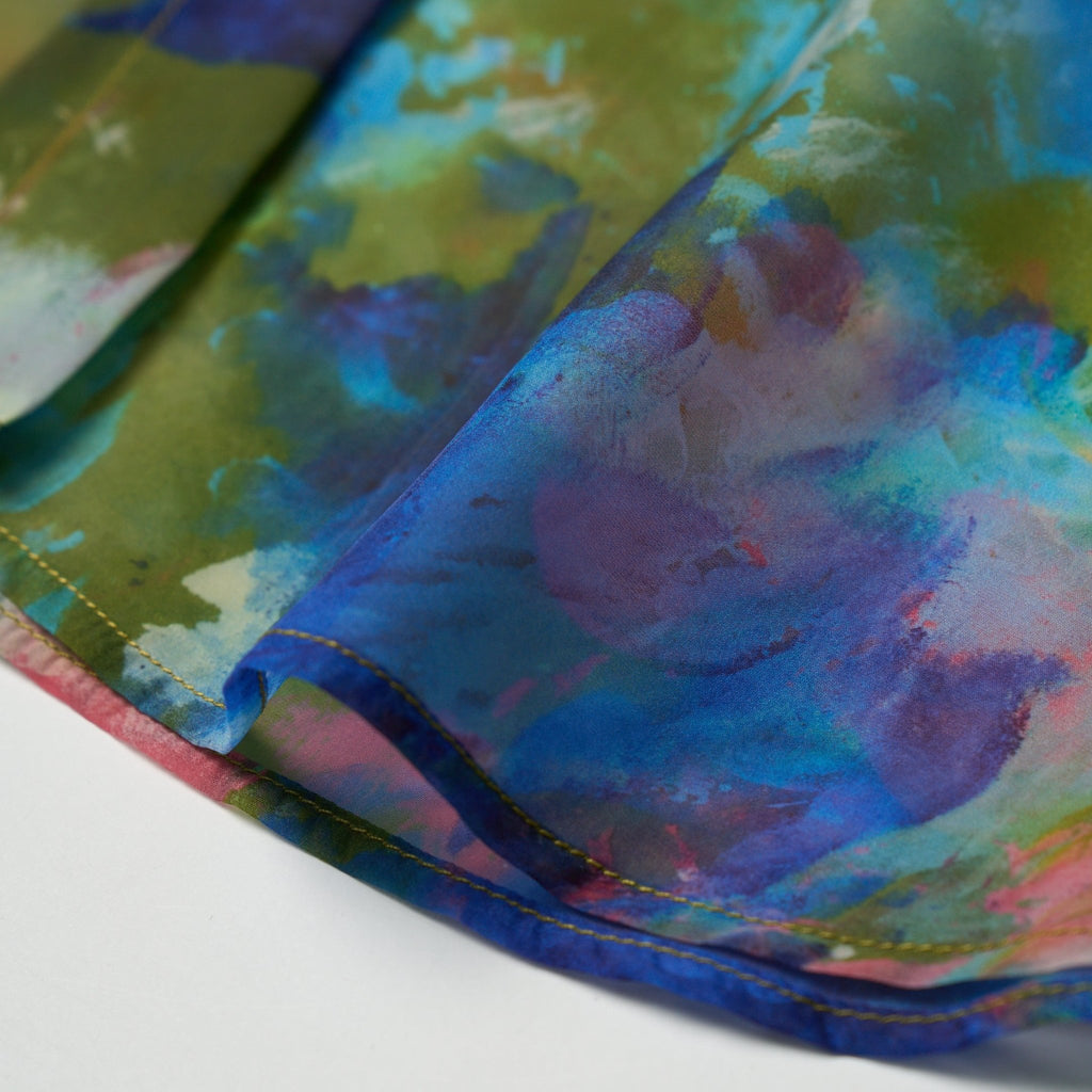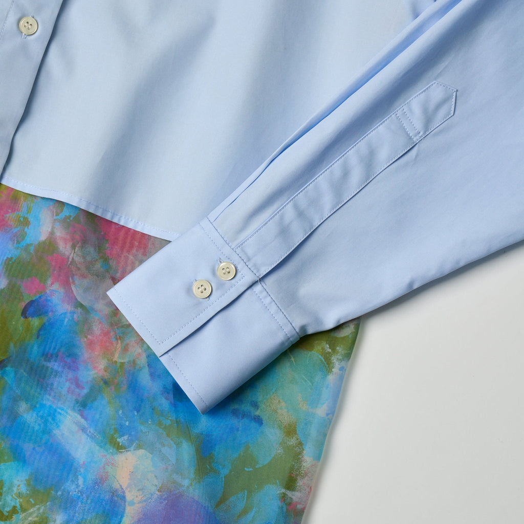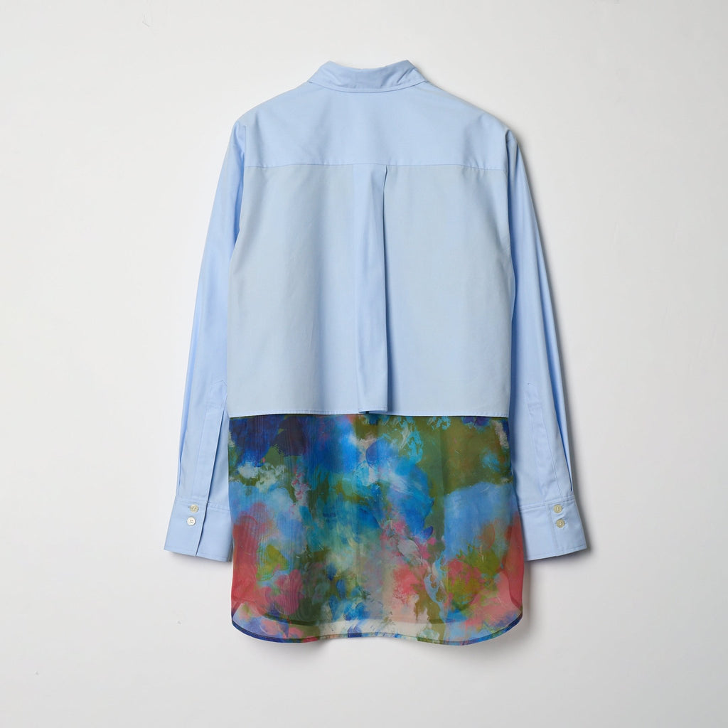 一枚でスタイリングが華やぐ、レイヤード風シャツ。端正なブロード生地のシャツと軽やかなオーガンジーが、動きのある存在感を演出します。春らしい色彩のアートをシアーな素材のせることで生まれる、原画作品とはまた違った表情を楽しめるアイテムです。