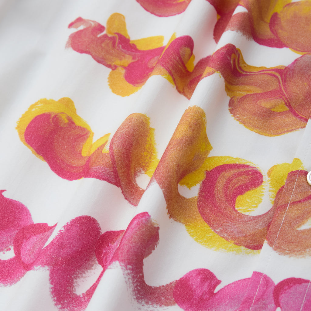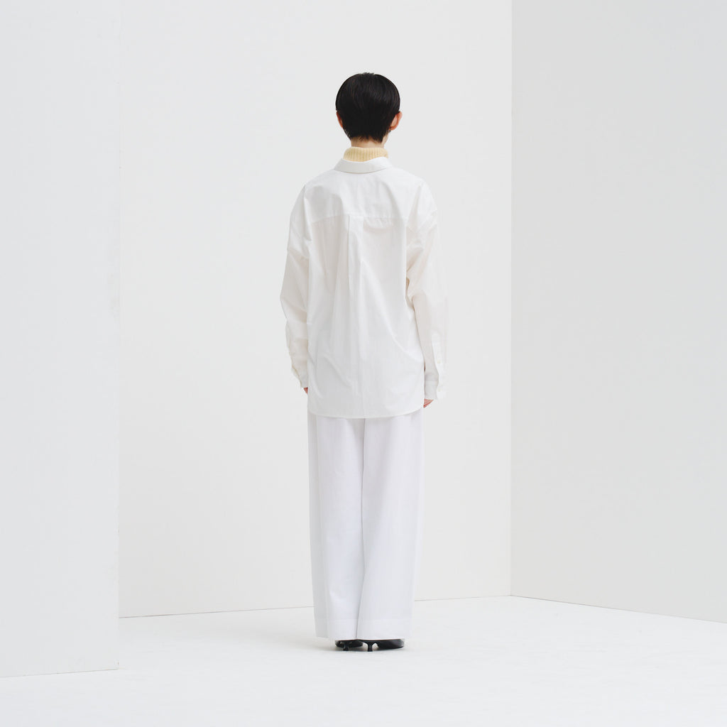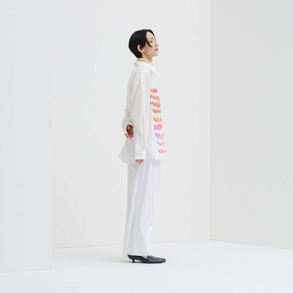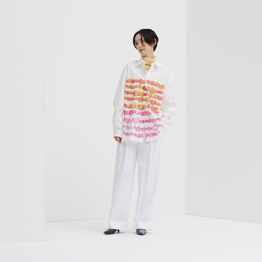 フロントにアートを配置したレギュラーカラーの長袖シャツ。身体のラインを拾わないユニセックスなシルエットで、インナーにニットを着たり、フロントを開けて羽織として着たりなど、幅広いスタイリングが可能です。