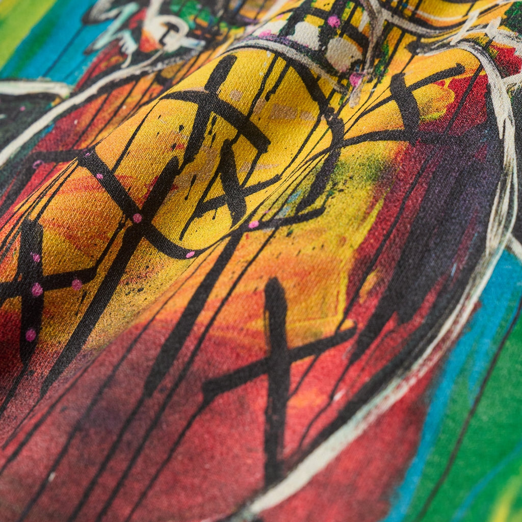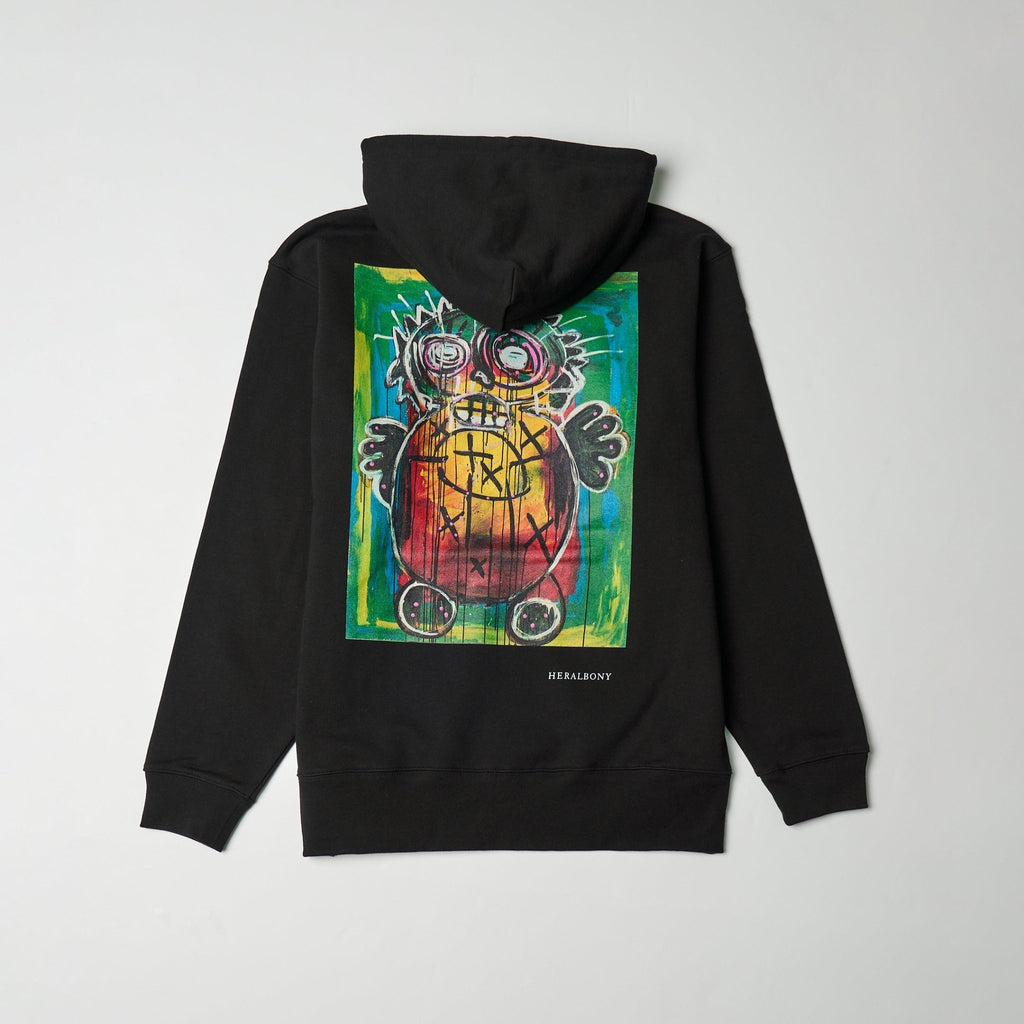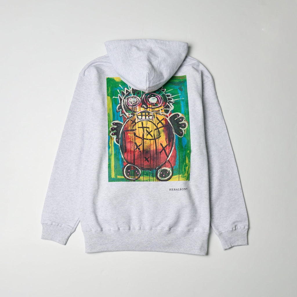 異彩のアートをビッグプリントで堪能するフード付きスウェット。フロントはシンプルなロゴのみのデザイン、バックのアートでさりげなく異彩をスタイリングに取り入れられます。
