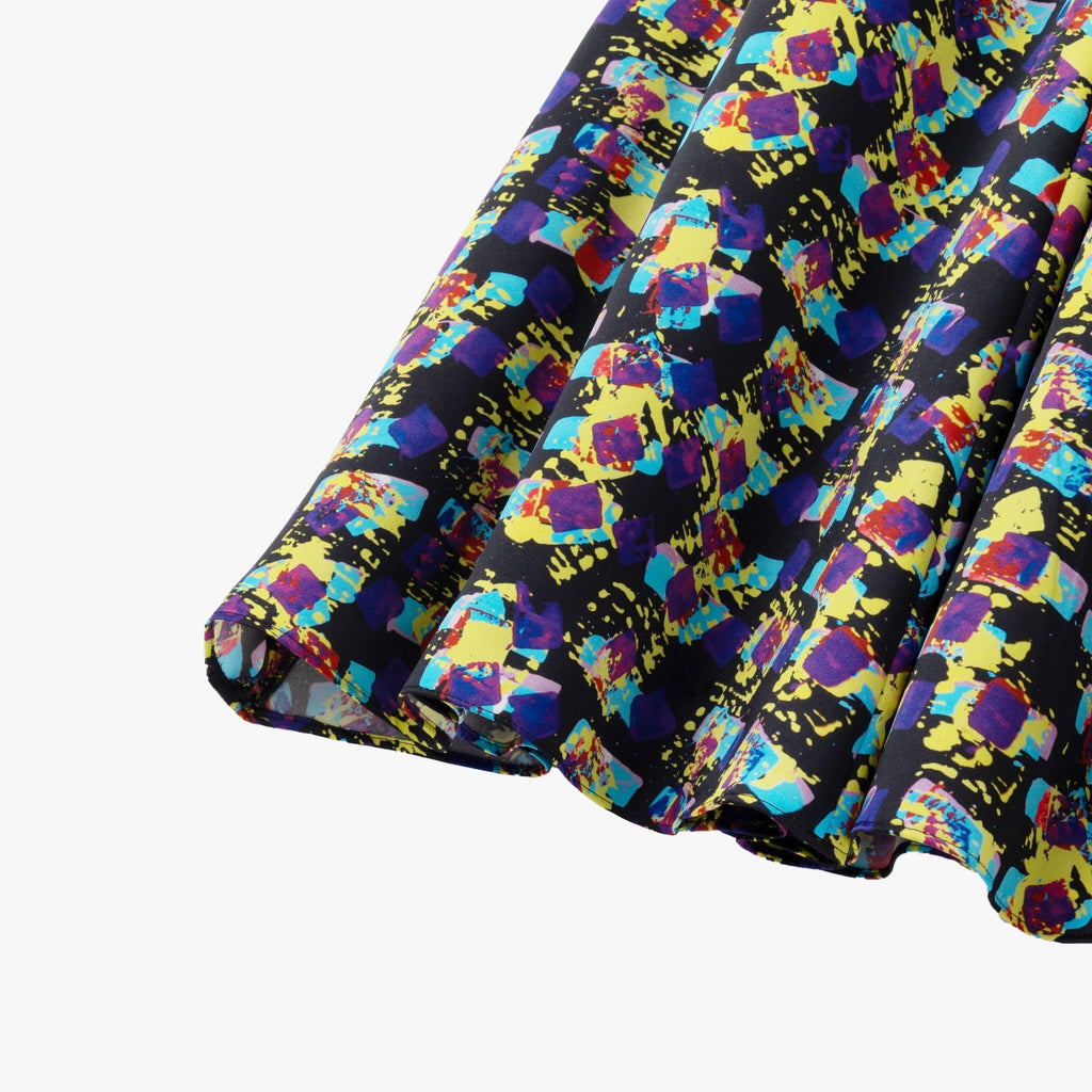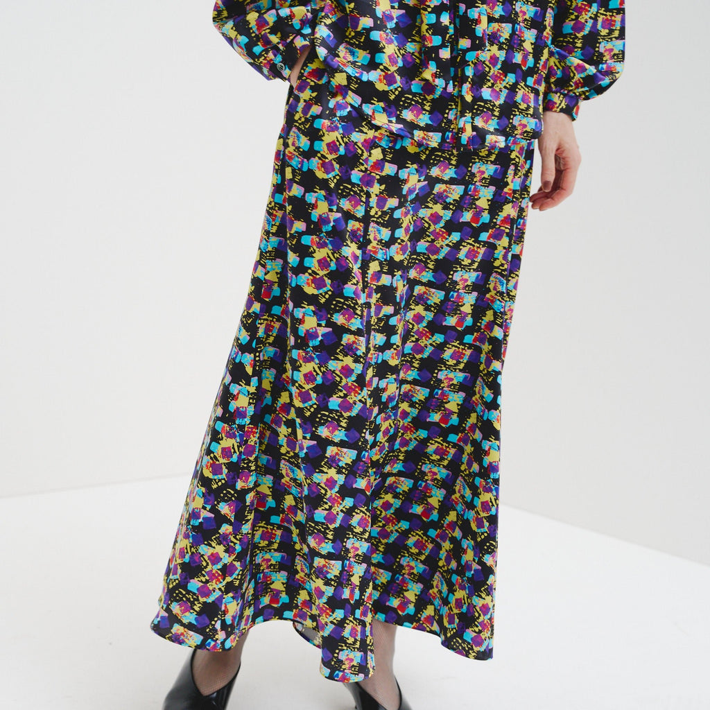 とろみのあるサテン生地をたっぷりとまとった、一枚でスタイリングが決まる大人のアートスカート。シルクのような光沢が、歩くたびに美しいドレープを描き出します。高級感あふれる素材とシックな色彩のアートが、大切な日に自信を与えてくれるスカートです。