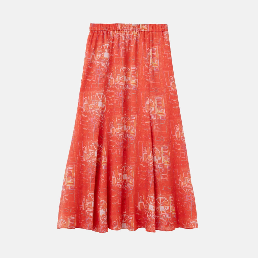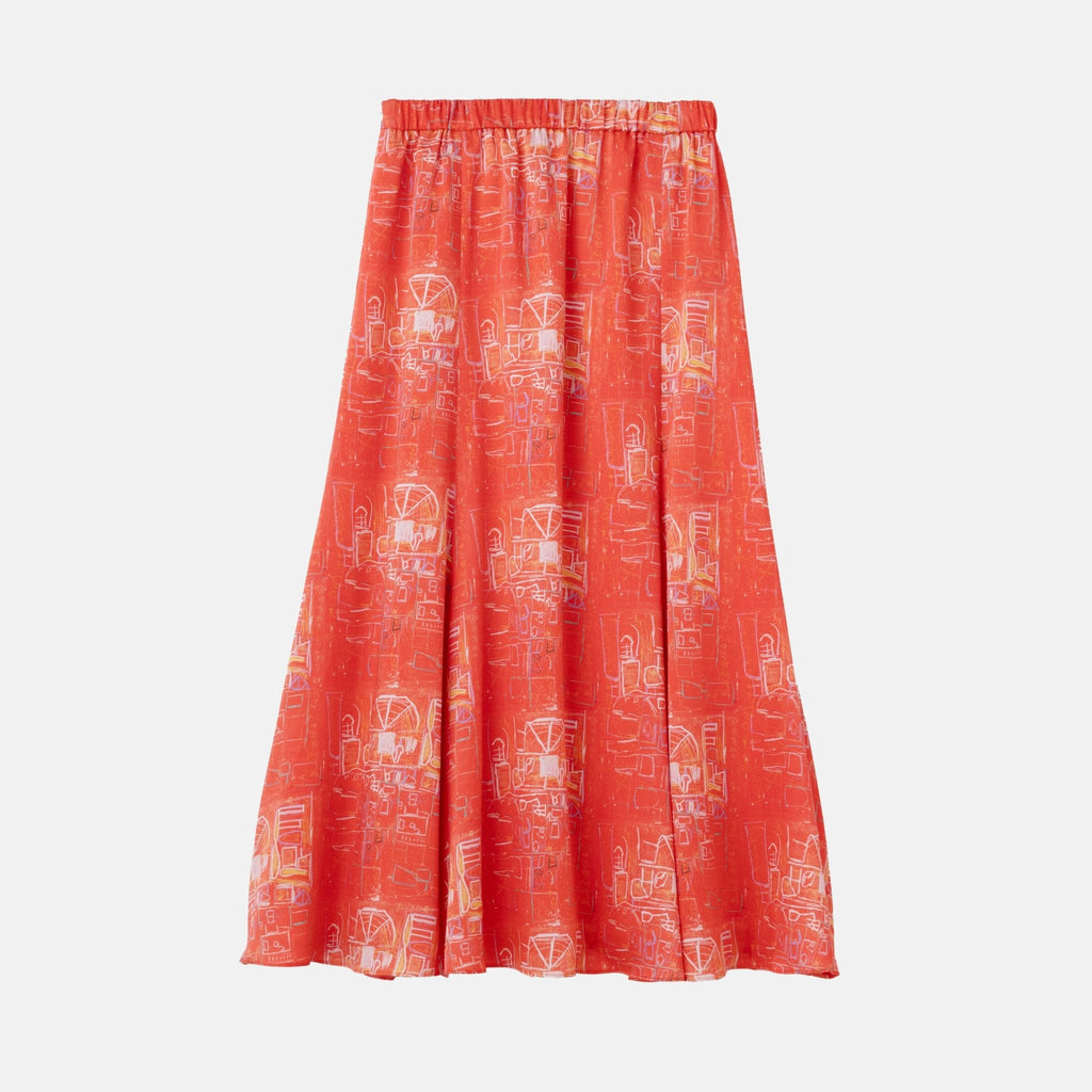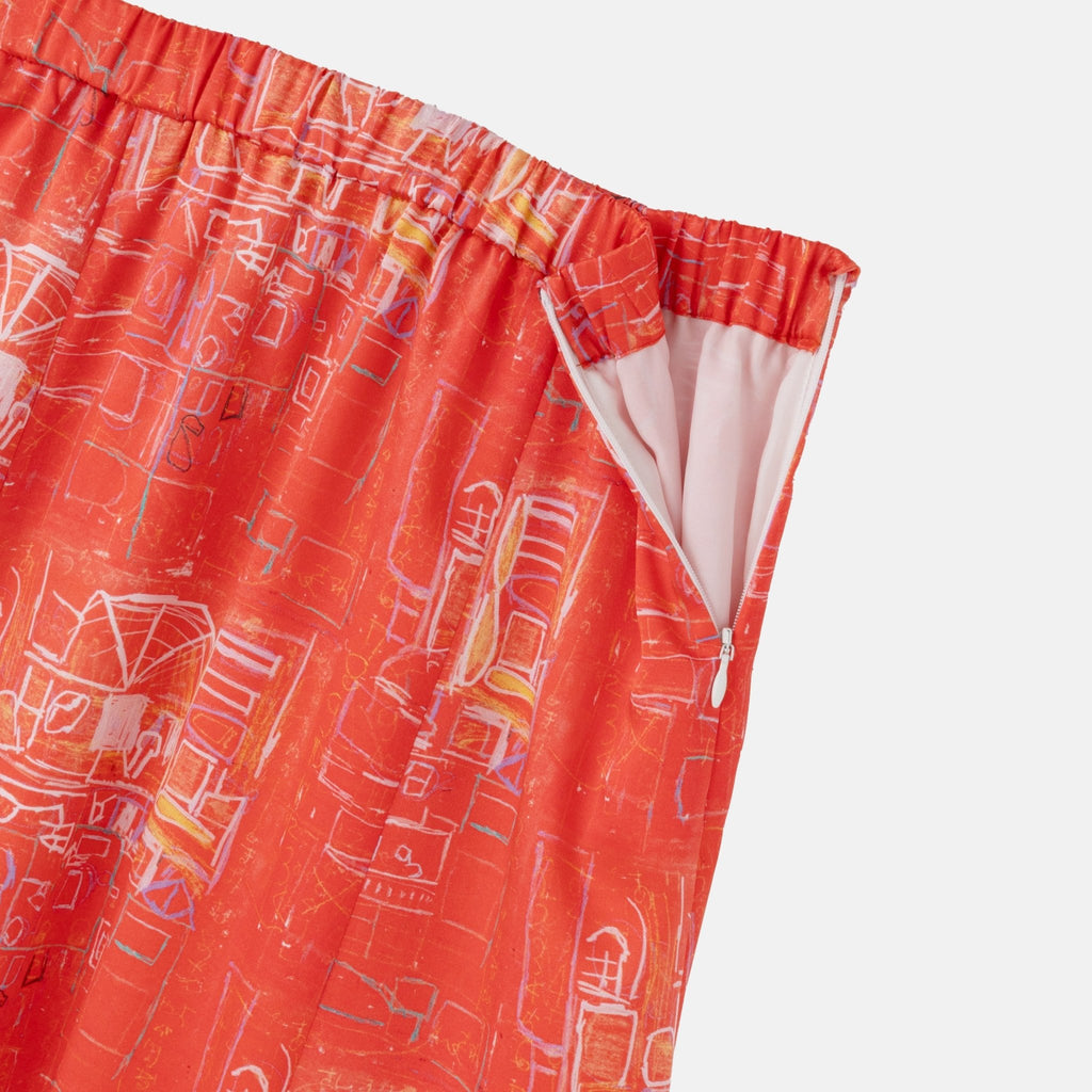 落ち着いたカラーリングのアートは、ジャケットやジレとも相性抜群。ビジネスシーンにも調和する、大人のスタイリングに合わせやすいスカートです。