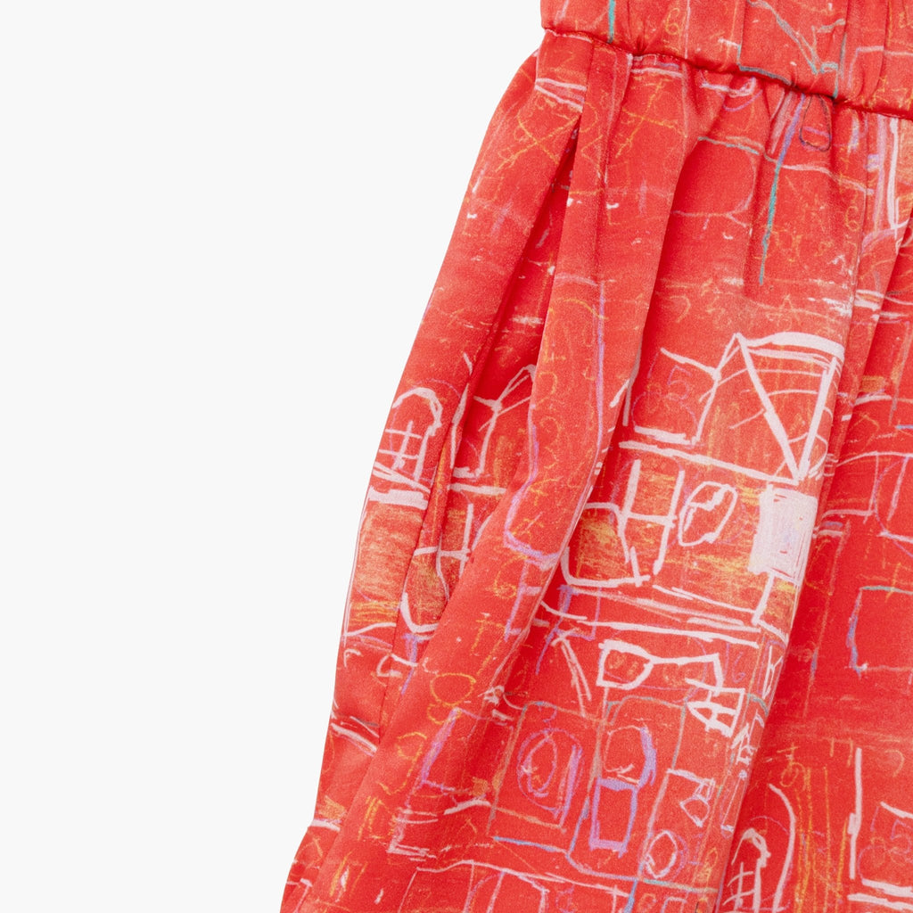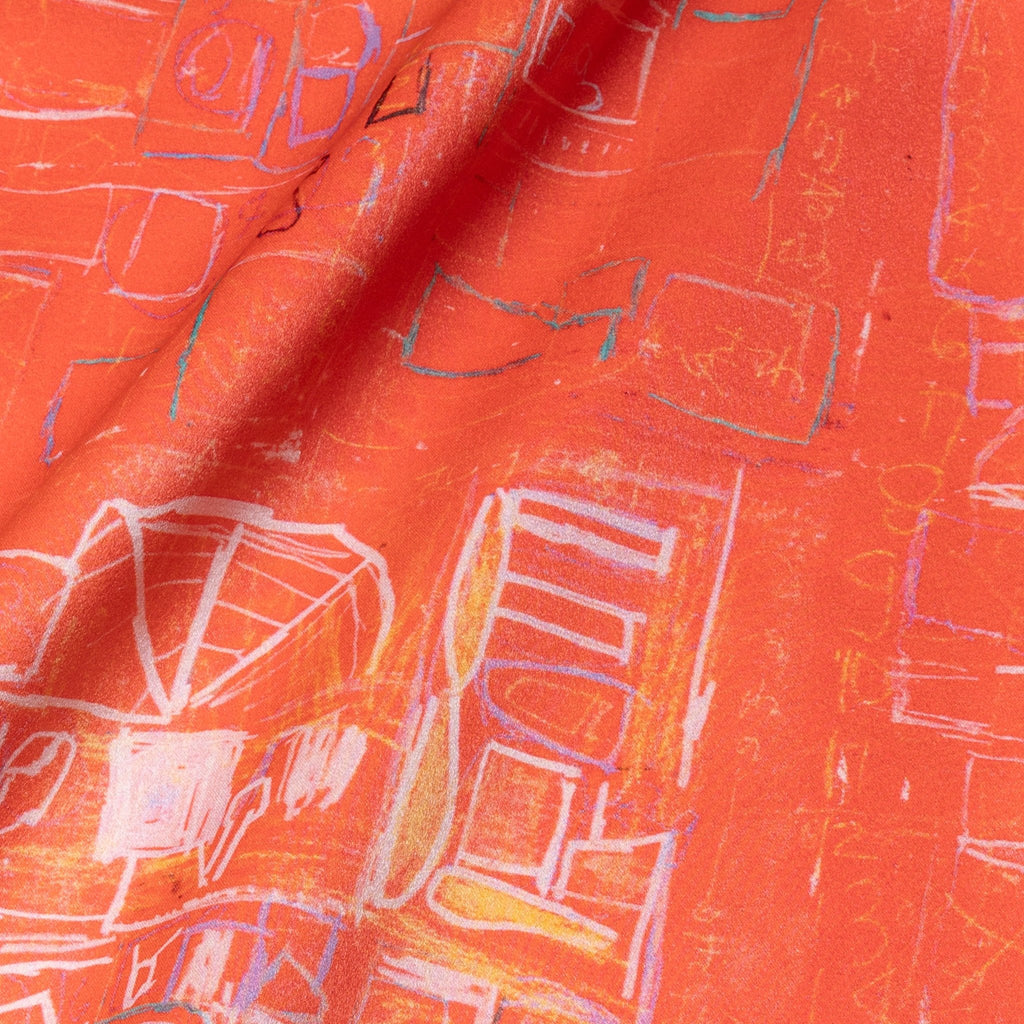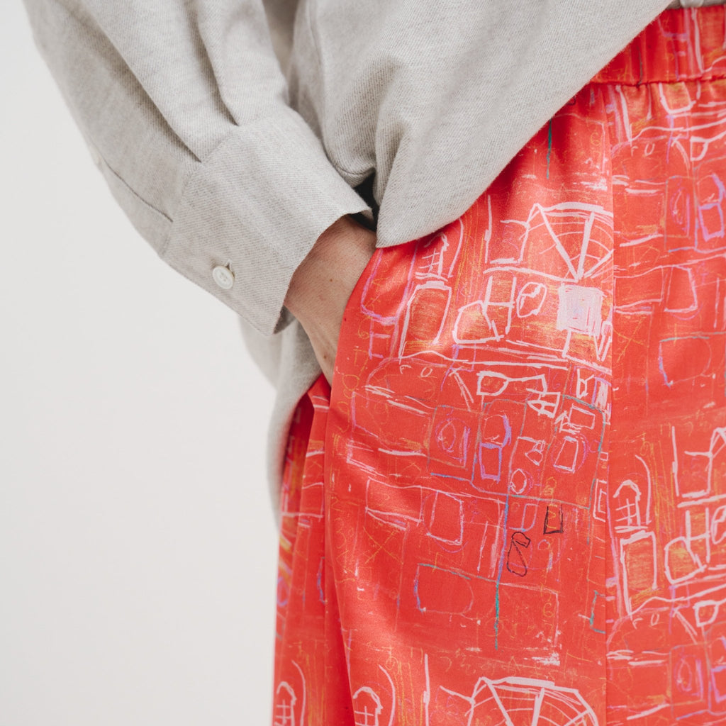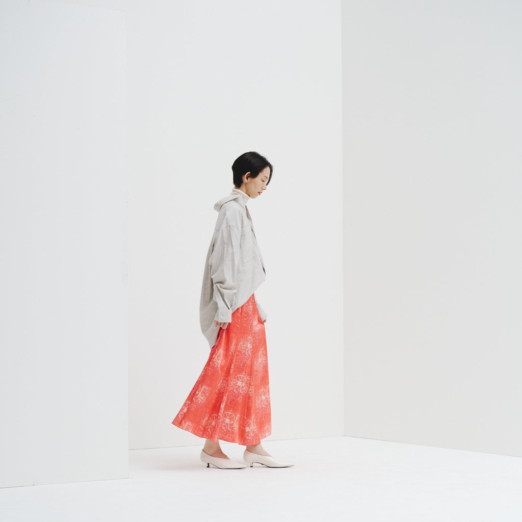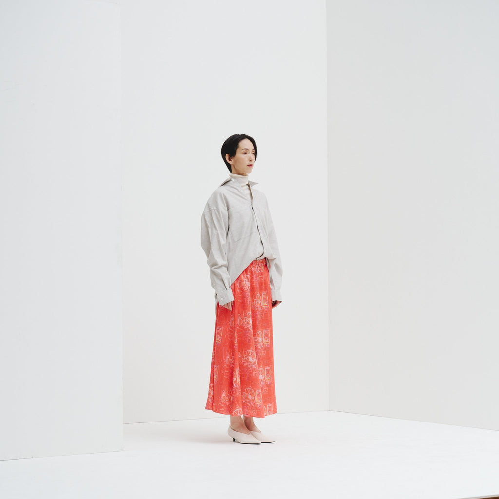 とろみのあるサテン生地をたっぷりとまとった、一枚でスタイリングが決まる大人のアートスカート。シルクのような光沢が、歩くたびに美しいドレープを描き出します。高級感あふれる素材とシックな色彩のアートが、大切な日に自信を与えてくれるスカートです。