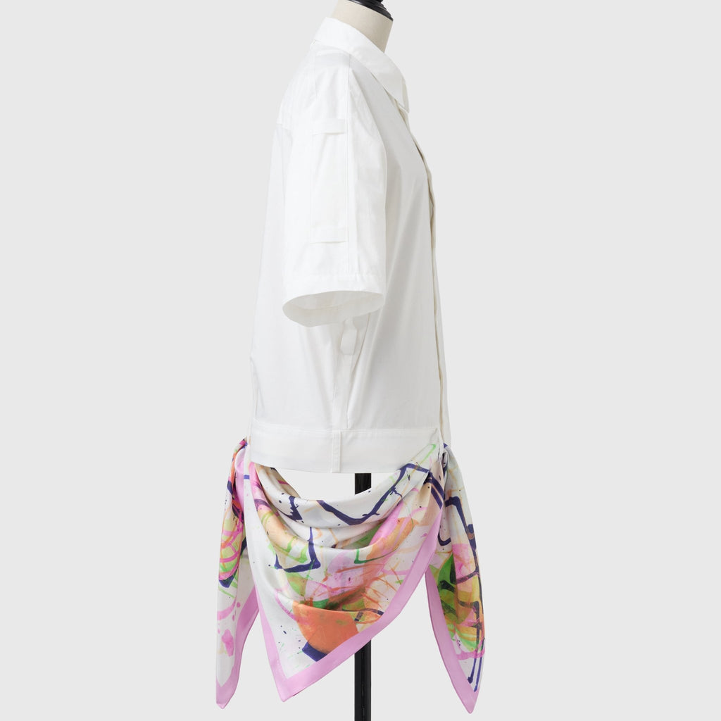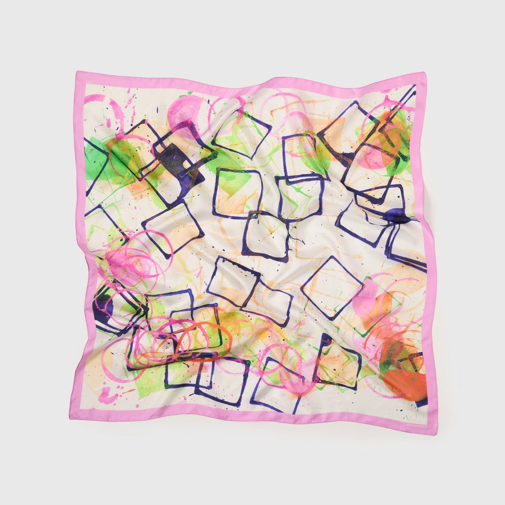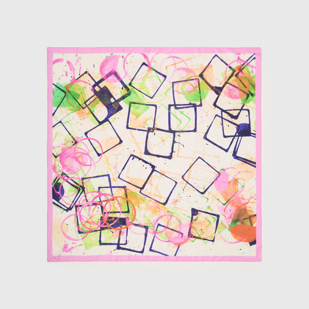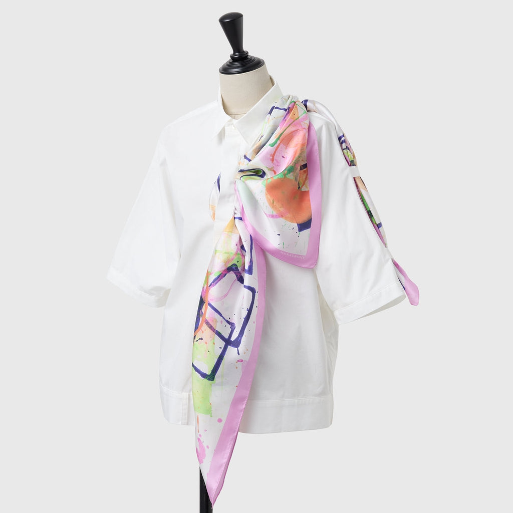 製造工程から見直しを図り、「表も裏も美しい」スカーフに仕上がりました。作品のエネルギーを失うことなく再現するため、シルク素材100%にこだわり、ハリのあるなめらかな肌触りで、首に巻いたときの心地よさも特徴です。