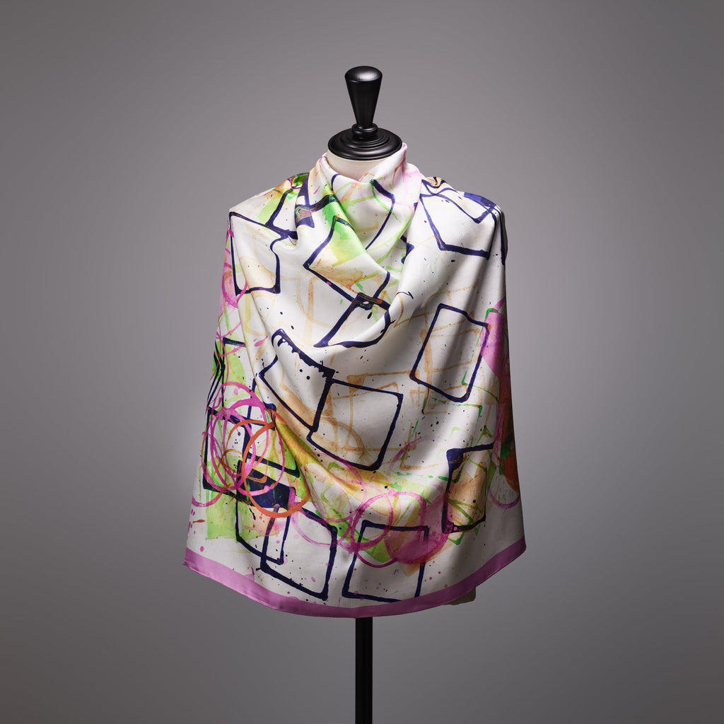 異彩作家の筆使いを忠実に再現するため、シルク素材100%にこだわりました。ずっと触っていたくなるようなハリのあるなめらかな手触りで、いつもの装いに特別な彩りを添えてくれます。