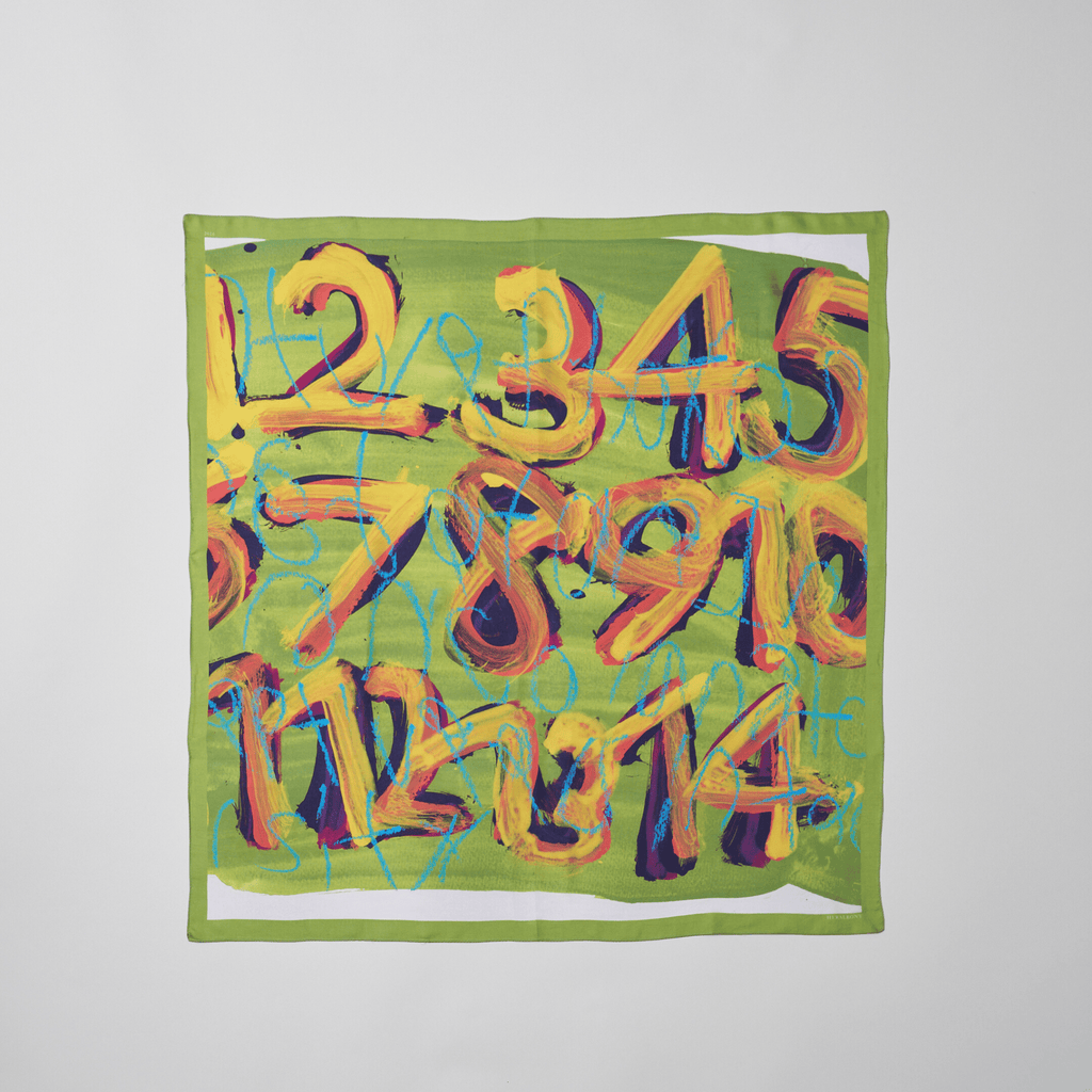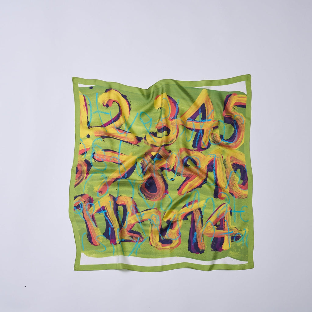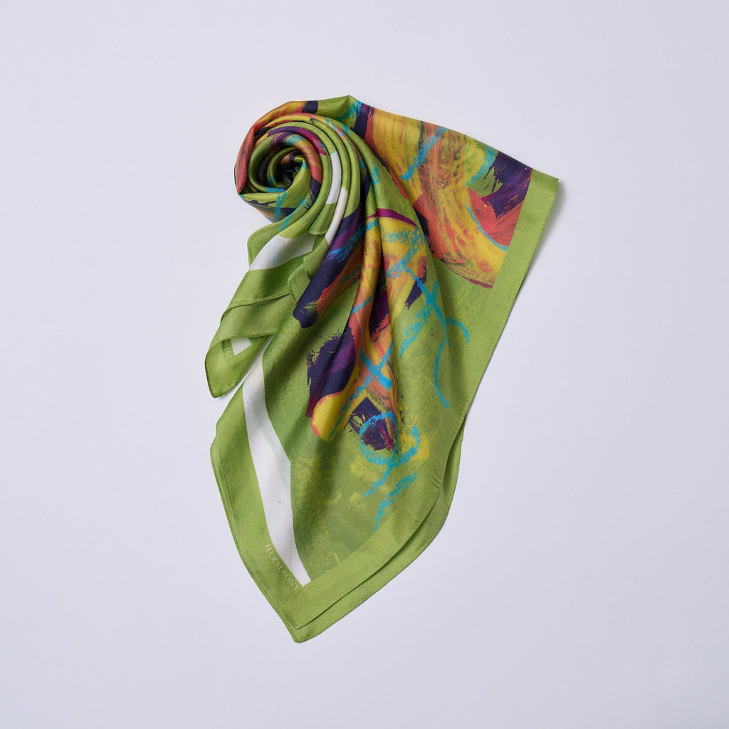 製造工程から見直しを図り、「表も裏も美しい」スカーフに仕上がりました。作品のエネルギーを失うことなく再現するため、シルク素材100%にこだわり、ハリのあるなめらかな肌触りで、首に巻いたときの心地よさも特徴です。