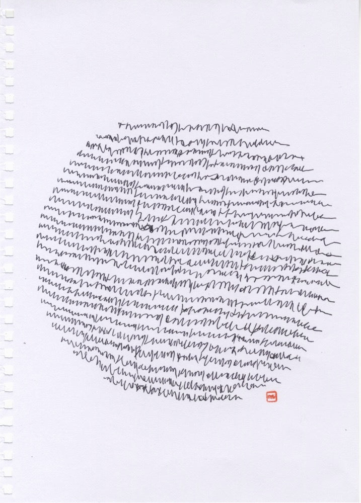 お寿司やゲーム、料理、そして絵を描くことを楽しみ、12歳から創作活動を続けている。なかでも情熱を注いでいるのが、ノートにびっしりと描き連ねる独自の「文字のようなもの」である。それは古代の碑文や宇宙の暗号、未来の言語を連想させるタイポグラフィであり、流れるように走り書かれた筆跡は見る者ごとに異なる解釈を促す。意味を求める人々の想像力の数だけ、新しい物語が紡がれていく。