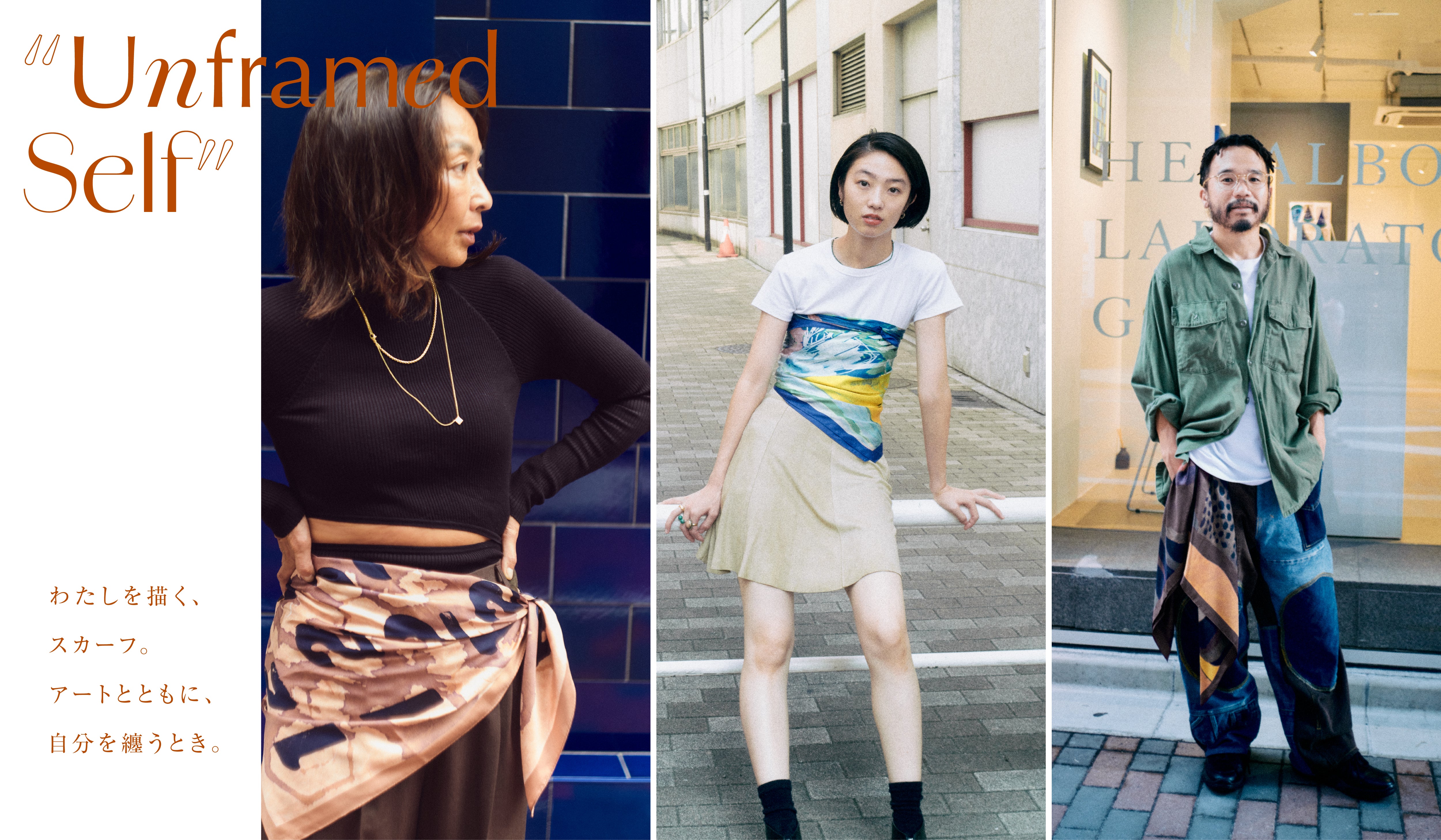今回の作家・栗原 汰希さんのスカーフも、色々な種類がある中から、カラーリングや今の自分のテンションに一番合うものをインスピレーションに従って選びました。白と黒を基調にした抽象的なデザインが素敵で、程よい肌見せができるトップス感覚で愛用したいです。