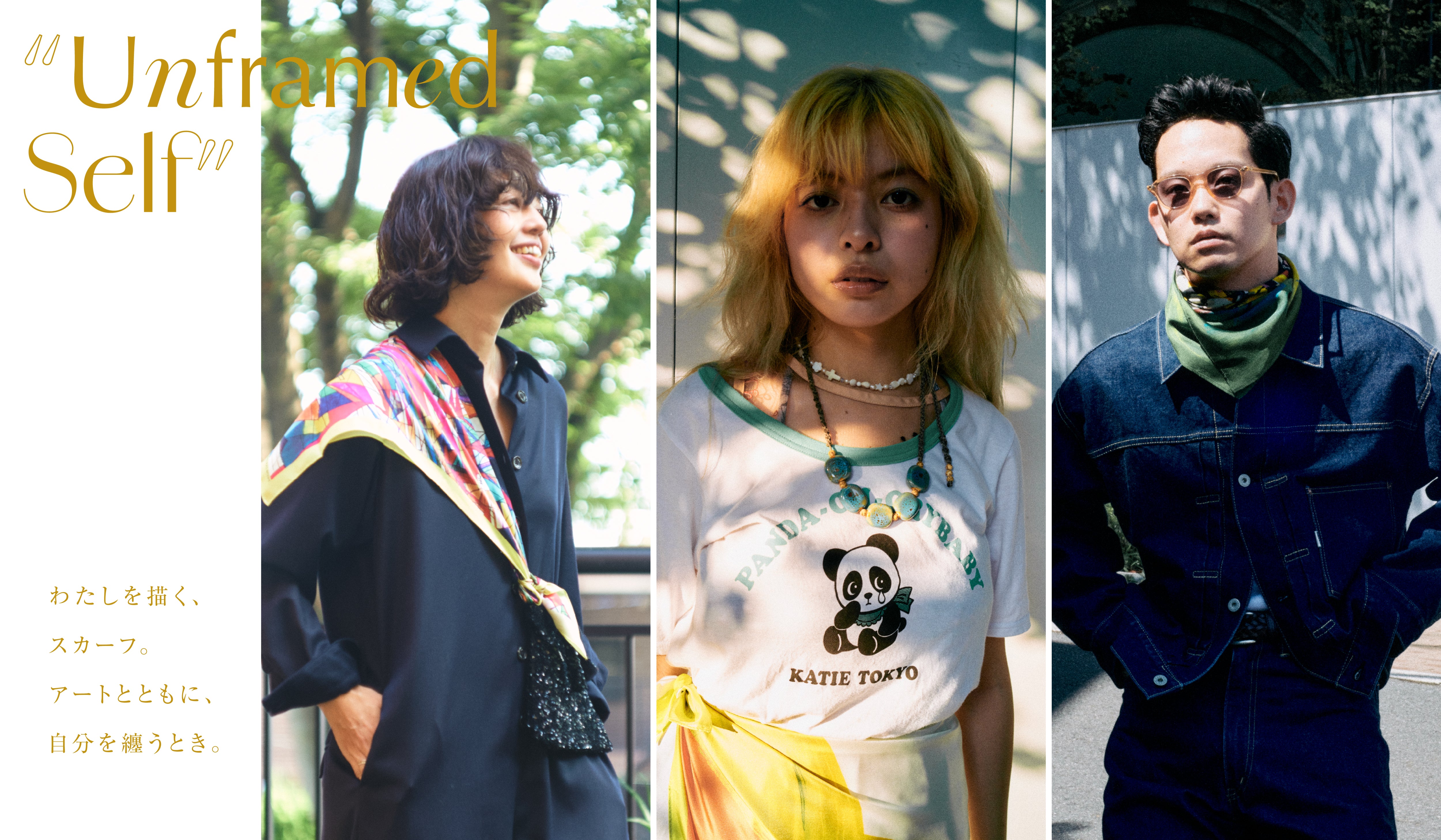 今回の作家・中尾涼さんのスカーフは、海外のヒップホップカルチャーを感じさせる壁画のようなグラフィックに惹かれました。大胆な色使いもそうですが、文字の太さが “あえて計算されず” に描かれているようで、その自由さがとてもかっこいいなと。今日はスカーフを主役に、頭に“海賊巻き”をしてコーディネートしてみました。