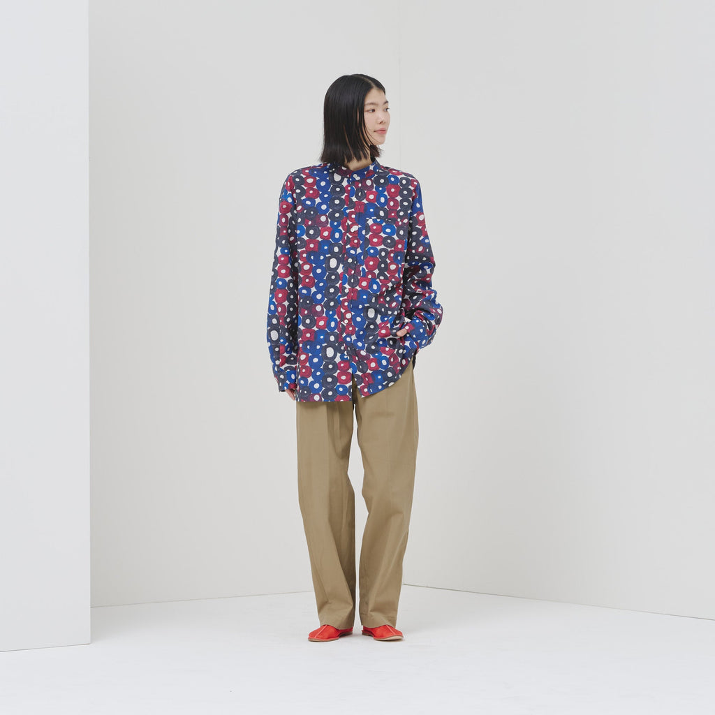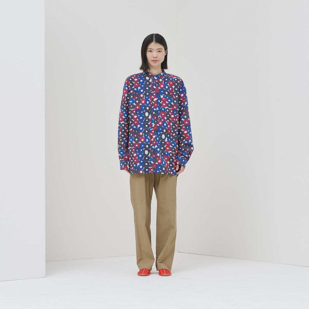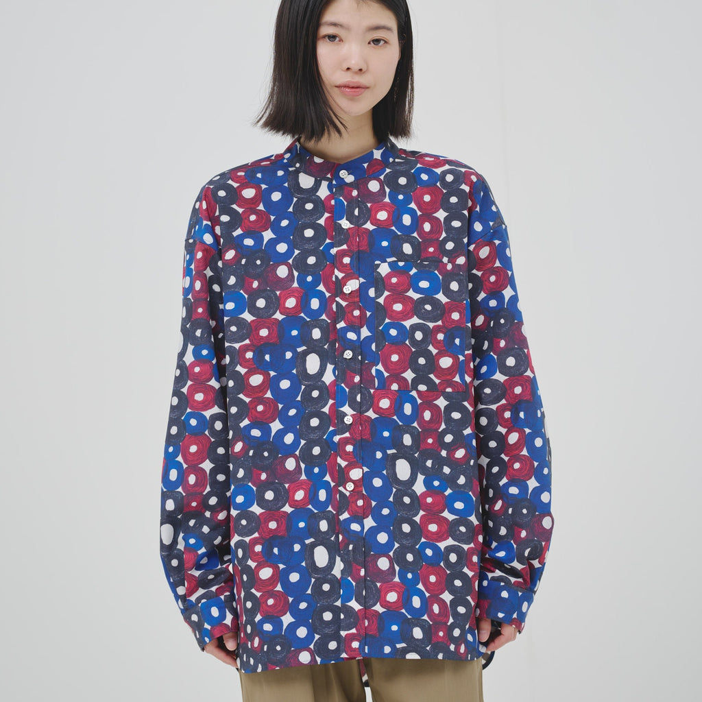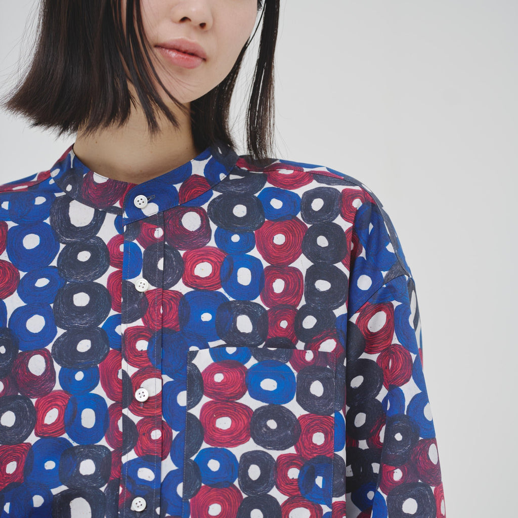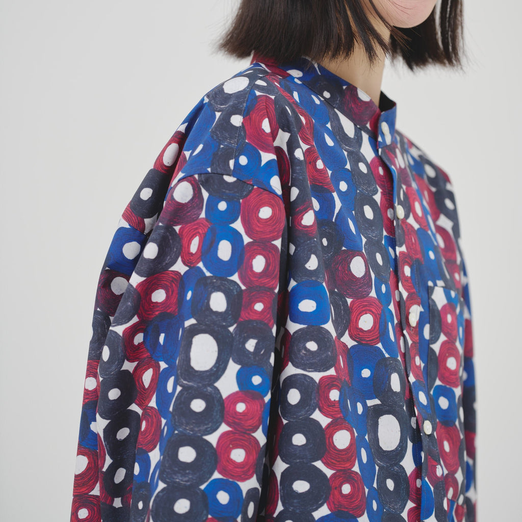 シーンを問わずに着られる人気のバンドカラーシャツが、春夏向きの軽やかな素材で登場。HERALBONYらしい異彩を放つアートを、日常でまといやすいベーシックな一枚に仕上げました。身体のラインを拾わないユニセックスなシルエットで、インナーにニットを着たり、フロントを開けて羽織として着たりなど、幅広いスタイリングが可能です。