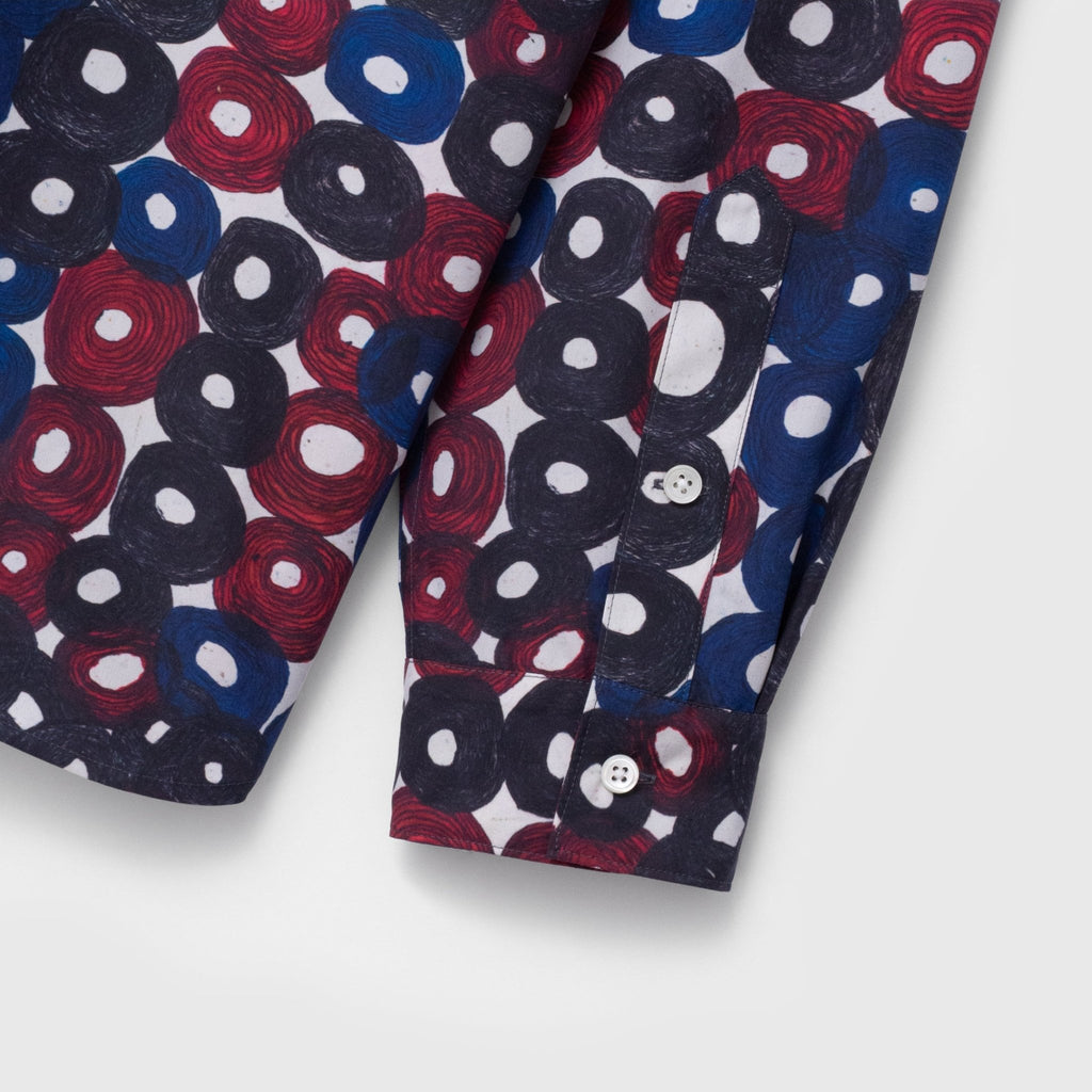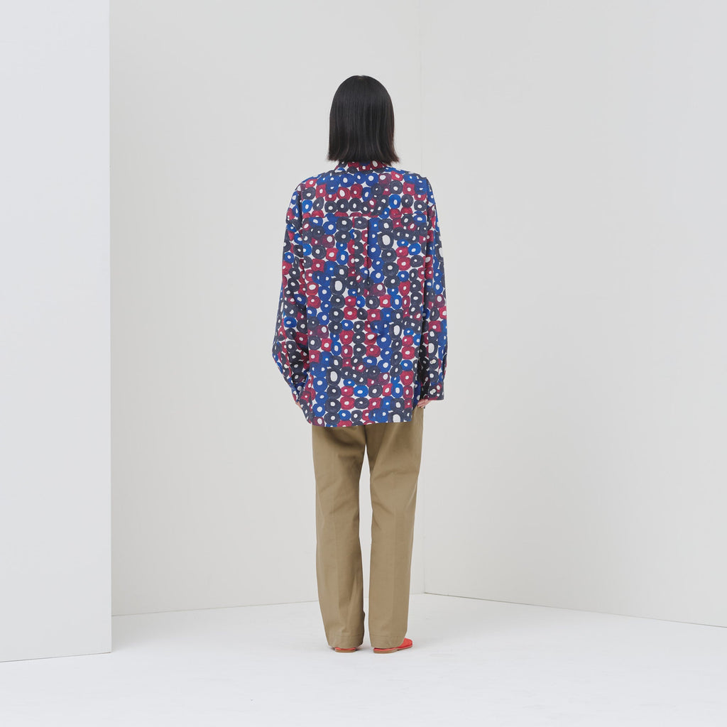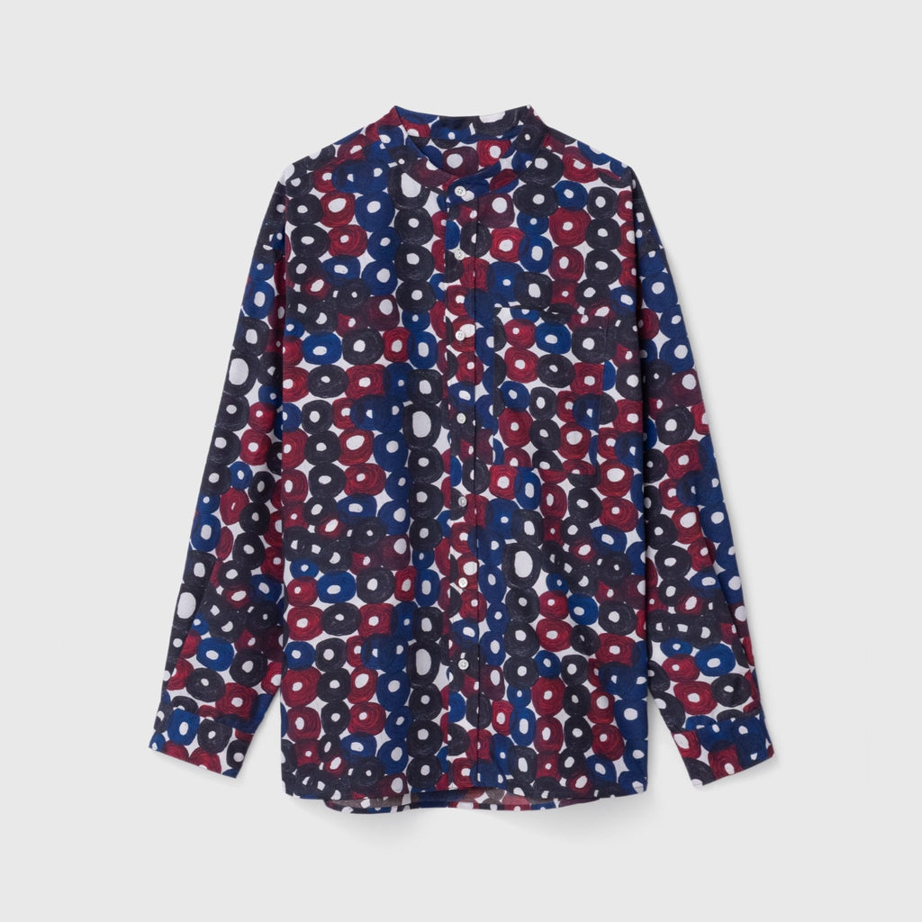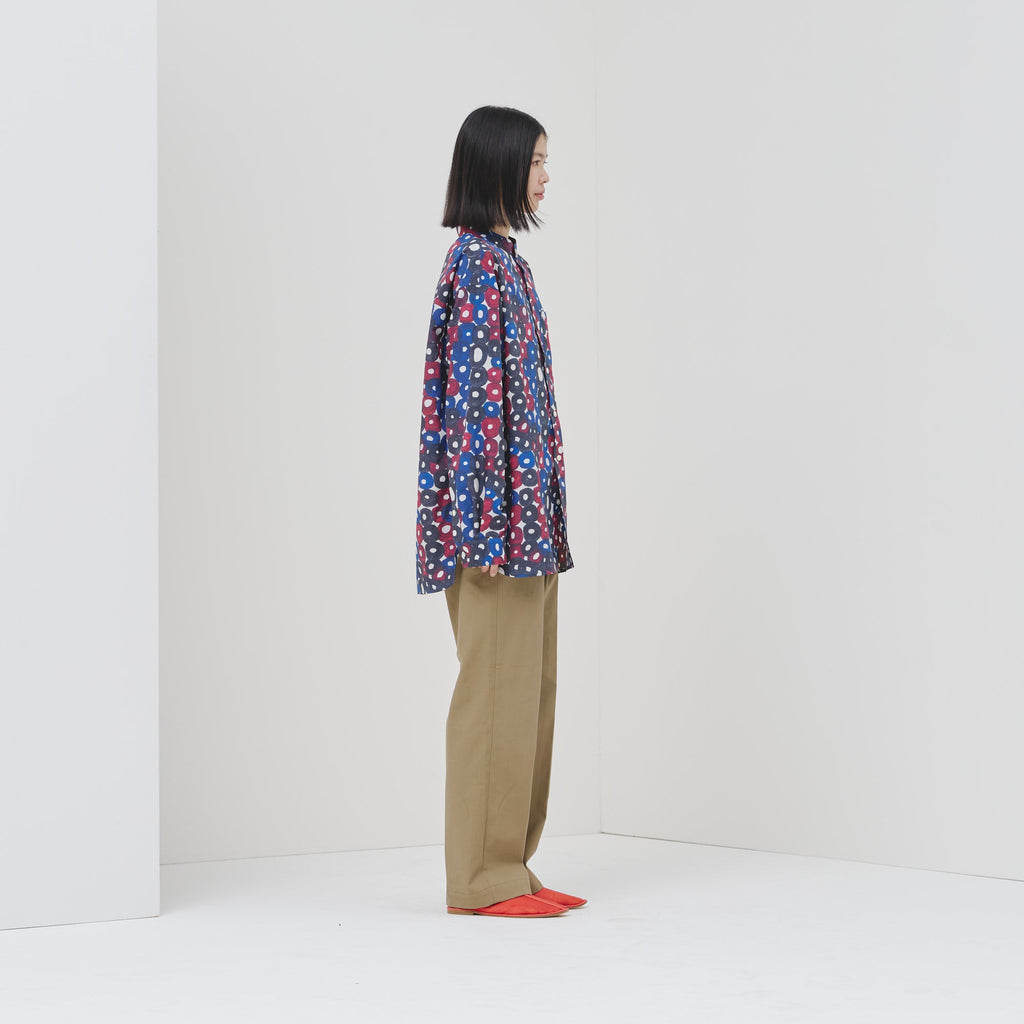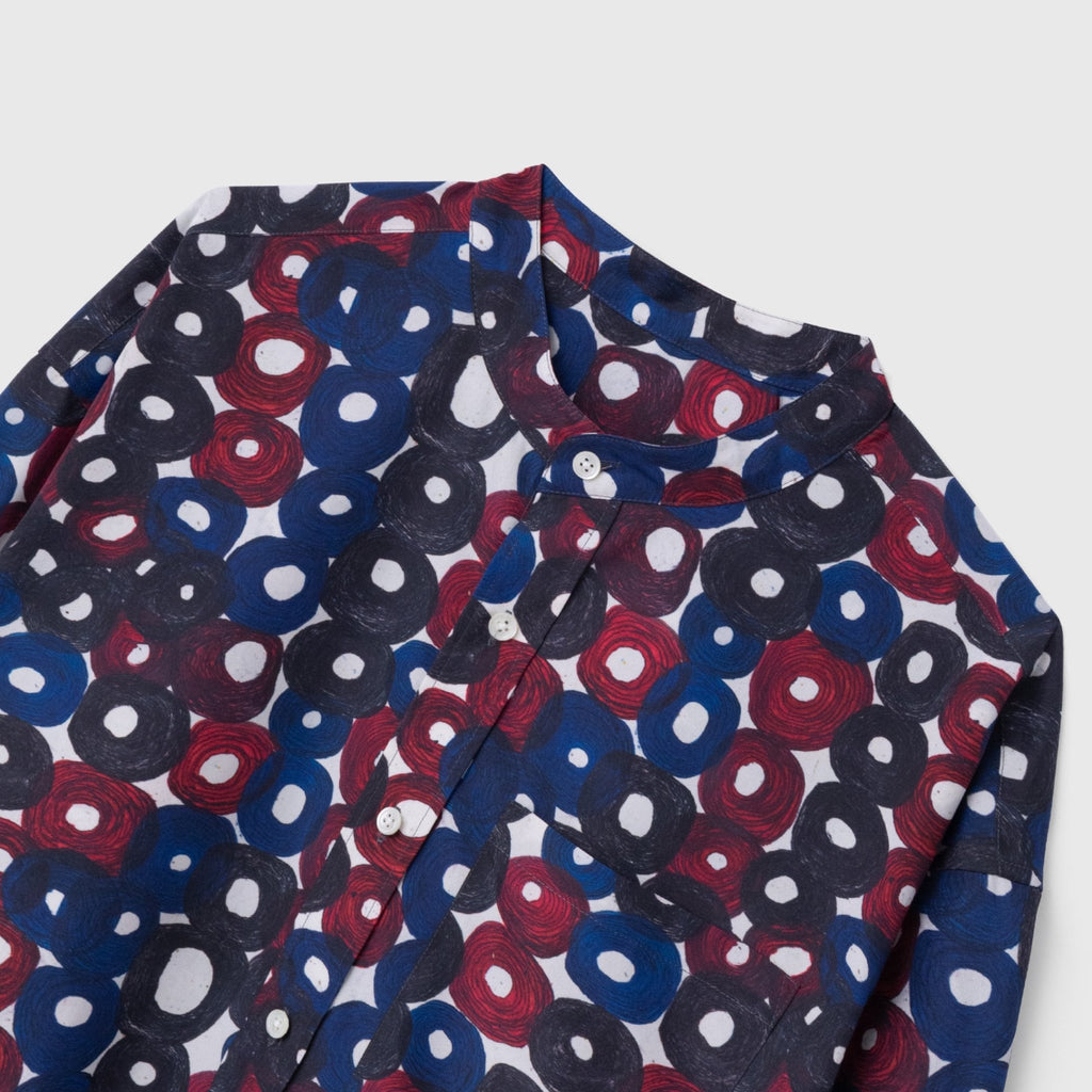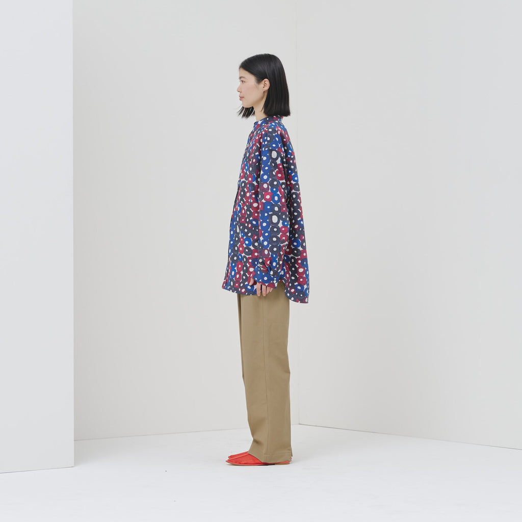 シーンを問わずに着られる人気のバンドカラーシャツが、春夏向きの軽やかな素材で登場。HERALBONYらしい異彩を放つアートを、日常でまといやすいベーシックな一枚に仕上げました。身体のラインを拾わないユニセックスなシルエットで、インナーにニットを着たり、フロントを開けて羽織として着たりなど、幅広いスタイリングが可能です。