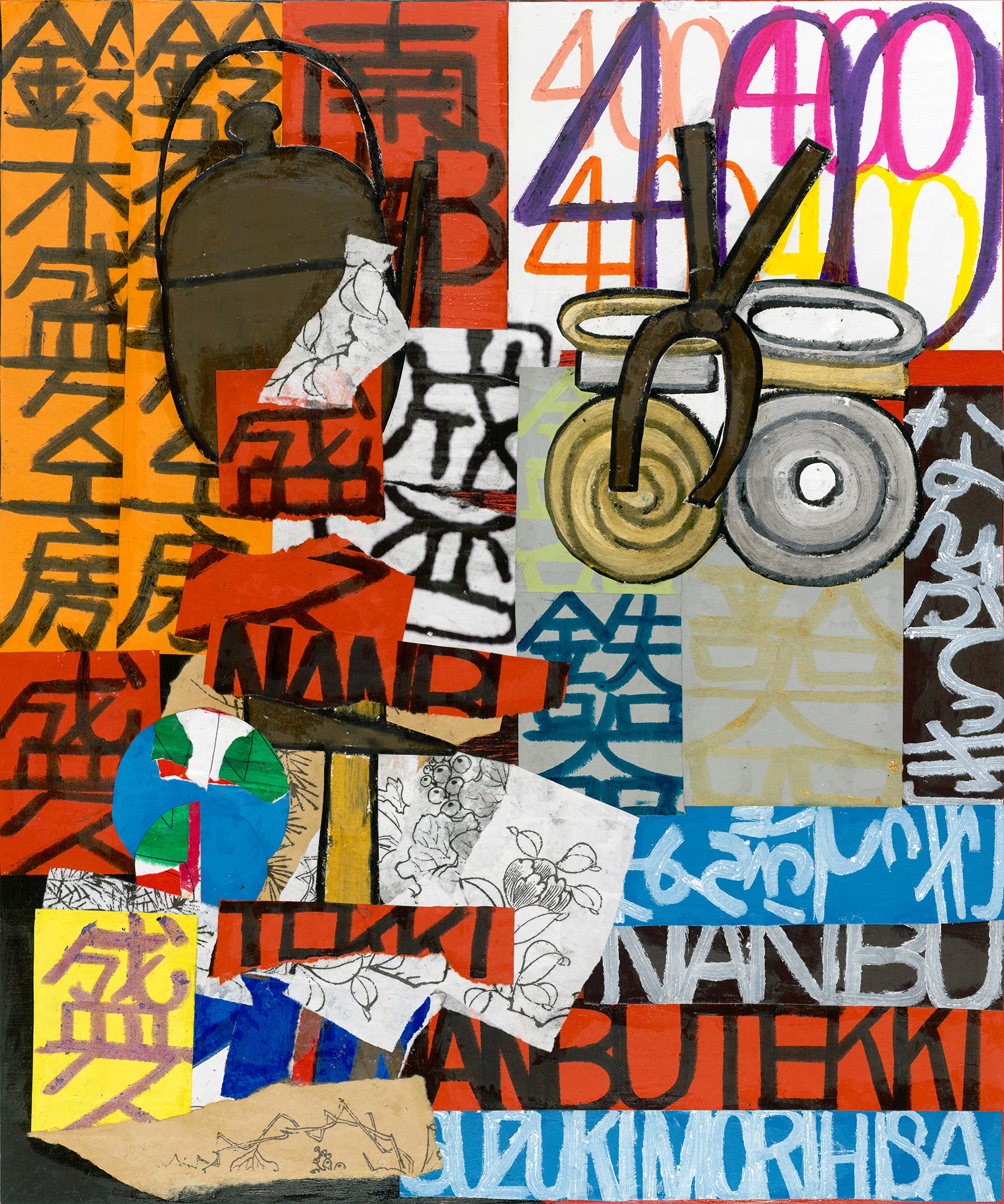 《TEKKI Rhythm》と題されたコラージュには「南部鉄器」「鈴木盛久工房」「NANBU TEKKI」などの文字があしらわれ、幼少期からロゴマークや文字に強いこだわりを持つ藤田 望人ならではの作品となっています。