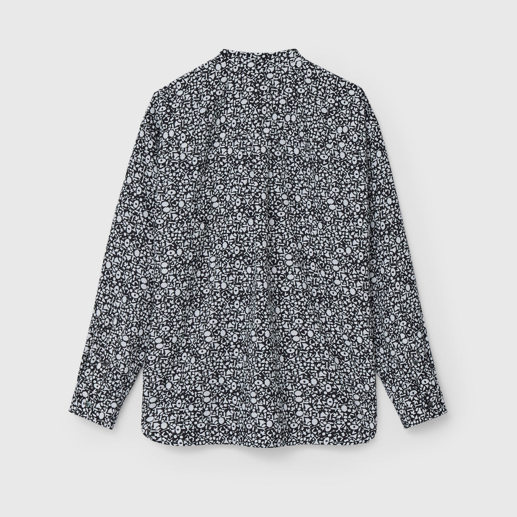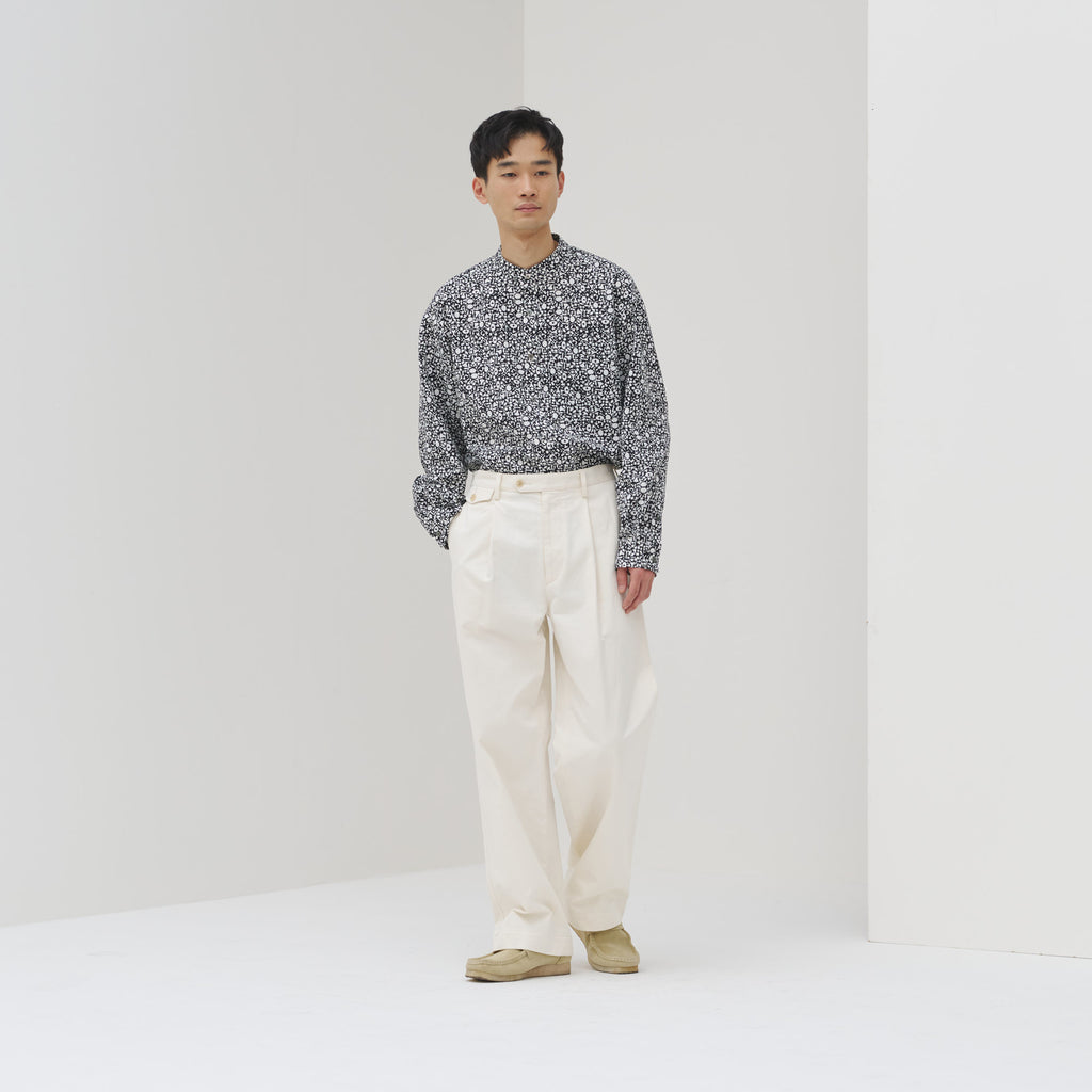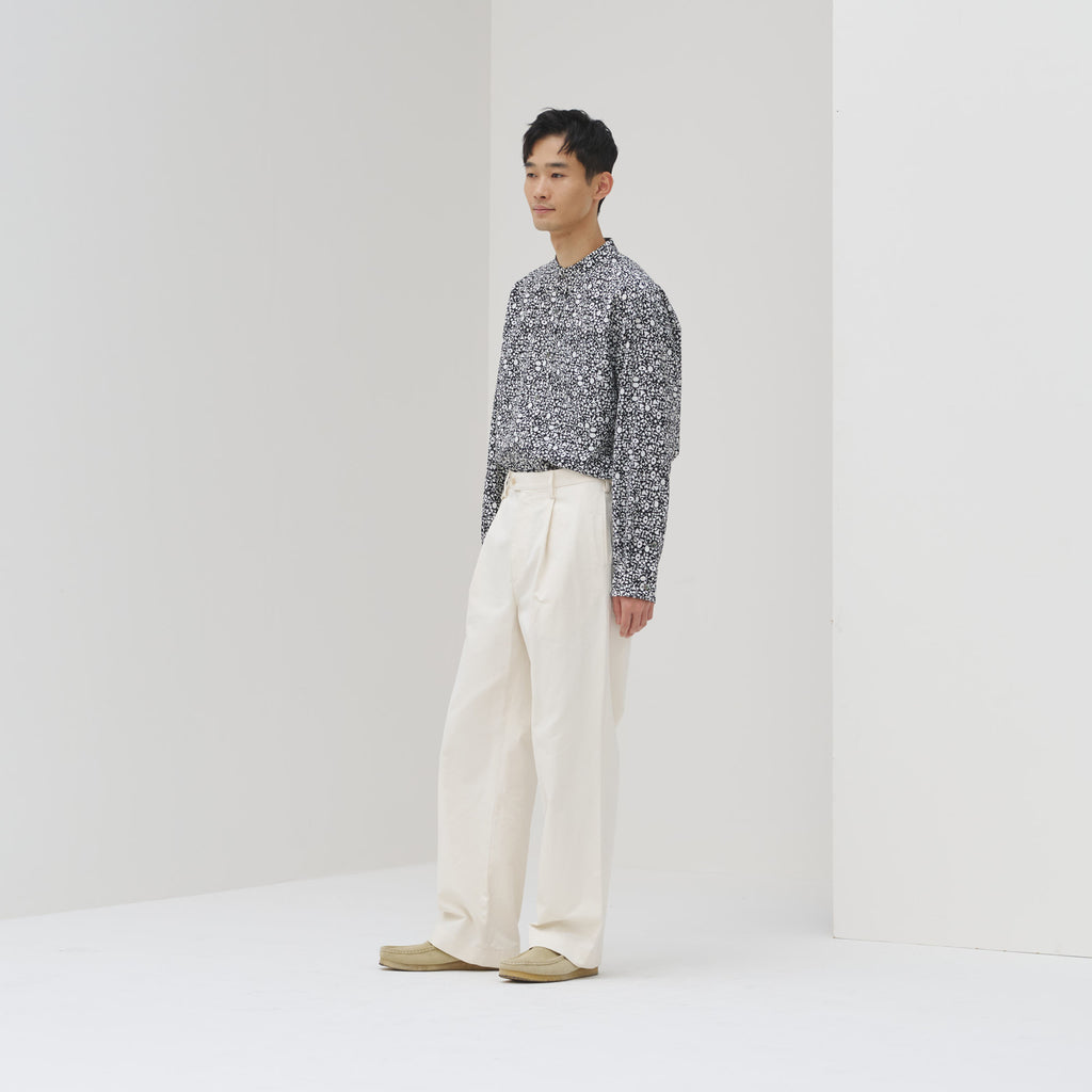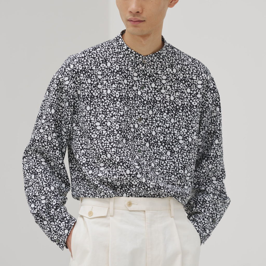 すっきりしたバンドカラーで、スカーフなどの小物を使ったアレンジもしやすい、ベーシックなシャツ。身体のラインを拾わないユニセックスなシルエットで、インナーにニットを着たり、フロントを開けて羽織として着たりなど、幅広いスタイリングが可能です。