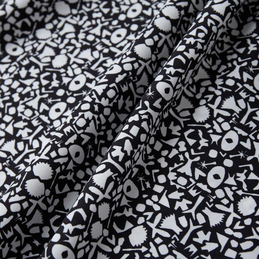 アートそのものをまとうような総柄のエネルギーを活かしつつ、どこか落ち着いた色彩を感じる作品を起用。一枚ではもちろん、ジャケットやニットの襟元から覗かせれば秋冬らしいスタイリングのアクセントに