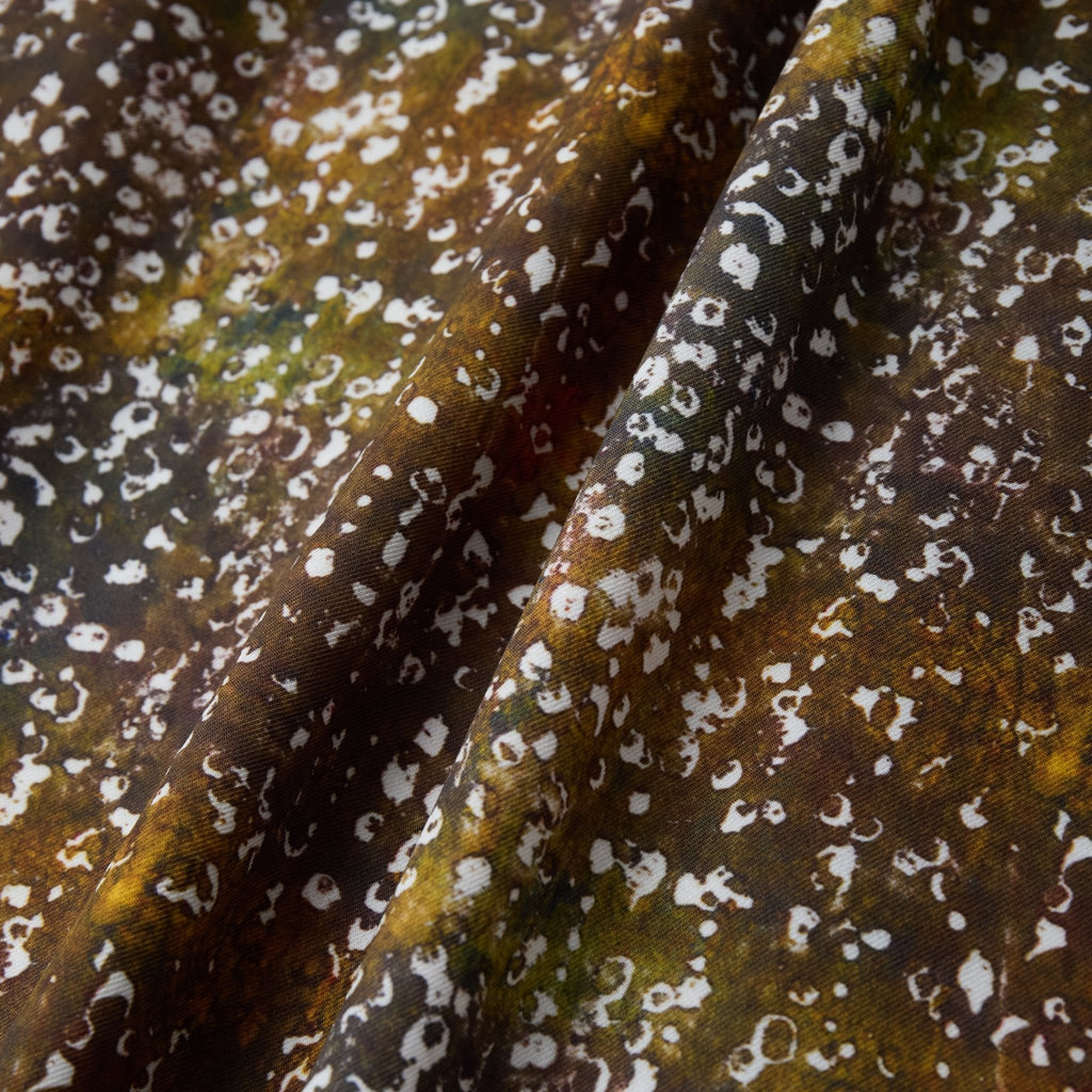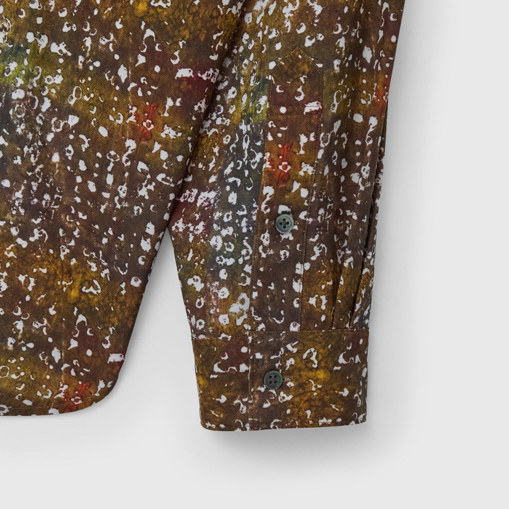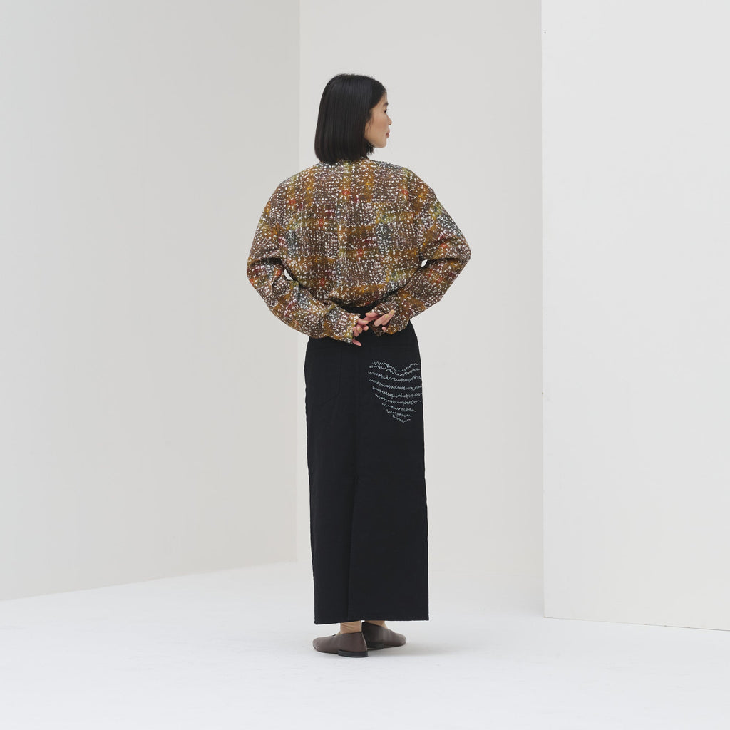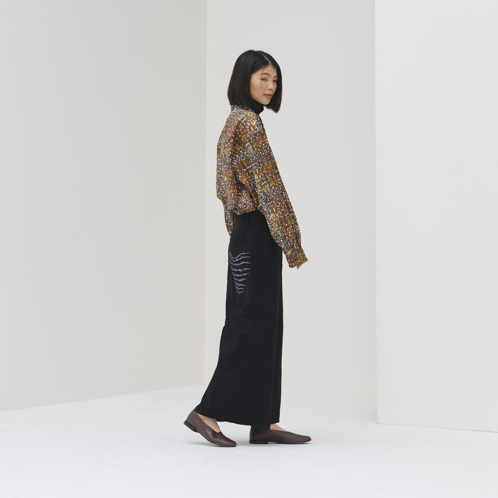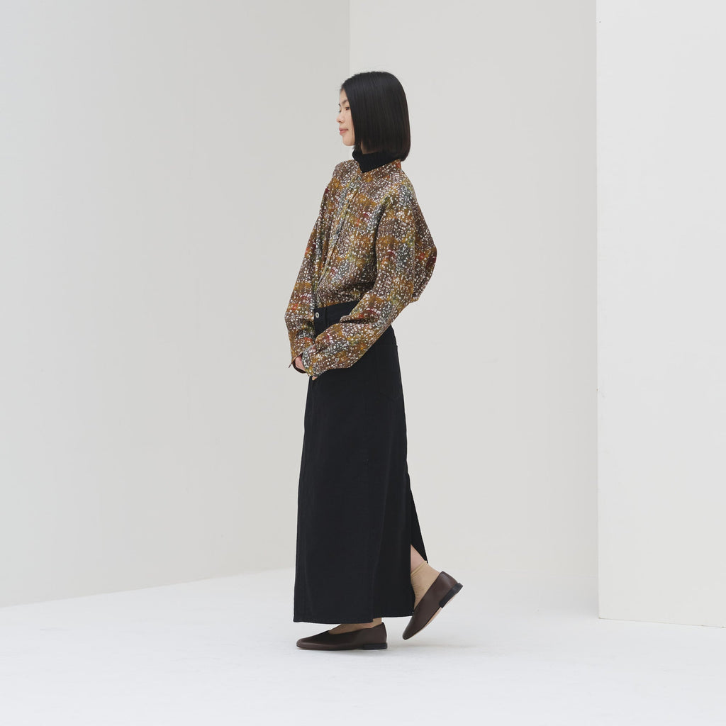 アートそのものをまとうような総柄のエネルギーを活かしつつ、どこか落ち着いた色彩を感じる作品を起用。一枚ではもちろん、ジャケットやニットの襟元から覗かせれば秋冬らしいスタイリングのアクセントに