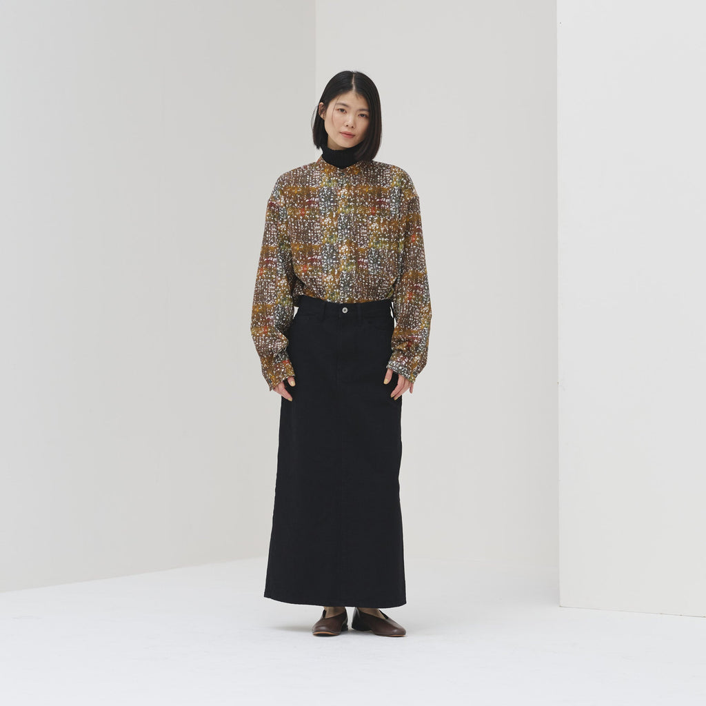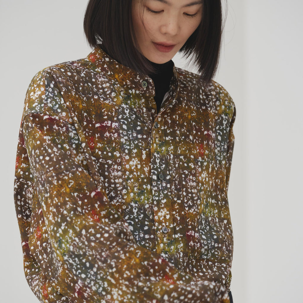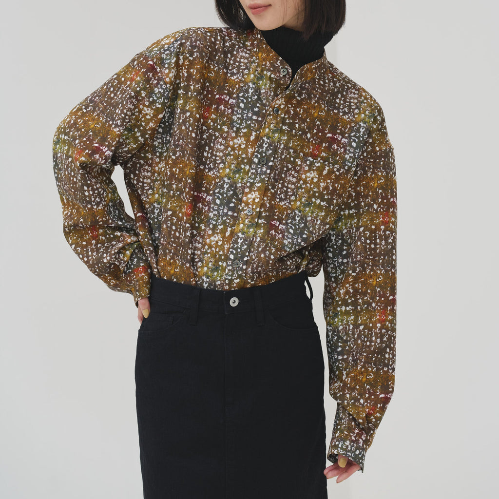 すっきりしたバンドカラーで、スカーフなどの小物を使ったアレンジもしやすい、ベーシックなシャツ。身体のラインを拾わないユニセックスなシルエットで、インナーにニットを着たり、フロントを開けて羽織として着たりなど、幅広いスタイリングが可能です。