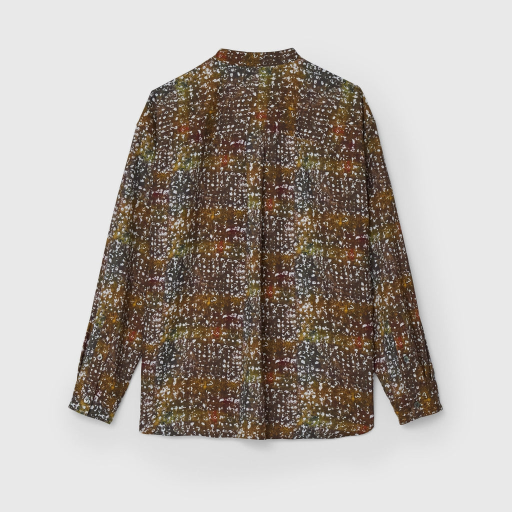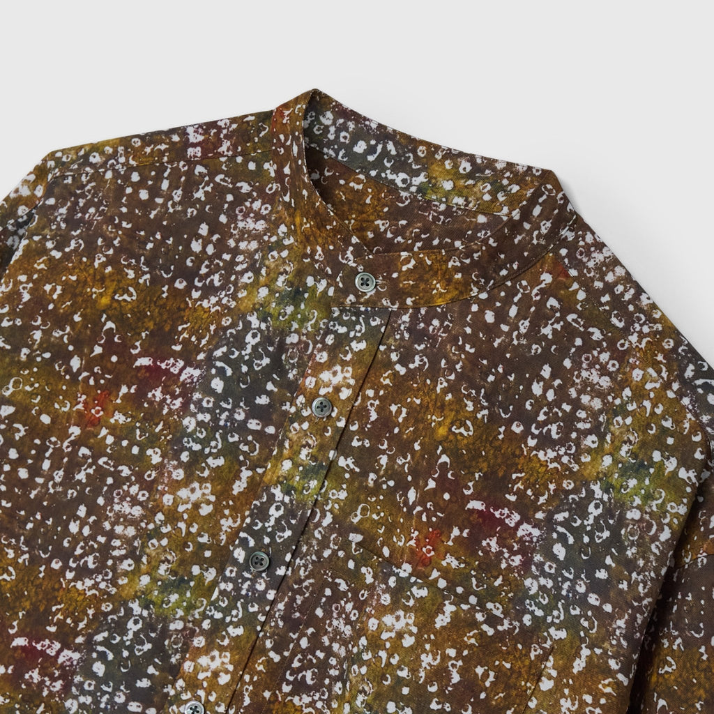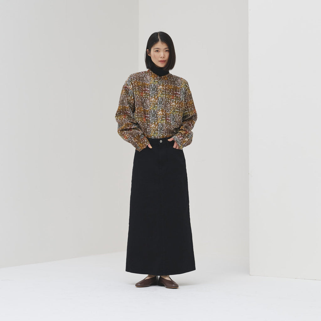 すっきりしたバンドカラーで、スカーフなどの小物を使ったアレンジもしやすい、ベーシックなシャツ。身体のラインを拾わないユニセックスなシルエットで、インナーにニットを着たり、フロントを開けて羽織として着たりなど、幅広いスタイリングが可能です。