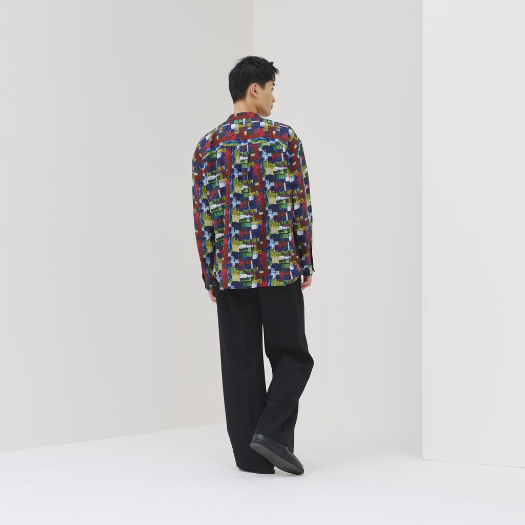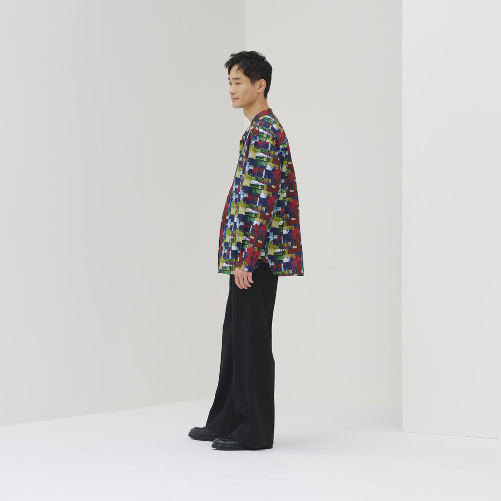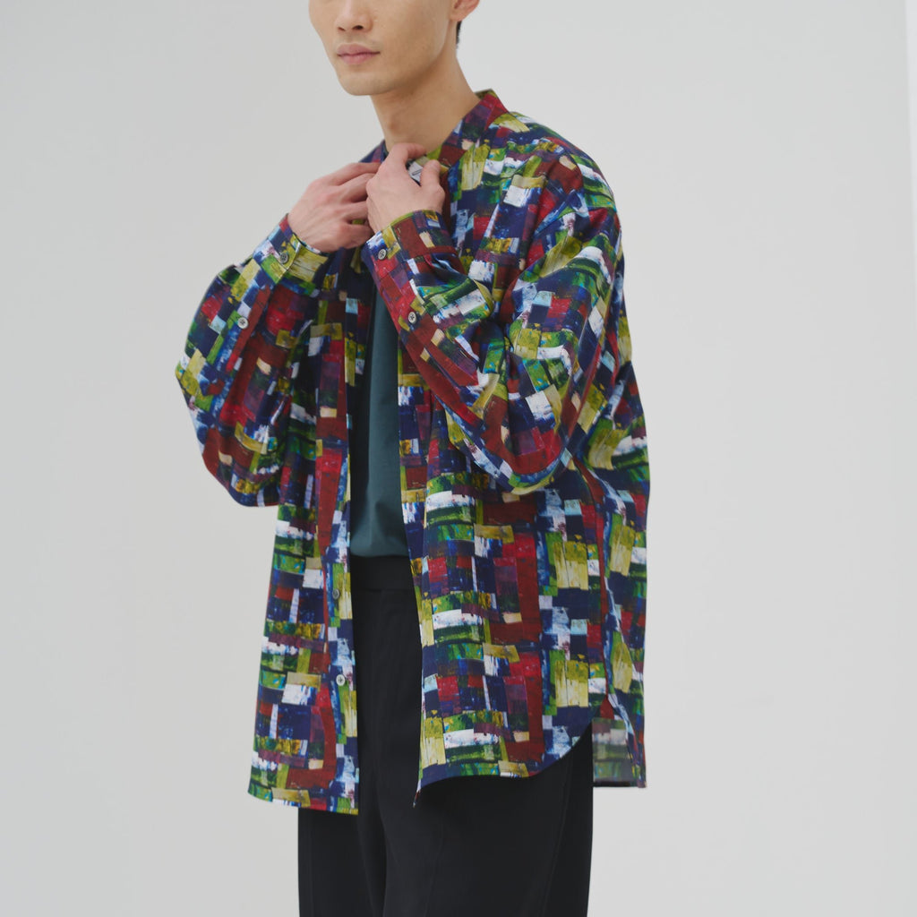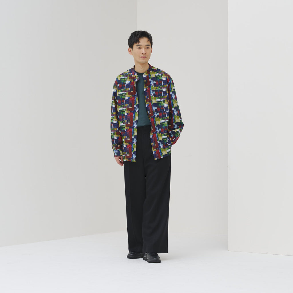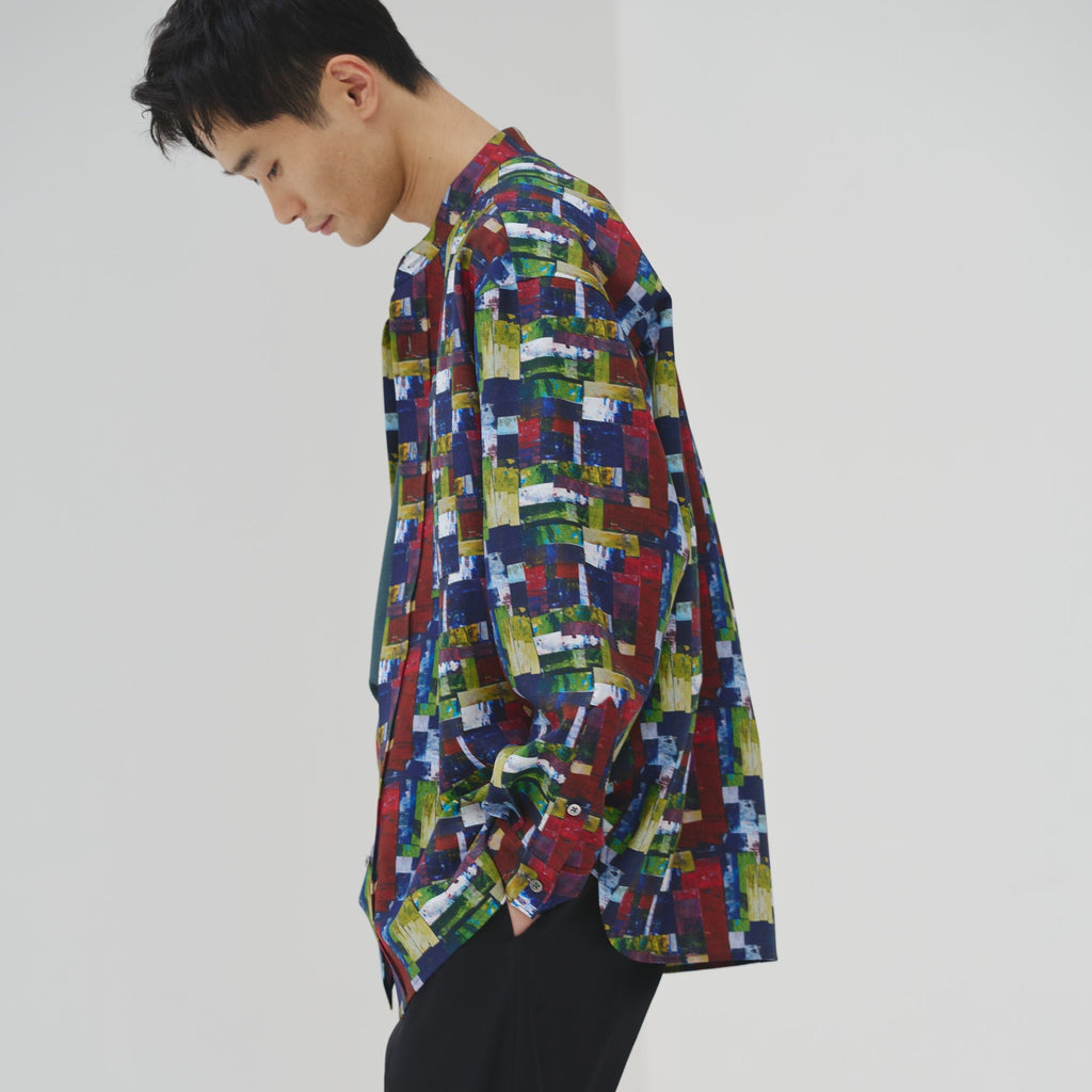 すっきりしたバンドカラーで、スカーフなどの小物を使ったアレンジもしやすい、ベーシックなシャツ。身体のラインを拾わないユニセックスなシルエットで、インナーにニットを着たり、フロントを開けて羽織として着たりなど、幅広いスタイリングが可能です。