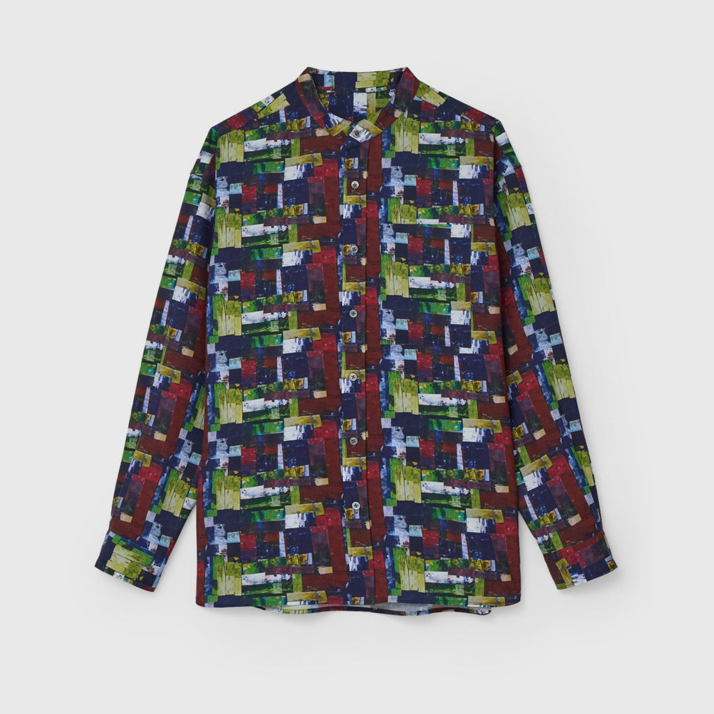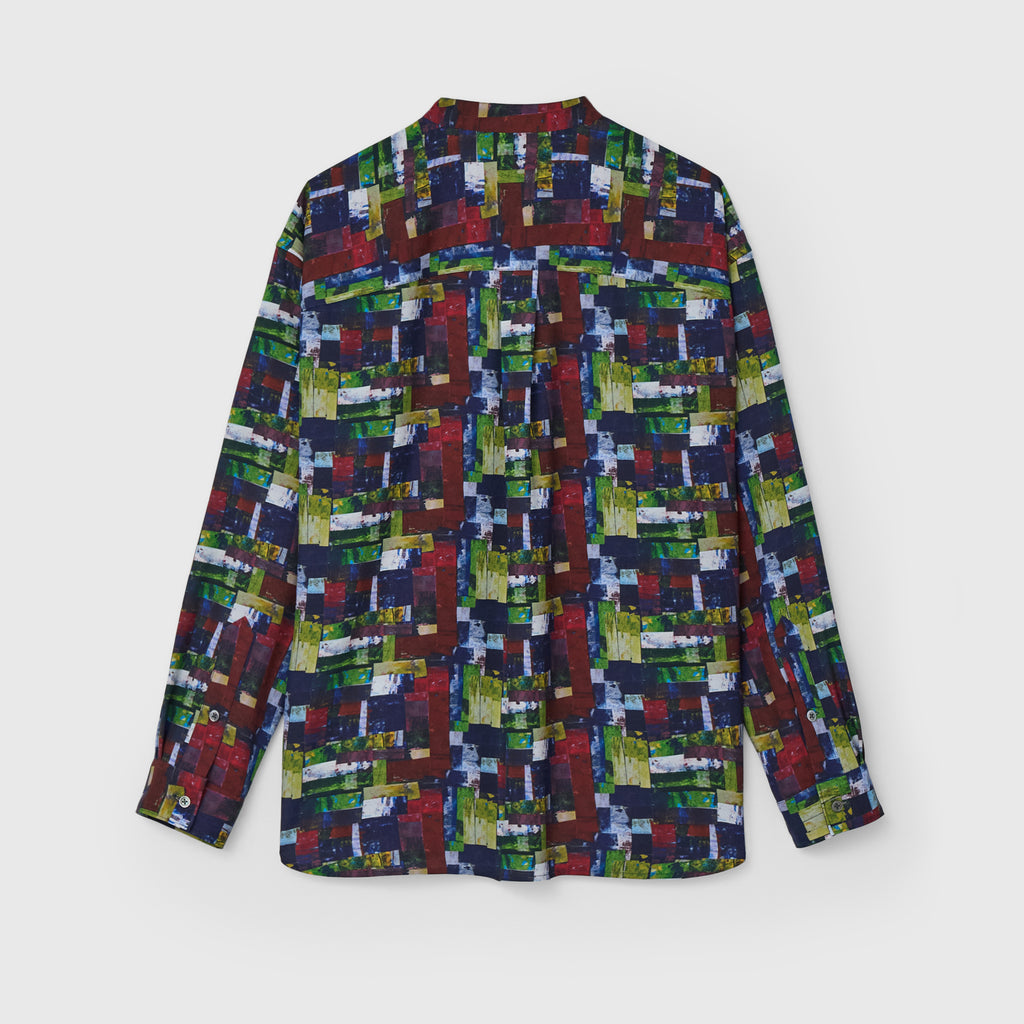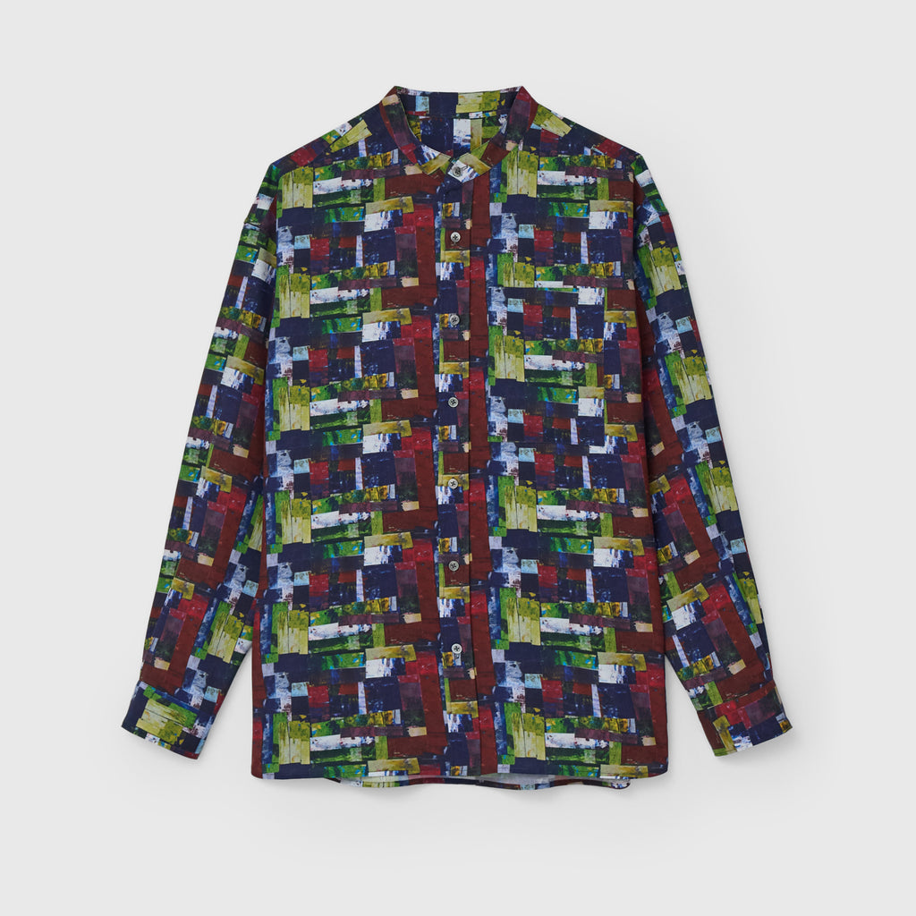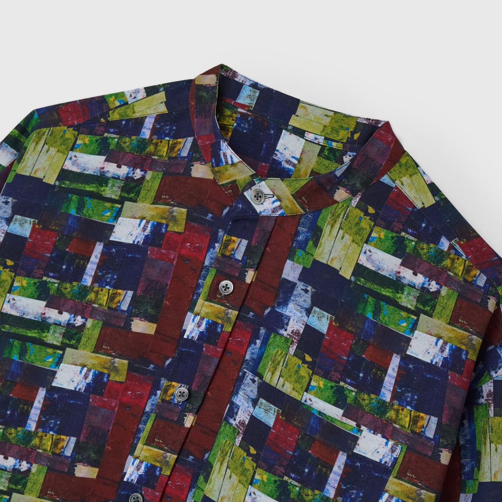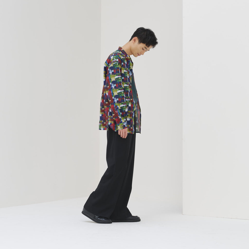 すっきりしたバンドカラーで、スカーフなどの小物を使ったアレンジもしやすい、ベーシックなシャツ。身体のラインを拾わないユニセックスなシルエットで、インナーにニットを着たり、フロントを開けて羽織として着たりなど、幅広いスタイリングが可能です。