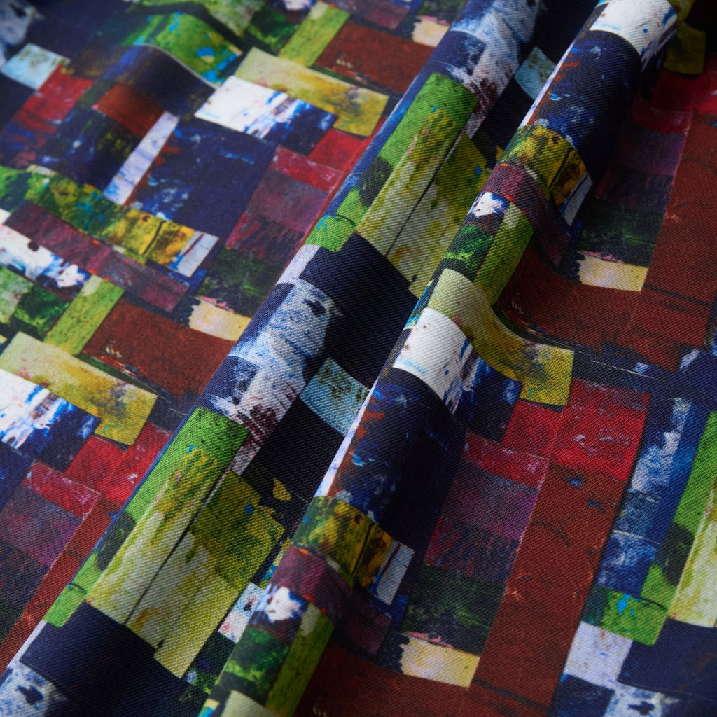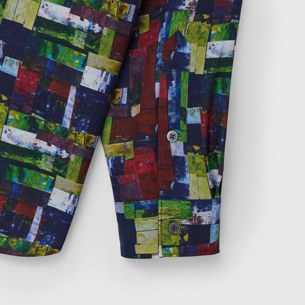 アートそのものをまとうような総柄のエネルギーを活かしつつ、どこか落ち着いた色彩を感じる作品を起用。一枚ではもちろん、ジャケットやニットの襟元から覗かせれば秋冬らしいスタイリングのアクセントに