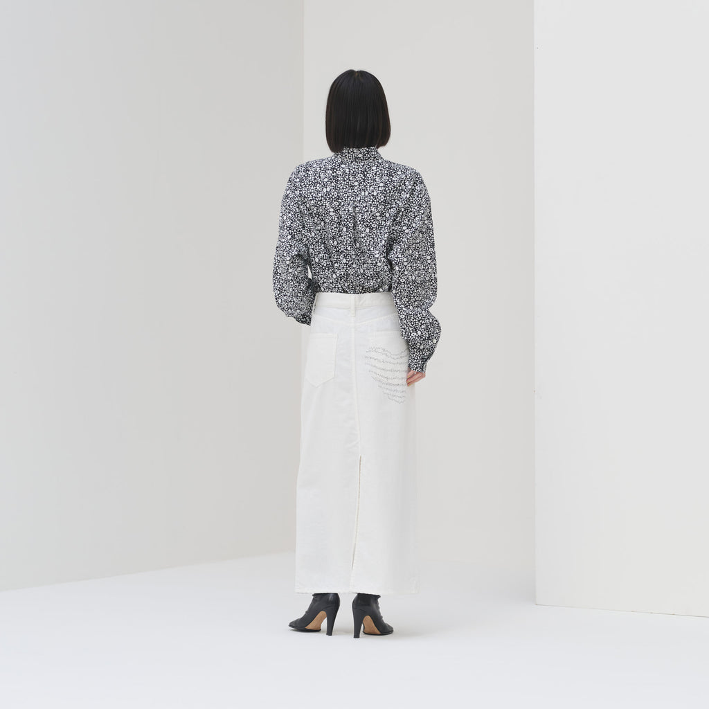 アートそのものをまとうような総柄のエネルギーを活かしつつ、どこか落ち着いた色彩を感じる作品を起用。一枚ではもちろん、ジャケットやニットの襟元から覗かせれば秋冬らしいスタイリングのアクセントに。