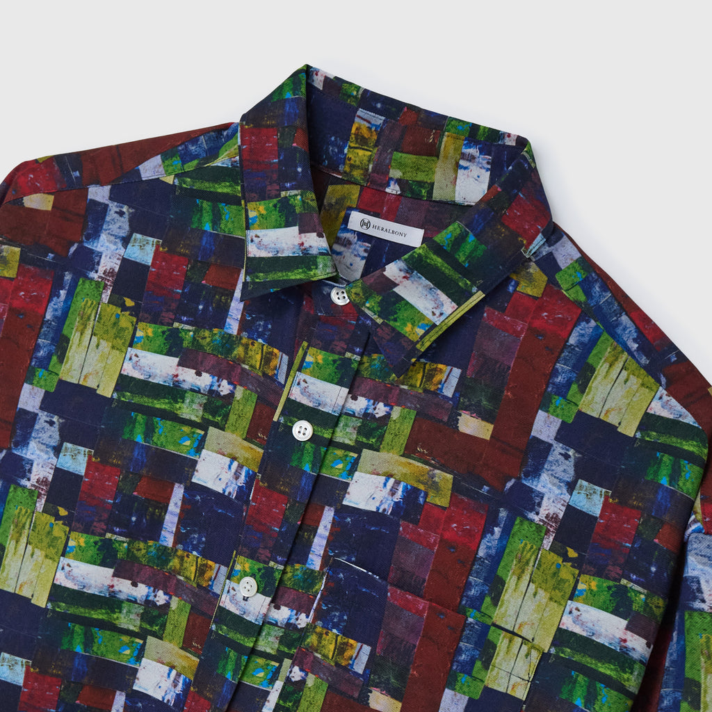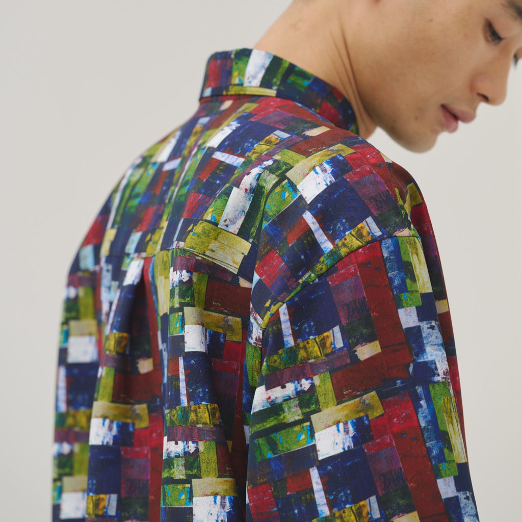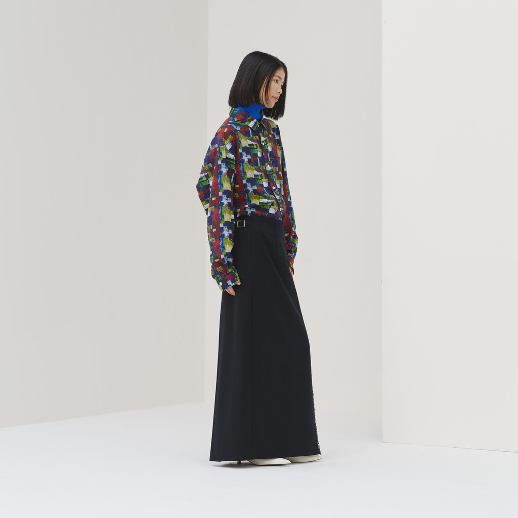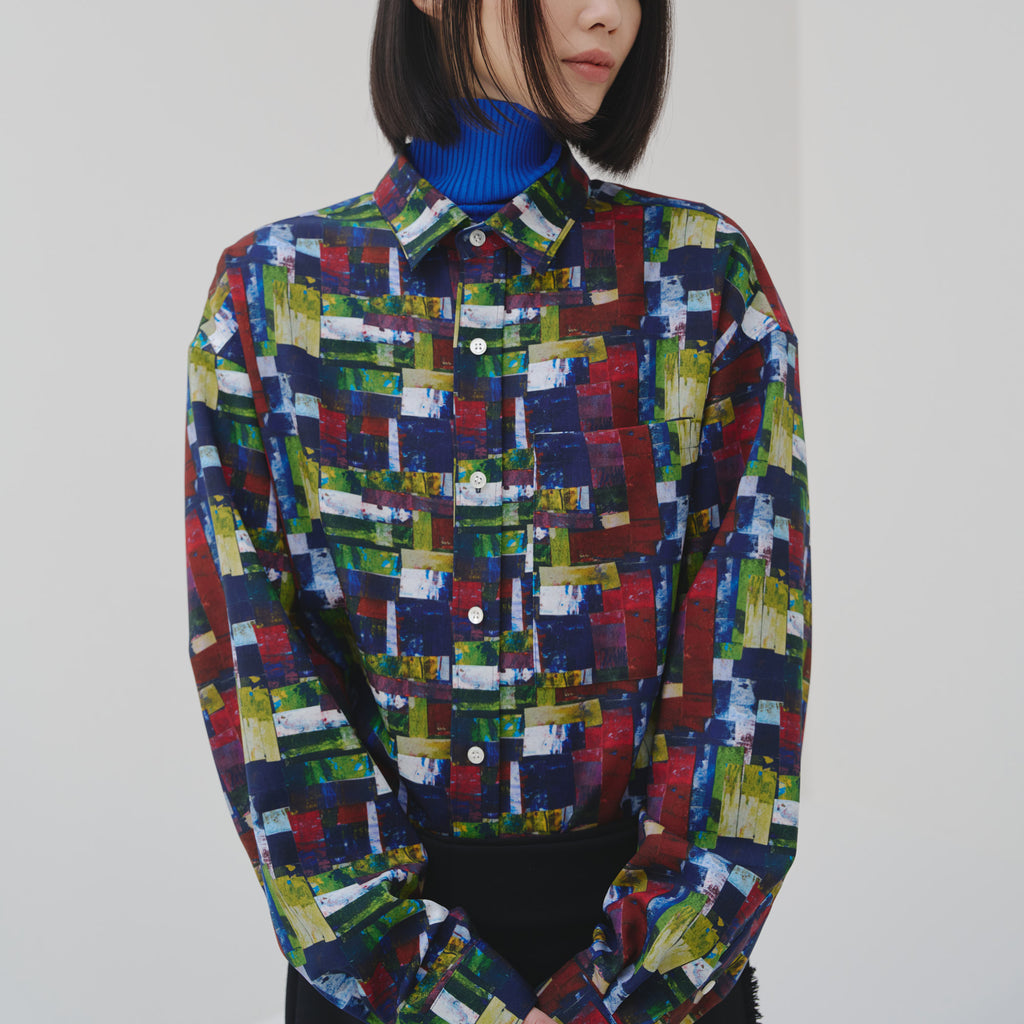 アートそのものをまとうような総柄のエネルギーを活かしつつ、どこか落ち着いた色彩を感じる作品を起用。一枚ではもちろん、ジャケットやニットの襟元から覗かせれば秋冬らしいスタイリングのアクセントに