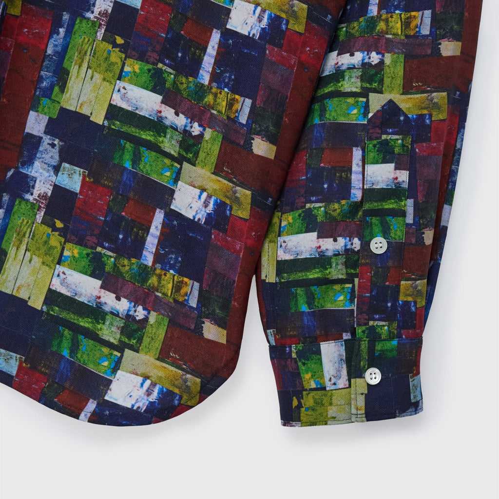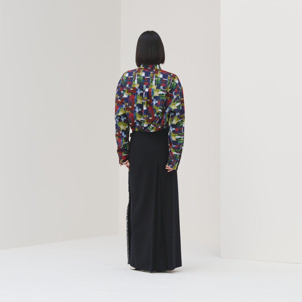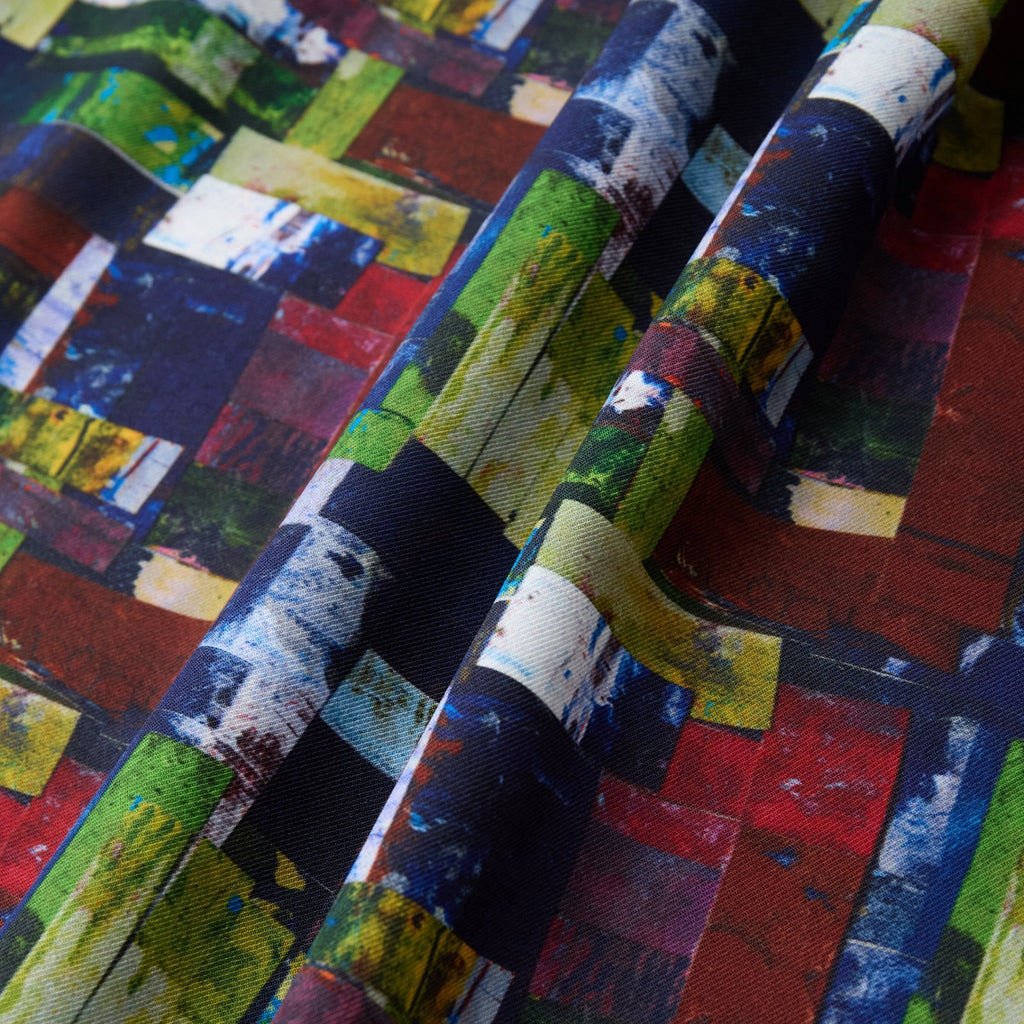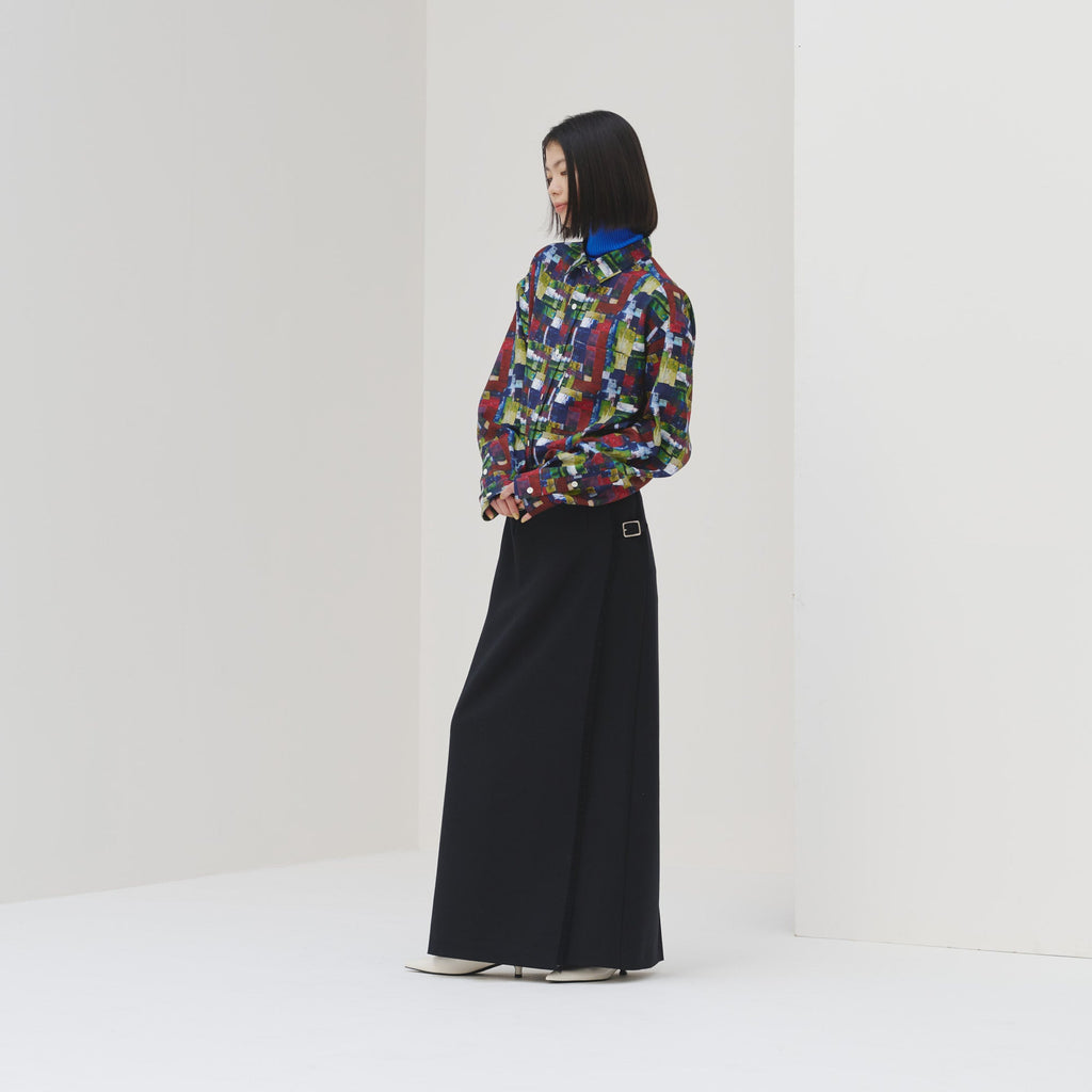 アートそのものをまとうような総柄のエネルギーを活かしつつ、どこか落ち着いた色彩を感じる作品を起用。一枚ではもちろん、ジャケットやニットの襟元から覗かせれば秋冬らしいスタイリングのアクセントに