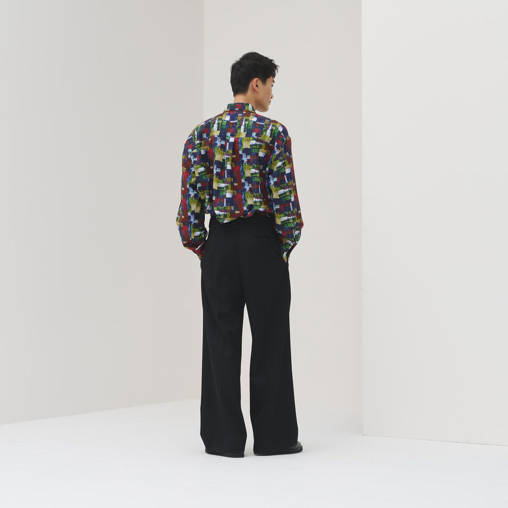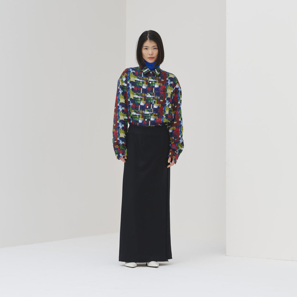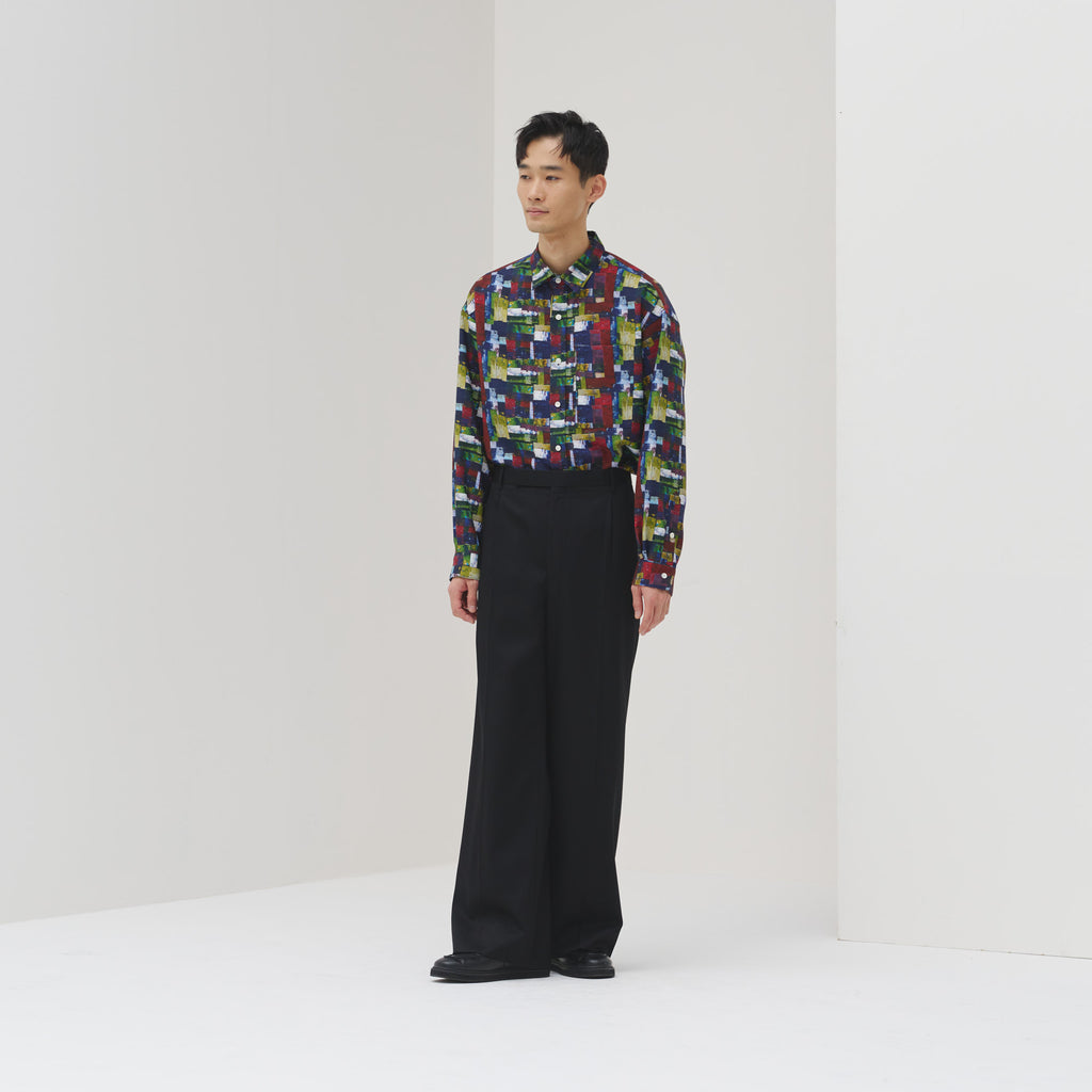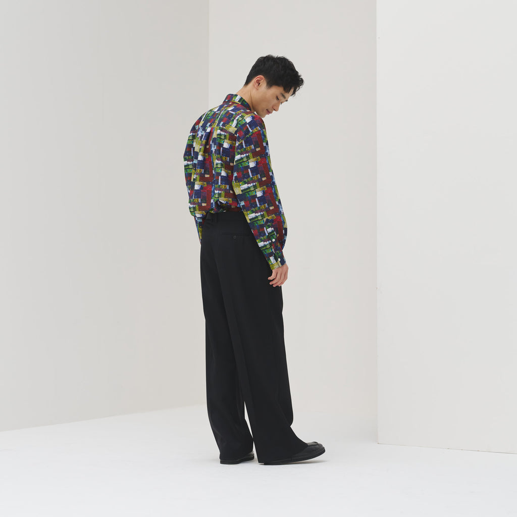 すっきりしたバンドカラーで、スカーフなどの小物を使ったアレンジもしやすい、ベーシックなシャツ。身体のラインを拾わないユニセックスなシルエットで、インナーにニットを着たり、フロントを開けて羽織として着たりなど、幅広いスタイリングが可能です。