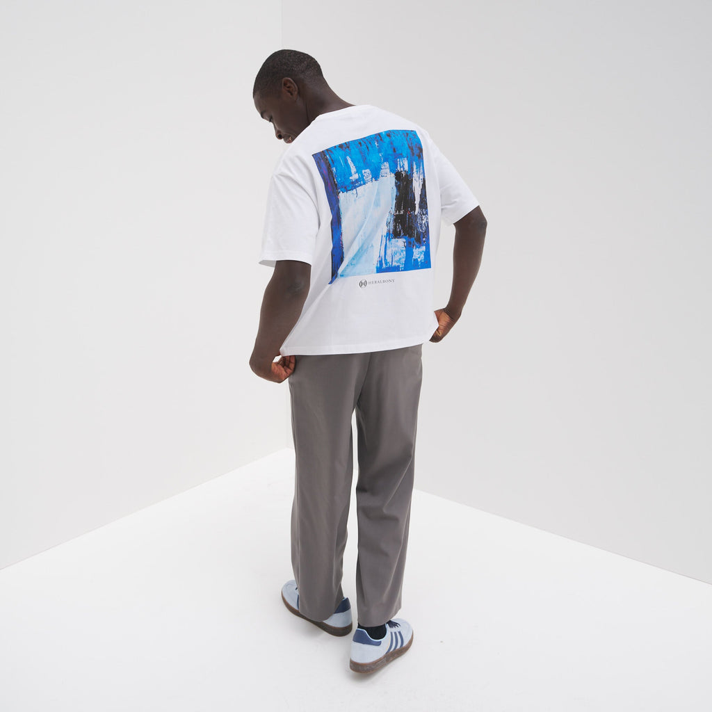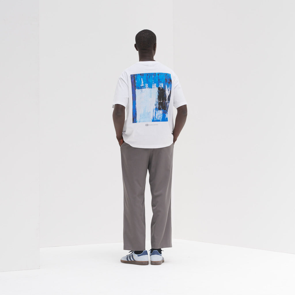 フロントにはプリントを配置せず、バックにのみアートをプリントすることで、どなたでも着やすいシンプルなデザインに仕上げました。