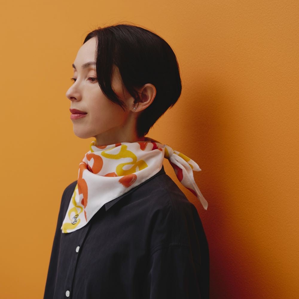 縦55cm×横55cmのサイズ感と素材で、スカーフよりも気軽に身に着けられるバンダナ。首元に巻いてもコンパクトなので、ほどよいアクセントとして活躍します。