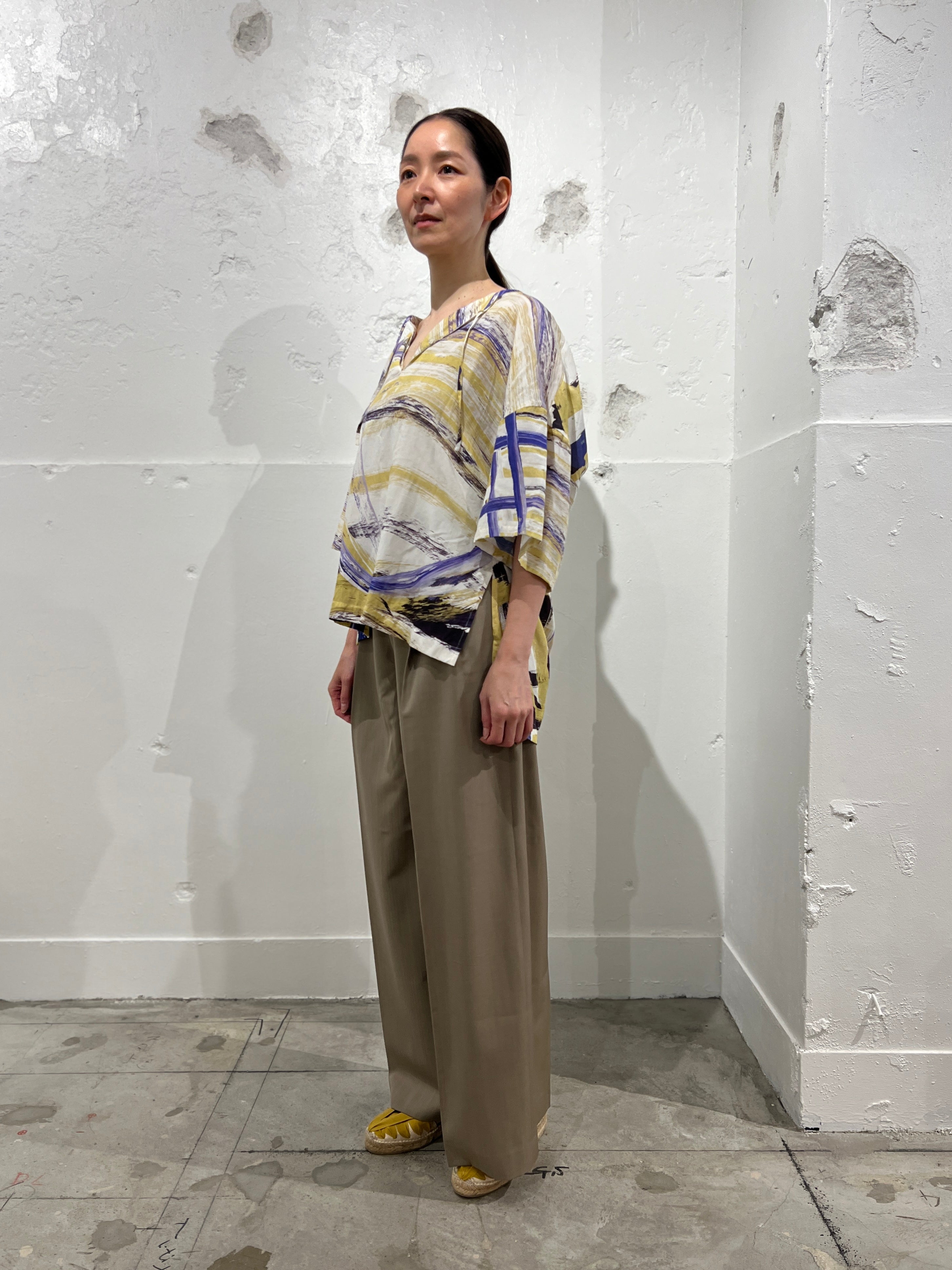 風にアートがそよぐ、ゆったりしたシルエットが魅力のブラウスです。リネン混の柔らかな生地に、躍動感あふれるアートを大胆にプリントしました。同素材・同アートを起用した「リネンショートパンツ」「リネンワイドパンツ」とセットアップもおすすめです。