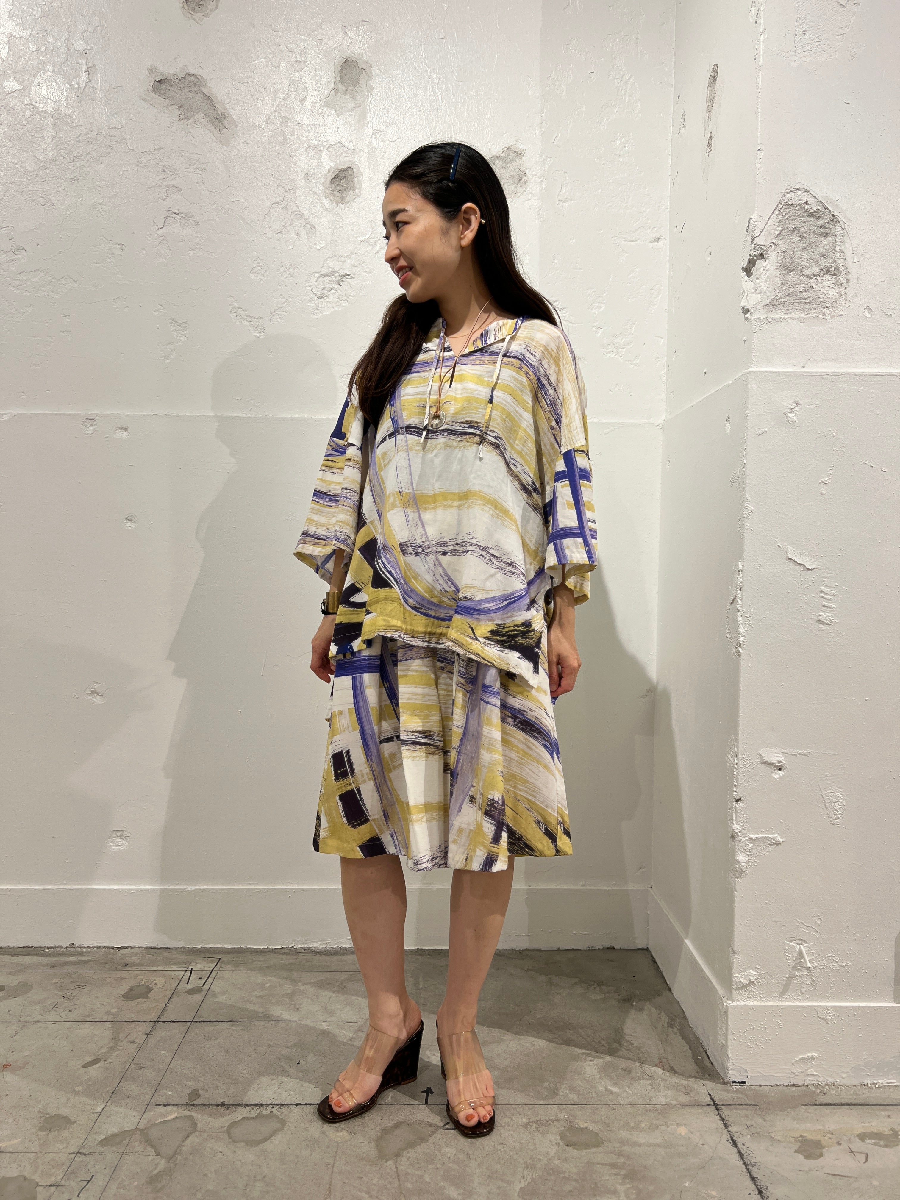 ヒップに軽くかかる丈感で、すっきりしたシルエットのスカートやパンツと好相性です。単品ではもちろん、同素材・同アートを起用した「リネンショートパンツ」「リネンワイドパンツ」とセットアップすれば、洗練された大人のバカンススタイルに。