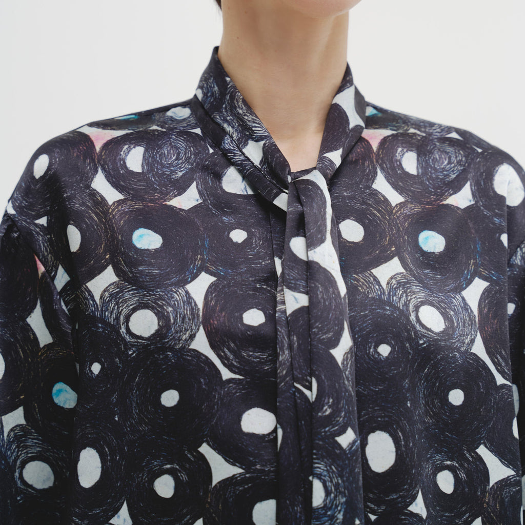 ほのかな光沢を感じるクレープサテンにアートをプリントし、オフィスやオケージョンでも着用できる総柄ブラウスに仕上げました。ハリ感のあるやや肉厚な素材感です。
