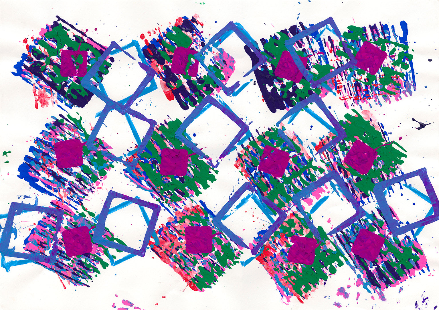 1996年生まれ 滋賀県在住 2015年から『やまなみ工房』に在籍 もともと創作活動に消極的だった彼が、気負いなく作業感覚で取り組める方法のひとつとして、スタンプ押しの活動が始まった。巻いて棒状にしたダンボール紙や紙コップ、ゴム判子等、様々な素材の判子を用いて自分の好きな色を決めて、判子を一つ一つ確実に丁寧に押してゆく。取り組む中で徐々に創作に対する苦手意識から解放され、作品が完成するたびにやりがいや喜び、そして彼の中で創作に対する自信が深まった。 今では内向的な彼が自己表現の一つとして取り組める活動となる。