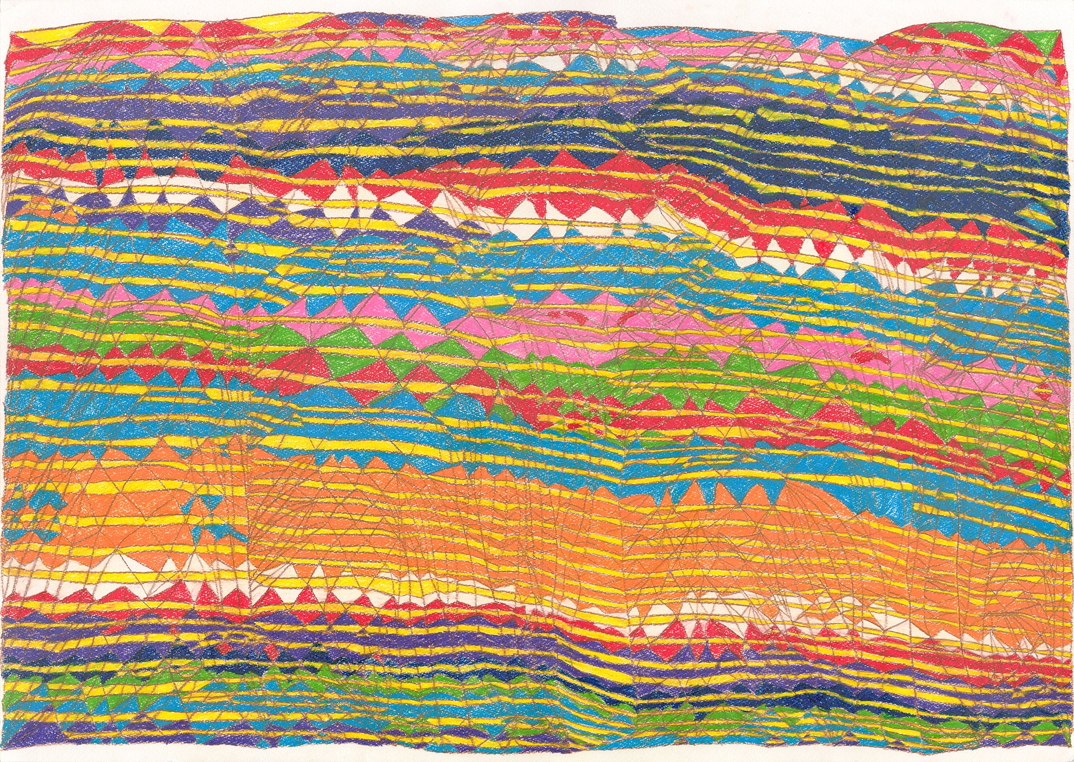1994年生まれ 滋賀県在住 2013年から「やまなみ工房」に在籍 彼女がいつも大切に持ち歩くバッグの中には、大好きなアニメのDVDやCD、本がたくさん詰まっている。その中にある一冊のぬり絵を取り出すと、いつもの作品解説が始まる。 彼女が描く作品のほとんどは「お城」。それは、ぬり絵に描かれた女児向けアニメに登場したお城をイメージして描いているそうだ。 アニメに登場する主人公3人のキャラクターカラーであるピンク、黄色、水色は作品にも反映され3色を主に使用し、三角形や四角形を規則的に重ね合わせ色を塗り積み上げ城は築かれていく。