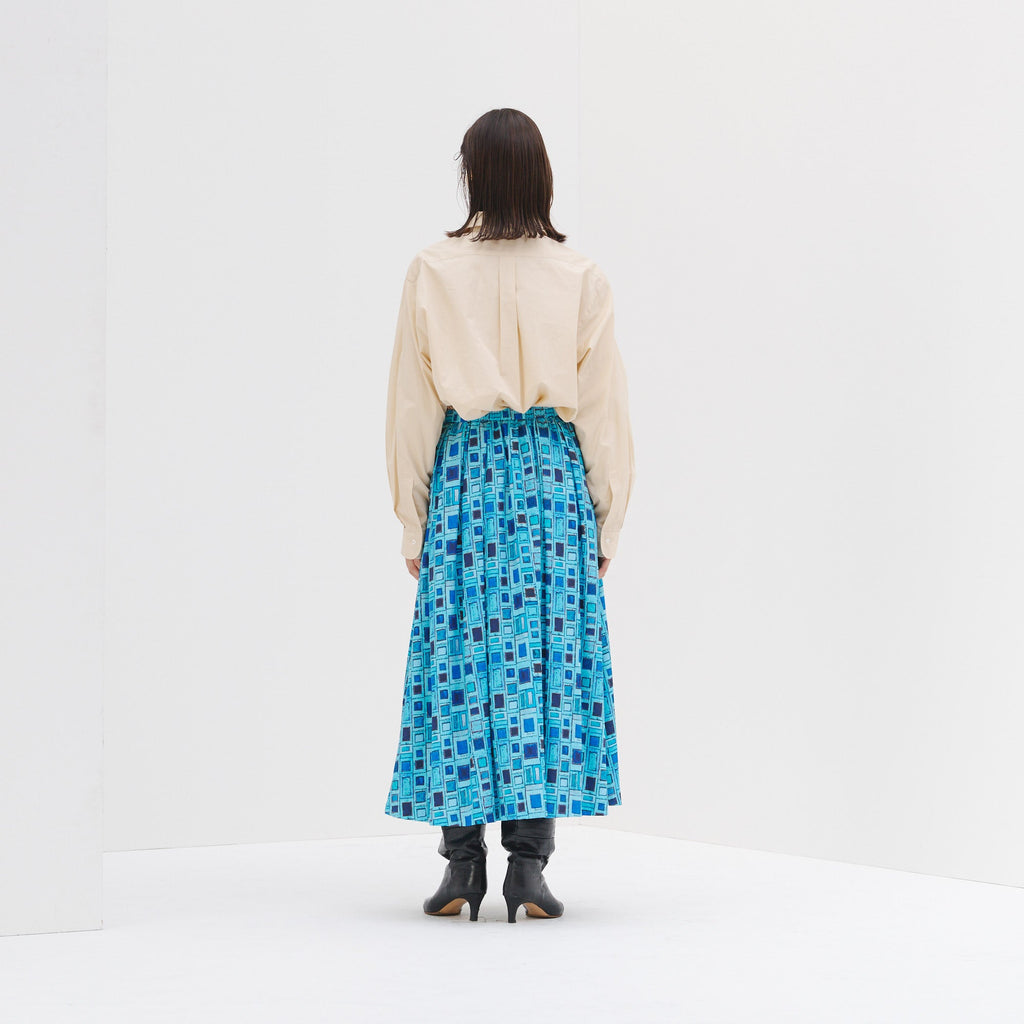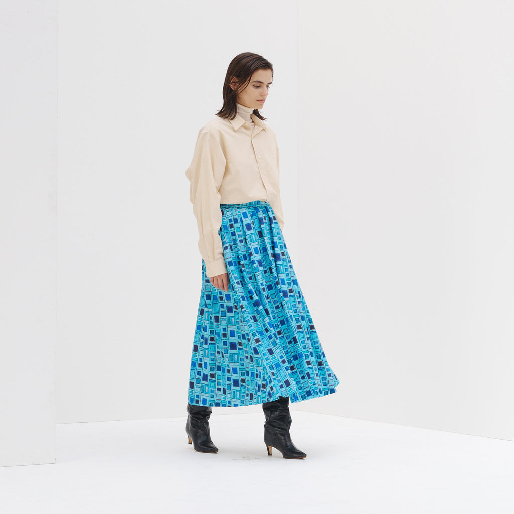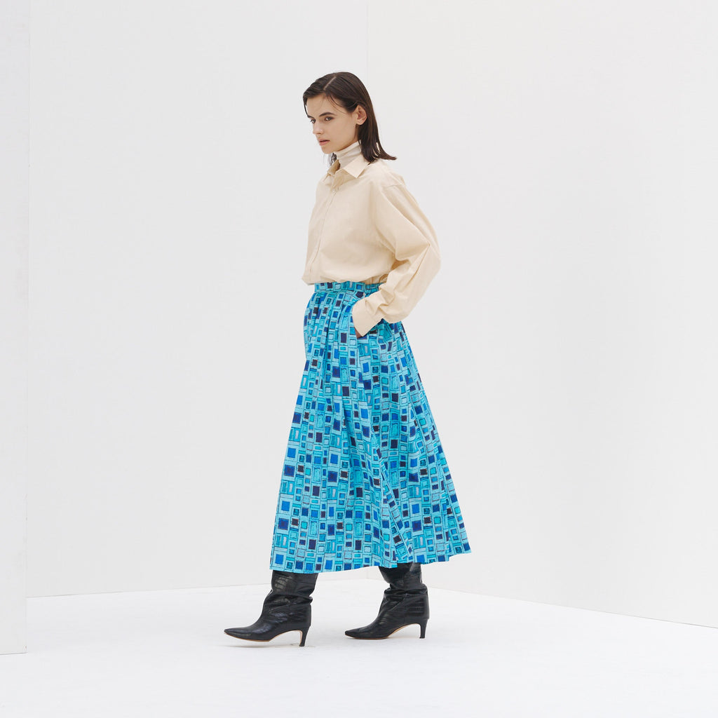 ご好評いただいたフレアスカートが、ハリ感のある生地にアップデートして登場。ランダムタックで軽やかに広がるアートのようなシルエットはそのままに、ウエストゴムで履き心地の良さにもこだわりました。