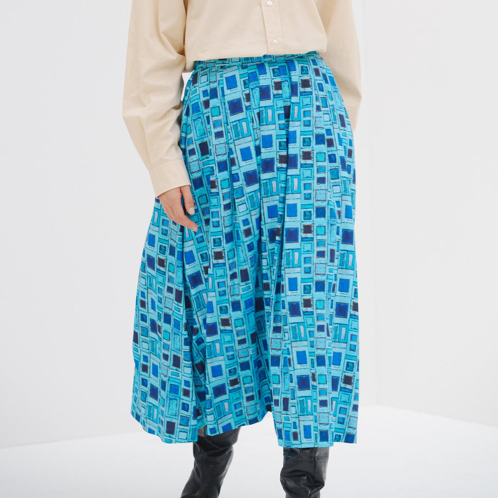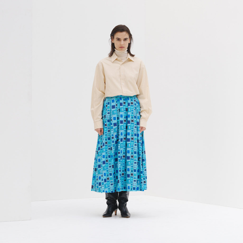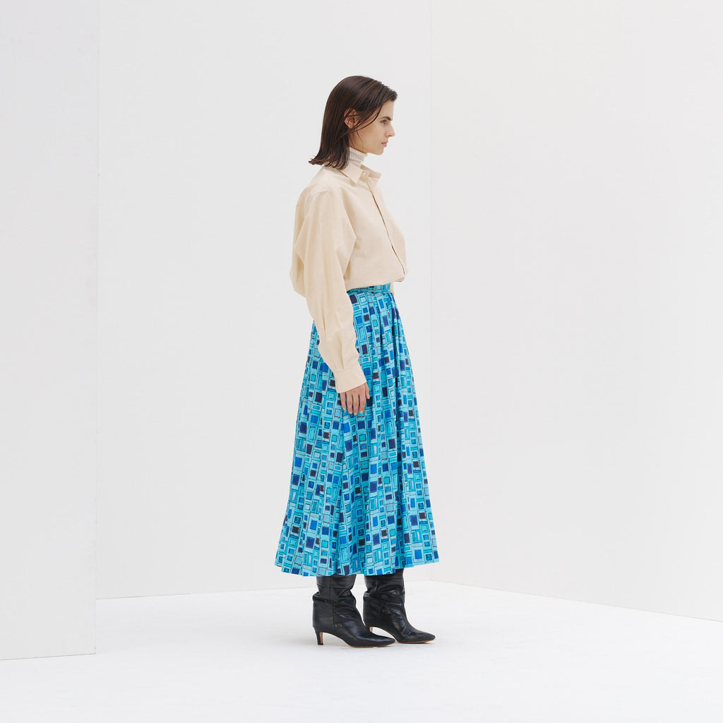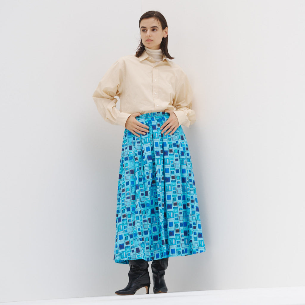 ご好評いただいたフレアスカートが、ハリ感のある生地にアップデートして登場。ランダムタックで軽やかに広がるアートのようなシルエットはそのままに、ウエストゴムで履き心地の良さにもこだわりました。
