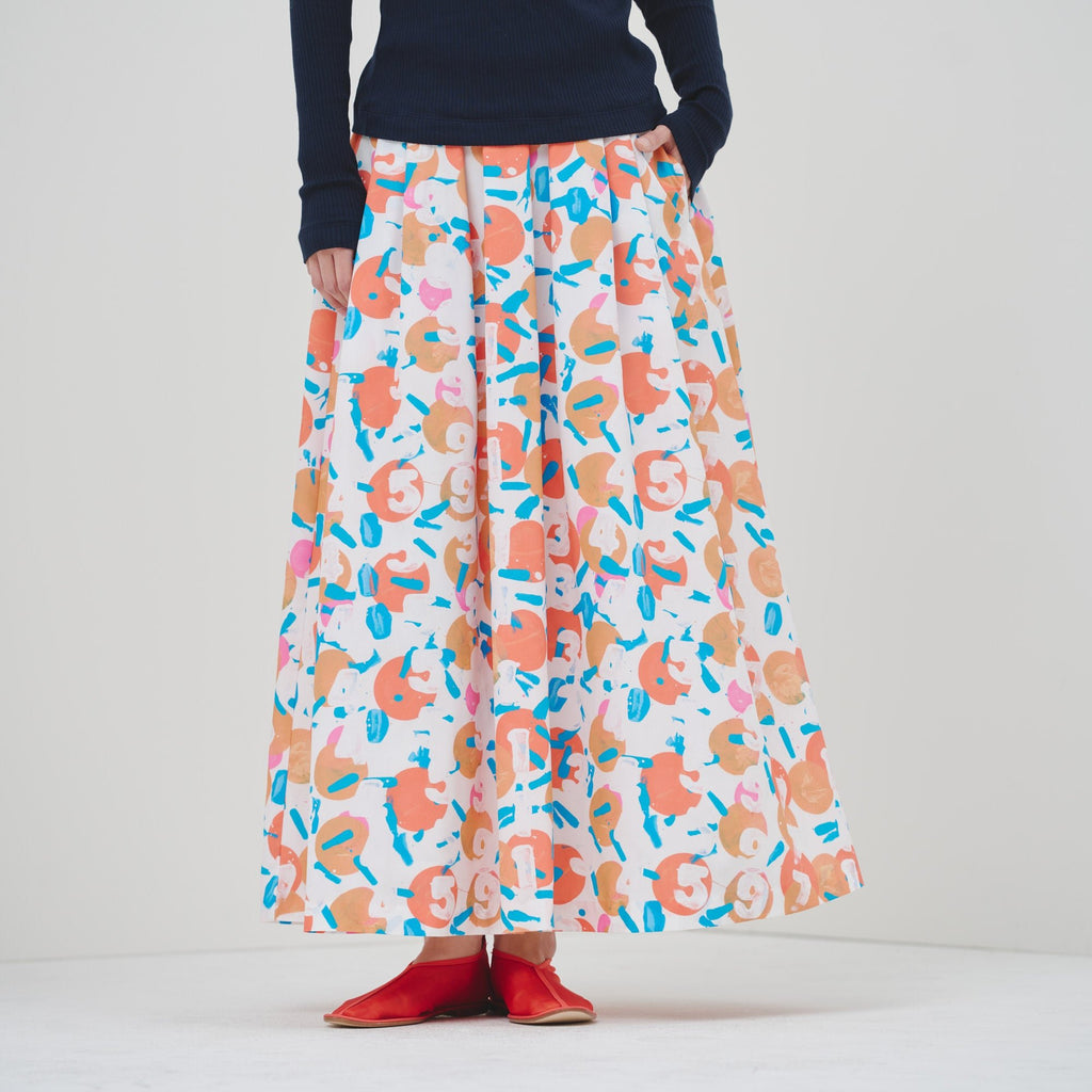 ご好評いただいたフレアスカートが、ハリ感のある生地にアップデートして登場。ランダムタックで軽やかに広がるアートのようなシルエットはそのままに、ウエストゴムで履き心地の良さにもこだわりました。